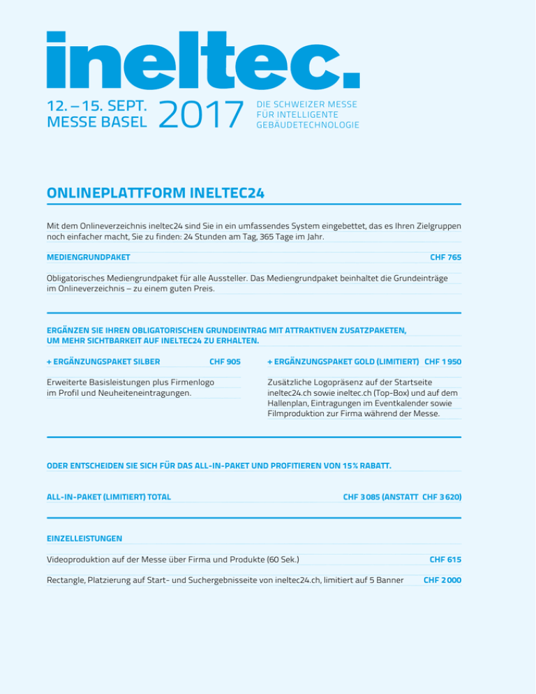 12. – 15. SEPT. MESSE BASEL 2017 DIE SCHWEIZER MESSE FÜR INTELLIGENTE GEBÄUDETECHNOLOGIE ONLINEPLATTFORM INELTEC24 Mit dem Onlineverzeichnis ineltec24 sind Sie in ein umfassendes System eingebettet, das es Ihren Zielgruppen noch einfacher macht, Sie zu finden: 24 Stunden am Tag, 365 Tage im Jahr. MEDIENGRUNDPAKET CHF 765 Obligatorisches Mediengrundpaket für alle Aussteller. Das Mediengrundpaket beinhaltet die Grundeinträge im Onlineverzeichnis – zu einem guten Preis. ERGÄNZEN SIE IHREN OBLIGATORISCHEN GRUNDEINTRAG MIT ATTRAKTIVEN ZUSATZPAKETEN, UM MEHR SICHTBARKEIT AUF INELTEC24 ZU ERHALTEN. + ERGÄNZUNGSPAKET SILBER CHF 905 Erweiterte Basisleistungen plus Firmenlogo im Profil und Neuheiteneintragungen. + ERGÄNZUNGSPAKET GOLD (LIMITIERT) CHF 1 950 Zusätzliche Logopräsenz auf der Startseite ineltec24.ch sowie ineltec.ch (Top-Box) und auf dem Hallenplan, Eintragungen im Eventkalender sowie Filmproduktion zur Firma während der Messe. ODER ENTSCHEIDEN SIE SICH FÜR DAS ALL-IN-PAKET UND PROFITIEREN VON 15 % RABATT. ALL-IN-PAKET (LIMITIERT) TOTAL CHF 3 085 (ANSTATT CHF 3 620) EINZELLEISTUNGEN Videoproduktion auf der Messe über Firma und Produkte (60 Sek.) CHF 615 Rectangle, Platzierung auf Start- und Suchergebnisseite von ineltec24.ch, limitiert auf 5 Banner CHF 2 000 INELTEC 2017 MEDIENGRUNDPAKET OBLIGATORISCH + ERGÄNZUNGSPAKET SILBER + ERGÄNZUNGSPAKET GOLD (LIMITIERT) ALL-IN PAKET (LIMITIERT)* CHF 765 CHF 905 CHF 1 950 CHF 3 620 15 % RABATT Kumulierte Kosten für Aussteller CHF 535 CHF 765 CHF 1 670 CHF 2 715 CHF 3 085 ONLINE- UND MOBILELEISTUNGEN: FIRMENPROFIL Adresse, Telefon/Mobile, Fax, URL, E-Mail, Halle und Stand-Nr. 1 1 Hyperlinks 1 + 3 4 Nomenklatureinträge für Ausstellereintrag (Produktgruppen) 5 + 5 10 Markeneinträge (ohne Logo) 3 + 4 7 Ansprechpartner + Bild + Funktion/Bezeichnung, Kontakt 1 + 3 4 Produkt oder Dienstleistung mit 1000 Zeichen Text deutsch und/oder französisch + Bild + 3 Nomenklatureinträge pro Produkt 1 + 3 4 Neuheitenmarkierung bei einem Produkt ** x x Produktauflistung in Neuheitenbox auf ineltec24-Neuheitenseite x x NEU: Neuheiten in Neuheitenbox auf der ineltec-Messewebsite x x NEU: Liste aller Neuheiten mit Link auf Aussteller- und Produkteintrag x x Firmenprofil mit max. 1 000 Zeichen Text deutsch und/oder französisch x x Videolink im Eintrag (Link zum Firmenvideo auf YouTube/Vimeo) x x Firmenlogo für Ausstellereintrag x ONLINE- UND MOBILELEISTUNGEN: NEUHEITEN ONLINE- UND MOBILELEISTUNGEN: ERWEITERTES FIRMENPROFIL x x Firmenlogo in Logo-Top-Box auf ineltec24-Startseite x x NEU: Firmenlogo in Logo-Top-Box auf der ineltec-Messewebsite x x Firmenlogo im Hallenplan auf ineltec24 x x Exklusiver Suchbegriff (Top-Keywords ausgenommen) x x NEU: 2 Events während der Messe auf ineltec24-Veranstaltungsseite eintragen x x Videoproduktion auf der Messe über Firma und Produkte (60 Sek.) x x NEU: Videopromotion über ineltec-Youtube-Channel x PRINTLEISTUNGEN Pocket Guide, der im Eingangsbereich der Messe aufgelegt wird: Ausstellerverzeichnis (A–Z) mit Firmenname und Halle/Stand 1 1 Pocket Guide, der im Eingangsbereich der Messe aufgelegt wird: Firmenlogo im Hallenplan x x Infosäulen auf der Messe: Firmenlogo im Hallenplan x x * All-in-Paket inkl. Mediengrundpaket sowie Ergänzungspaket Silber und Gold ** Hinweis zu Neuheitenmarkierung: Bitte beachten Sie, dass nur Produkte als Neuheit gekennzeichnet werden dürfen, die seit der ineltec 2015 neu lanciert wurden. Die Markierung wird 6 Monate nach der Messe entfernt oder Sie nehmen die Möglichkeit wahr, eine aktuelle Neuheit von der Redaktion eintragen zu lassen. MCH Messe Schweiz (Basel) AG | 4005 Basel, Schweiz | T +41 58 200 20 20 | F +41 58 206 21 89 | info@ineltec.ch | ineltec.ch