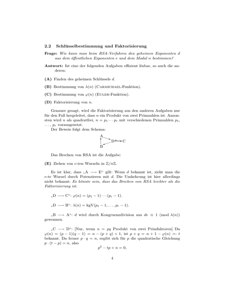 2.2 Schlüsselbestimmung und Faktorisierung Frage: Wie kann man beim RSA-Verfahren den geheimen Exponenten d aus dem öffentlichen Exponenten e und dem Modul n bestimmen? Antwort: Ist eine der folgenden Aufgaben effizient lösbar, so auch die anderen: (A) Finden des geheimen Schlüssels d. (B) Bestimmung von λ(n) (Carmichael-Funktion). (C) Bestimmung von ϕ(n) (Euler-Funktion). (D) Faktorisierung von n. Genauer gesagt, wird die Faktorisierung aus den anderen Aufgaben nur für den Fall hergeleitet, dass n ein Produkt von zwei Primzahlen ist. Ansonsten wird n als quadratfrei, n = p1 · · · pr mit verschiedenen Primzahlen p1 , . . . , pr vorausgesetzt. Der Beweis folgt dem Schema: AP q P 6 D -C ) B Das Brechen von RSA ist die Aufgabe: (E) Ziehen von e-ten Wurzeln in Z/nZ. Es ist klar, dass A −→ E“ gilt: Wenn d bekannt ist, zieht man die ” e-te Wurzel durch Potenzieren mit d. Die Umkehrung ist hier allerdings nicht bekannt: Es könnte sein, dass das Brechen von RSA leichter als die Faktorisierung ist. D −→ C“: ϕ(n) = (p1 − 1) · · · (pr − 1). ” D −→ B“: λ(n) = kgV(p1 − 1, . . . , pr − 1). ” B −→ A“: d wird durch Kongruenzdivision aus de ≡ 1 (mod λ(n)) ” gewonnen. C −→ D“: [Nur, wenn n = pq Produkt von zwei Primfaktoren] Da ” ϕ(n) = (p − 1)(q − 1) = n − (p + q) + 1, ist p + q = n + 1 − ϕ(n) =: t bekannt. Da ferner p · q = n, ergibt sich für p die quadratische Gleichung p · (t − p) = n, also p2 − tp + n = 0, 4 mit der Lösung p= p 1 · (t + t2 − 4n), 2 q = t − p. Ist n Produkt von mehr als zwei Primfaktoren, so ist ϕ(n) die alternierende Summe der elementarsymmetrischen Funktionen der Primfaktoren, aber damit ist nicht ohne weiteres etwas anzufangen. A −→ D“ ist wesentlich komplizierter zu zeigen; es wird auch nur ein ” probabilistischer Algorithmus konstruiert. Vorbemerkungen Wie kann eine zufällig gewählte Restklasse w ∈ Z/nZ bei der Faktorisierung von n helfen? 1. Findet man ein w ∈ [1 . . . n−1] mit ggT(w, n) > 1, so ist n faktorisiert, da ggT(w, n) ein echter Teiler von n ist. 2. Findet man ein w ∈ [2 . . . n − 2] mit w2 ≡ 1 (mod n) (also eine nichttriviale Quadratwurzel aus 1 in Z/nZ), so ist n ebenfalls faktorisiert: Da n|w2 − 1 = (w + 1)(w − 1) und n - w ± 1, ist ggT(n, w + 1) > 1, also n nach 1. faktorisiert. Sei also jetzt ein Paar (d, e) von zusammengehörigen Exponenten bekannt. Dann ist auch u := ed − 1 = k · λ(n) bekannt (k und λ(n) allerdings nicht). Da λ(n) gerade ist, ist u = r · 2s mit s ≥ 1 und r ungerade. Wählt man irgendein w ∈ [1 . . . n − 1], so gibt es zwei Möglichkeiten: • ggT(w, n) > 1 – dann ist n faktorisiert. s • ggT(w, n) = 1 – dann ist wr2 ≡ 1 (mod n). Im zweiten Fall findet man effizient das minimale t ≥ 0 mit t wr2 ≡ 1 (mod n). Es gibt wieder zwei Fälle: • t = 0 – Pech gehabt. • t > 0 – dann ist wr2 t−1 eine Quadratwurzel 6= 1 aus 1 in Z/nZ. 5 Im zweiten Fall wird unterschieden: • wr2 t−1 • wr2 t−1 ≡ −1 (mod n) – Pech gehabt. ≡ / −1 (mod n) – dann ist n nach Vorbemerkung 2 faktorisiert. Insgesamt haben wir bei diesem Verfahren nach beliebiger Wahl von w ∈ [1 . . . n − 1] vier Ausgänge, zwei, bei denen n faktorisiert wird, und zwei, bei denen dies nicht der Fall ist. Die letzteren werden mit (En,u (w)/I) (En,u (w)/II) w wr ≡ 1 r2t ≡ −1 (mod n) und (mod n) für ein t mit 0 ≤ t < s bezeichnet. Insgesamt ergibt sich die Baumstruktur: w ∈ [1 . . . n − 1] −→ ggT(w, n) > 1 −→ n faktorisiert.3 w ∈ Mn −→ wr ≡ 1 (mod n) −→ (En,u (w)/I.)3 w r≡ / 1 (mod n) −→ t wr2 ≡ −1 (mod n) −→ (En,u (w)/II.)3 t wr2 ≡ / −1 (mod n) −→ n faktorisiert.3 Wir können also n mit hoher Wahrscheinlichkeit“ faktorisieren, wenn es ” nur wenige“ solcher schlechten“ Zahlen mit (En,u (w)/I,II) gibt. Wie viele ” ” es sind, wird im nächsten Abschnitt untersucht. 6