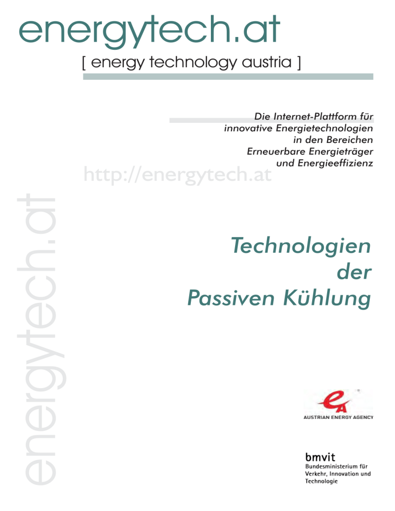 energytech.at [ energy technology austria ] Die Internet-Plattform für innovative Energietechnologien in den Bereichen Erneuerbare Energieträger und Energieeffizienz energytech.at http://energytech.at Technologien der Passiven Kühlung 1 Übersicht.................................................................................................................................1 2 Die Technologien in Detail.....................................................................................................2 2.1 2.1.1 2.1.2 2.1.3 2.2 2.3 2.3.1 2.3.2 2.3.3 2.3.4 Bautechnische Maßnahmen ............................................................................................... 2 Isolierung ............................................................................................................................... 2 Verschattung ......................................................................................................................... 2 Wirksame thermische Masse ................................................................................................ 4 Interne Wärmelasten ........................................................................................................... 5 Passive und hybride Kühltechnologien ............................................................................ 6 Nachtlüftung .......................................................................................................................... 6 Luft-Erdwärmetauscher (L-EWT) .......................................................................................... 8 Erdwärmesonden und Energiepfähle .................................................................................... 9 Offene Systeme mit Grund- oder Seewasser...................................................................... 11 3 Weitere Information..............................................................................................................13 4 Zitierte Quellen .....................................................................................................................13 Übersicht 1 Übersicht Unter passiver Kühlung werden streng genommen bauliche Vorkehrungen verstanden, welche ohne zusätzlichen Energieaufwand die Überwärmung von Gebäuden verhindern, z.B.: Außen liegender Sonnenschutz Sommerlicher Wärmeschutz durch ausreichende Isolierung, vor allem des Daches Gezielte natürliche Belüftung (z.B. Nacht/-Taglüftung,...) Verdampfungskühlung durch Wasserflächen, Brunnen, Begrünung im Gebäudeumfeld oder im Innenraum Im weiteren Sinne können zur passiven Kühlung auch haustechnische Installationen gezählt werden, die es erlauben „natürliche Kältesenken (kühles Erdreich, kalte Nachtluft, Strahlungskälte,...) gezielt zu nutzen und somit Wärme abzuführen und Speichereffekte zu erzielen“ (Zimmermann, 2003). Diese Systeme erlauben es, den Restkühlbedarf von effizienten Gebäuden zu decken. Hierzu zählen u.a.: Nachtkühlung mittels mechanischer Lüftung Luftvorkühlung mittels Erdwärmetauscher Verdunstungskühlung z.B. bei mechanischer Lüftung Erdsonden und Energiepfähle zur Nutzung des Erdreiches als Wärmespeicher/Kältepuffer Bauteilkühlung über Decken und Wände Die Anwendung passiver Kühlung setzt eine systematische und konsequente Detailoptimierung des Gebäudekonzeptes voraus. Hierbei steht an erster Stelle die konsequente Vermeidung externer und interner Wärmelasten, so dass der Restkühlbedarf des Gebäudes möglichst minimiert wird und mittels passiver und hybrider Konzepte gedeckt werden kann. Hierzu ist es wichtig, dass frühzeitig im Planungsprozess das Zusammenspiel von Architekt (Gebäudeentwurf), Fachplanern (Gebäudetechnik) und ggf. einem neutralen Berater, der mit der Erstellung des Energiekonzeptes betraut ist, funktioniert. Nur unter dieser Vorraussetzung kann es gelingen, das Ziel eines energieoptimierten und zukunftsfähigen Gebäudekonzeptes zu erreichen. Die folgende Checkliste kann Gebäudeeigentümern und planern helfen, alle wichtigen Aspekte zu berücksichtigen: 1. Den gewünschten Komfortstandard explizit definieren 2. Die Umgebung des Gebäudes optimieren 3. Den Wärmeeintrag auf die Gebäudehülle reduzieren 4. Die Erwärmung des Gebäudeinneren verzögern 5. Die internen Wärmelasten reduzieren 6. Individuelle Anpassung: z.B. in Hitzezeiten die Kleiderordnung lockern anstatt das Gebäude zu unterkühlen 7. Wärme aus dem Gebäude mit Hilfe passiver Kühlung entfernen 8. Aktive Kühlsysteme mit erneuerbaren Energiequellen einsetzen 9. Effiziente aktive Kühlsysteme nur für den Restbedarf einsetzen 10. Anlagen richtig einstellen, betreiben, warten, Energieverbrauch überwachen 1 Technologien der Passivhauskühlung In keinem Gebäude wird es möglich und auch kaum notwendig sein, alle zehn Punkte zugleich anzuwenden. Sie sollten jedoch bei der Planung oder der Sanierung alle durchdacht und die passenden ausgewählt werden. Im Folgenden stellen wir einige Technologien vor, mit denen die einzelnen Schritte erfüllt werden können. 2 Die Technologien in Detail 2.1 Bautechnische Maßnahmen Um den Kühlwärmebedarf im Sommer gering zu halten, muss ein Gebäude im österreichischen Klima über drei Dinge verfügen: Ein isoliertes Dach und eine isolierte Fassade; Eine Verschattung, die das Sonnenlicht im Sommer wirksam abschirmt, jedoch sowohl Tageslichtnutzung als auch die Nutzung des Solareintrags im Winter zulässt Eine wirksame thermische Masse, die die täglichen Temperaturschwankungen aufnimmt und ausgleicht. 2.1.1 Isolierung Isolierung reduziert den Wärmedurchgang durch Dächer, Wände und Böden. Sie hilft im Winter die Wärme drinnen und im Sommer draußen zu halten. Für die Kühlung ist vor allem eine gute Isolierung des Daches wichtig. Die kalten Winter im österreichischen Klima verlangen jedoch auch einen ausreichenden Schutz der Fassade und der Kellerdecke. Häufigste Isolierungsmaterialien sind: Zellulose Glaswolle Ste