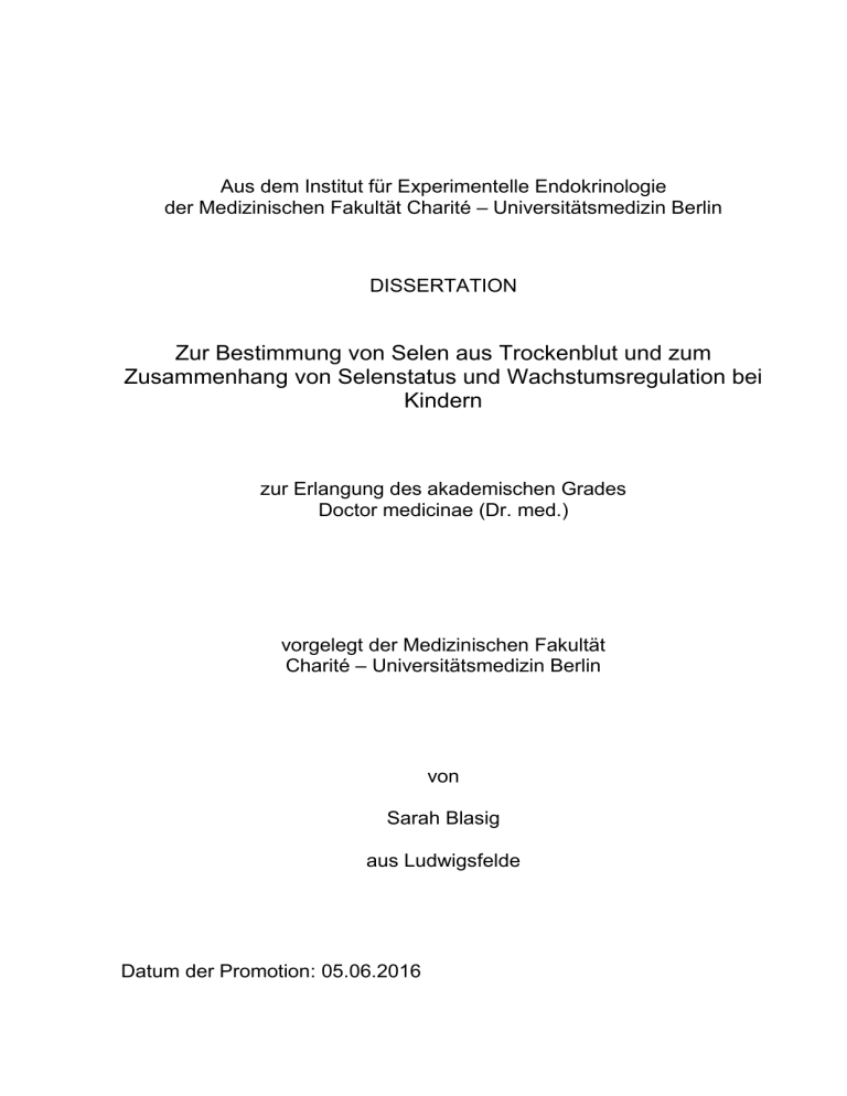 Aus dem Institut für Experimentelle Endokrinologie der Medizinischen Fakultät Charité – Universitätsmedizin Berlin DISSERTATION Zur Bestimmung von Selen aus Trockenblut und zum Zusammenhang von Selenstatus und Wachstumsregulation bei Kindern zur Erlangung des akademischen Grades Doctor medicinae (Dr. med.) vorgelegt der Medizinischen Fakultät Charité – Universitätsmedizin Berlin von Sarah Blasig aus Ludwigsfelde Datum der Promotion: 05.06.2016 2 Inhaltsverzeichnis 1 Abstrakt ................................................................................................................... 6 2 Einleitung................................................................................................................. 9 2.1 2.1.1 Physiologische Funktion und Erkrankungen ................................................ 9 2.1.2 Selenversorgung und Toxizität................................................................... 11 2.1.3 Selen und Neugeborene ............................................................................ 13 2.1.4 Selen und Schilddrüse ............................................................................... 14 2.1.5 Selen und Wachstum ................................................................................. 16 2.2 Physiologische Funktion und Erkrankungen .............................................. 18 2.2.2 Kupferversorgung und Toxizität ................................................................. 19 2.2.3 Kupfer und Schilddrüse .............................................................................. 20 2.2.4 Kupfer und Wachstum ............................................................................... 20 Dried Blood Spots (DBS) .................................................................................. 21 2.3.1 Neugeborenen-Screening .......................................................................... 21 2.3.2 Weitere Anwendungsmöglichkeiten von DBS ............................................ 22 2.4 Total-Reflektions-Röntgenfluoreszenz (TXRF)-Analytik ................................... 22 2.5 Zielsetzung der Arbeit....................................................................................... 23 Material und Methoden ......................................................................................... 25 3.1 Geräte und Chemikalien ................................................................................... 25 3.2 Untersuchung von Kindern mit konnataler Hypothyreose und mit Kleinwuchs . 25 3.2.1 Probanden und Material ............................................................................. 25 3.2.2 Methode und Probenvorbereitung.............................................................. 26 3.3 DBS-Untersuchung........................................................................................... 27 3.3.1 Probanden und Material ............................................................................. 27 3.3.2 Methode und Probenvorbereitung.............................................................. 28 3.4 4 Kupfer ............................................................................................................... 18 2.2.1 2.3 3 Selen .................................................................................................................. 9 Datenauswertung und Statistik ......................................................................... 29 Entwicklung der Methode zur Selenbestimmung aus DBS ............................... 30 4.1 Vorüberlegung .................................................................................................. 30 4.1.1 Wahl der verwendeten Lösemittel .............................................................. 30 4.1.2 Verwendetes Probematerial und Volumen der Lösungsmittel ................... 31 4.2 Ergebnisse ....................................................................................................... 32 4.2.1 Lösungsmittel zur Probenaufbereitung ...................................................... 32 3 4.2.2 5 Optimierungsversuche der HCl-basierten Methode .................................. 36 4.3 Validierung der HCl-basierten Methode ........................................................... 38 4.4 Zusammenfassung der Arbeitsschritte der HCl-basierten Methode................. 41 Ergebnisse der Untersuchung von Kinder und Adoleszenten mit konnataler Hypothyreose und Kleinwuchs ............................................................................ 42 5.1 Untersuchung der Gruppe mit konnataler Hypothyreose ................................. 43 5.1.1 Auffälligkeiten der Spurenelemente und Schilddrüsenhormone ................ 45 5.1.2 Unterschiede zwischen den Geschlechtern und verschiedenen Altersgruppen ......................................................................................................... 48 5.1.3 Zusammenhänge von Spurenelementen und Schilddrüsenhormonen ...... 49 5.1.4 Zusammenhänge von Spurenelementen und Schilddrüsenhormonen in den verschiedenen Altersgruppen ................................................................................. 51 5.2 Untersuchung der Gruppe mit Kleinwuchs ...................................................... 52 5.2.1 Auffälligkeiten der Spurenelemente und des IGF-1-Spiegels .................... 53 5.2.2 Unterschiede zwischen den verschiedenen Altersgruppen und Geschlechtern ........................................................................................................ 55 5.2.3 Zusammenhänge von Spurenelementen mit IGF-1 und den Schilddrüsenhormonen .......................................................................................... 57 5.2.4 Zusammenhänge von Spurenelementen mit IGF-1 und den Schilddrüsenhormonen in den verschiedenen Altersgruppen ................................ 59 5.2.5 Zusammenhänge von Spurenelementen mit IGF-1 und den Schilddrüsenhormonen getrennt nach Geschlechtern.........................