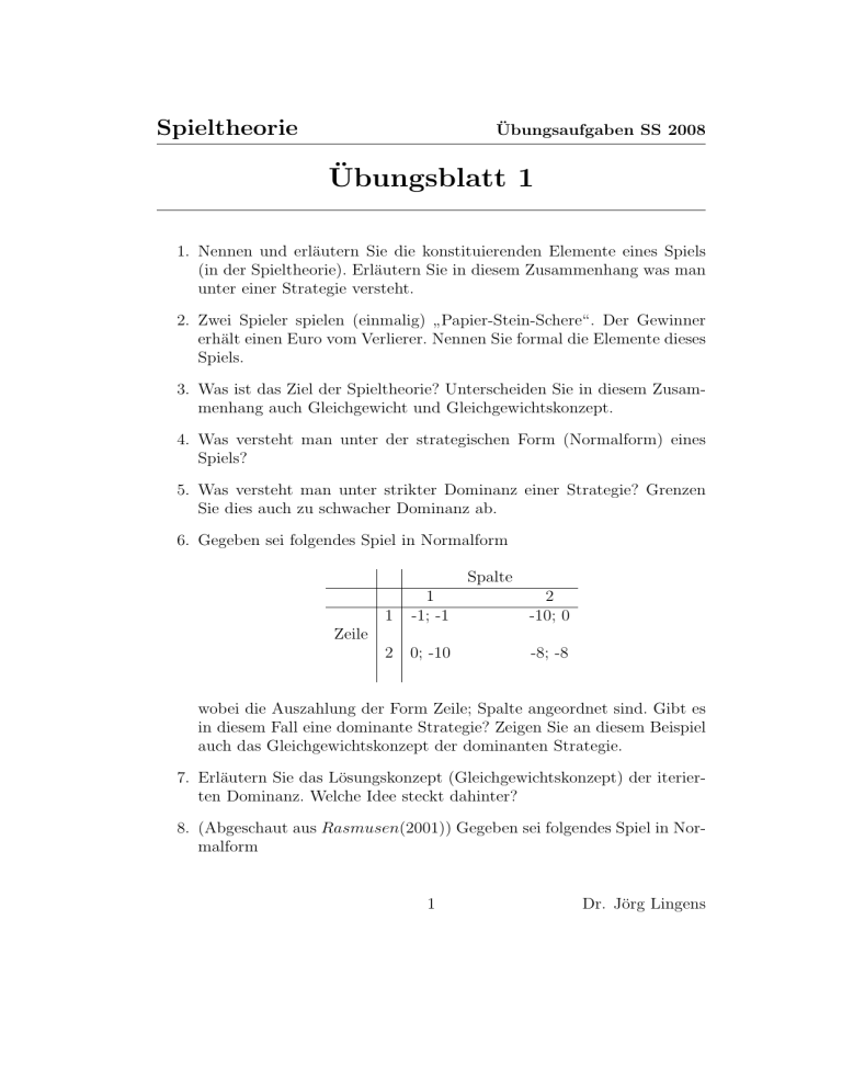 Spieltheorie Übungsaufgaben SS 2008 Übungsblatt 1 1. Nennen und erläutern Sie die konstituierenden Elemente eines Spiels (in der Spieltheorie). Erläutern Sie in diesem Zusammenhang was man unter einer Strategie versteht. 2. Zwei Spieler spielen (einmalig) Papier-Stein-Schere“. Der Gewinner ” erhält einen Euro vom Verlierer. Nennen Sie formal die Elemente dieses Spiels. 3. Was ist das Ziel der Spieltheorie? Unterscheiden Sie in diesem Zusammenhang auch Gleichgewicht und Gleichgewichtskonzept. 4. Was versteht man unter der strategischen Form (Normalform) eines Spiels? 5. Was versteht man unter strikter Dominanz einer Strategie? Grenzen Sie dies auch zu schwacher Dominanz ab. 6. Gegeben sei folgendes Spiel in Normalform Spalte 1 -1; -1 2 -10; 0 2 0; -10 -8; -8 1 Zeile wobei die Auszahlung der Form Zeile; Spalte angeordnet sind. Gibt es in diesem Fall eine dominante Strategie? Zeigen Sie an diesem Beispiel auch das Gleichgewichtskonzept der dominanten Strategie. 7. Erläutern Sie das Lösungskonzept (Gleichgewichtskonzept) der iterierten Dominanz. Welche Idee steckt dahinter? 8. (Abgeschaut aus Rasmusen(2001)) Gegeben sei folgendes Spiel in Normalform 1 Dr. Jörg Lingens Spieltheorie Übungsaufgaben SS 2008 Spalte 1 2;-2 2 2; -2 2 1; -1 3; -3 1 Zeile Hat das Spiel ein Gleichgewicht in dominanten Strategien? Zeigen Sie das Gleichgewicht, das sich durch Anwendung der iterierten Dominanz ergibt. 9. (Abgeschaut aus Dixit/N alebuf f (1991)) Gegeben sei folgendes Spiel in Normalform Spalte 1 2 1 3;-3 7; -7 3 15; -15 2 9;-9 10;-10 Zeile 8;-8 Bestimmen Sie das Gleichgewicht des Spiels mittels wiederholter Elimination dominierter Strategien (iterierte Dominanz). Gibt es auch ein Gleichgewicht in dominanten Strategien? 2 Dr. Jörg Lingens