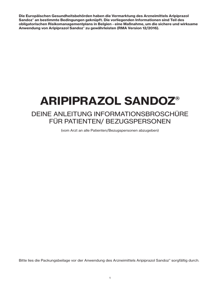 Die Europäischen Gesundheitsbehörden haben die Vermarktung des Arzneimittels Aripiprazol Sandoz® an bestimmte Bedingungen geknüpft. Die vorliegenden Informationen sind Teil des obligatorischen Risikomanagementplans in Belgien - eine Maßnahme, um die sichere und wirksame Anwendung von Aripiprazol Sandoz® zu gewährleisten (RMA Version 12/2016). ARIPIPRAZOL SANDOZ® DEINE ANLEITUNG INFORMATIONSBROSCHÜRE FÜR PATIENTEN/ BEZUGSPERSONEN (vom Arzt an alle Patienten/Bezugspersonen abzugeben) Bitte lies die Packungsbeilage vor der Anwendung des Arzneimittels Aripiprazol Sandoz® sorgfältig durch. 1 Ziel dieser Materialien (RMA oder Risk Minimisation Activities): Diese Informationen sind Teil des belgischen Risikomanagementplans, dessen Anliegen es ist, Mitarbeitern des Gesundheitswesens (und Patienten) Informationsmaterial zur Verfügung zu stellen. Diese zusätzlichen Maßnahmen zur Risikominimierung dienen dem Ziel, die sichere und wirksame Anwendung von Aripiprazol Sandoz® zu gewährleisten und müssen folgende wichtige Themen behandeln: Kernpunkte der Broschüre für Patienten und Bezugspersonen: • Kurze Einleitung zu den Anwendungsgebieten von Aripiprazol Sandoz® und zum Ziel dieses Dokuments. • Information darüber, dass die Zielgruppe in diesem Fall Jugendliche im Alter von 13 bis 17 Jahren sind und dass die Anwendung von Aripiprazol Sandoz® für Patienten unter 13 Jahren nicht empfohlen wird. • Information darüber, dass Aripiprazol Sandoz® bei Dosierungen von mehr als 10 mg/Tag Nebenwirkungen insbesondere bezüglich folgender Punkte hervorrufen kann: - Gewichtszunahme, wobei empfohlen wird, die Patienten diesbezüglich zu überwachen - Extrapyramidale Symptome -Schläfrigkeit -Müdigkeit • Die Bitte, darum den Arzt vor Beginn der Behandlung über sämtliche Krankheitsbilder vor der Behandlung in Kenntnis zu setzen. • Wie wichtig es ist, nicht zu versuchen, Symptome eigenständig ohne vorherige Rücksprache mit dem Arzt zu behandeln. 2 Einleitung Dein Arzt hat bei dir die Diagnose „Bipolare Störung Typ I“ gestellt und dir Aripiprazol Sandoz® verschrieben. Das Lesen dieser Broschüre kann dir und deiner/n Bezugsperson(en) dabei helfen zu verstehen, was Aripiprazol Sandoz® ist. Außerdem umfasst diese Broschü- re Informationen über mögliche Nebenwirkungen, die mit der Behandlung mit Aripiprazol Sandoz® einhergehen können, und darüber, wie wichtig die sofortige Mitteilung aller Anzeichen dieser Nebenwirkungen an deinen Arzt ist. Was ist eine bipolare Störung Typ I? Die bipolare Störung Typ I (früher manische Depression genannt) bei Jugendlichen ist durch das Auftreten einer oder mehrerer manischer oder gemischter (manischdepressiver) Episoden gekennzeichnet. Dabei kannst du Symptome empfinden, wie das Gefühl „high“ zu sein und übermäßig viel Energie zu haben, viel weniger Schlaf zu brauchen als gewöhnlich, sehr schnell zu sprechen, viele schnell wechselnde Gedanken im Kopf zu haben und manchmal stark reizbar zu sein. Was ist eine Behandlung mit Aripiprazol Sandoz®? Aripiprazol Sandoz® ist ein Arzneimittel, das zur Behandlung mittelschwerer bis schwerer manischer Episoden bei Heranwachsenden (Jugendliche zwischen 13 und 17 Jahren) mit bipolarer Störung Typ I entwickelt wurde, welche bis zu 12 Wochen dauert. Aripiprazol Sandoz® wird nicht zur Anwendung bei Patienten unter 13 Jahren empfohlen. 3 Was kann ich von meiner Behandlung erwarten? Vor der Behandlung Bevor du Aripiprazol Sandoz® einnehmen kannst, muss dein Arzt herausfinden, ob dieses Arzneimittel für dich geeignet ist. Dein Arzt muss vor allem abklären, ob du überempfindlich (allergisch) auf Aripiprazol Sandoz® oder einen anderen Stoff reagierst, der zur Herstellung von Aripiprazol Sandoz® verwendet wird. Außerdem musst du vor Beginn der Behandlung mit Aripiprazol Sandoz® deinen Arzt über sämtliche Arzneimittel informieren, die du einnimmst und vor allem darüber, ob du unter einer der folgenden Erkrankungen oder Symptome leidest: • hoher Blutzucker/Diabetes/Zuckerkrankheit (äußert sich durch Symptome wie extremen Durst, übermäßiges Wasserlassen, gesteigerten Appetit und Schwächegefühl) oder eine Vorgeschichte zu Diabetes in deiner Familie; • Konvulsionen (Krampfanfälle/epileptische Anfälle); • unkontrollierte, unregelmäßige Muskelzuckungen, insbesondere im Gesicht; • kardiovaskuläre Erkrankungen oder Herz-Kreislauf-Erkrankungen, Schlaganfall oder „Mini-Schlaganfall“, anormaler Blutdruck oder eine Familiengeschichte von kardiovaskulären Erkrankungen, z. B. Herzinfarkt (Herzanfall) oder koronare Herzkrankheit; • Blutgerinnselbildung oder eine Familiengeschichte zu Blutgerinnselbildung, da Antipsychotika mit Blutgerinnselbildung in Zusammenhang gebracht wurden; • Patienten, bei denen gleichzeitig eine Einschränkung der Aufmerksamkeit und hyperaktives Verhalten (Aufmerksamkeitsdefizit-/Hyperaktivitätsstörung - ADHS) auftreten: obwohl bipolare Störung Typ I und ADHS häufig gemeinsam auftreten, steht nur eine beschränkte Datenmenge zur Sicherheit einer gleichzeitigen Anwendung von Aripiprazol Sandoz® und stimulierenden Mitteln (z. B. Methylfenidat) zur Verfügung. Darum ist äußerste Vorsicht geboten, wenn diese Arzneimittel gleichzeitig verabreicht werden; • Erfahrungen mit übermäßigem Glückspiel (Zocken) in der Vergangenheit. Dies ist wichtig, um das Risiko von Nebenwirkungen während deiner Behandlung mit Aripiprazol Sandoz® zu mindern. Darreichung: Wie nehme ich Aripiprazol Sandoz® ein? Die Standarddosis für Aripiprazol Sandoz® ist 10 mg einmal täglich. Allerdings beginnst du nicht sofort mit einer Dosis von 10 mg. Mit dem folgenden Zeitplan kann sich dein Körper allmählich an die Einnahme von Aripiprazol Sandoz® gewöhnen, wenn du mit der Behandlung beginnst: • Am ersten und zweiten Tag nimmst du jeweils 2 ml einer Flüssigkeit ein, die Aripiprazol Sandoz® (Aripiprazol) in einer Konzentration von 1 mg/ml (Gesamtdosis = 2 