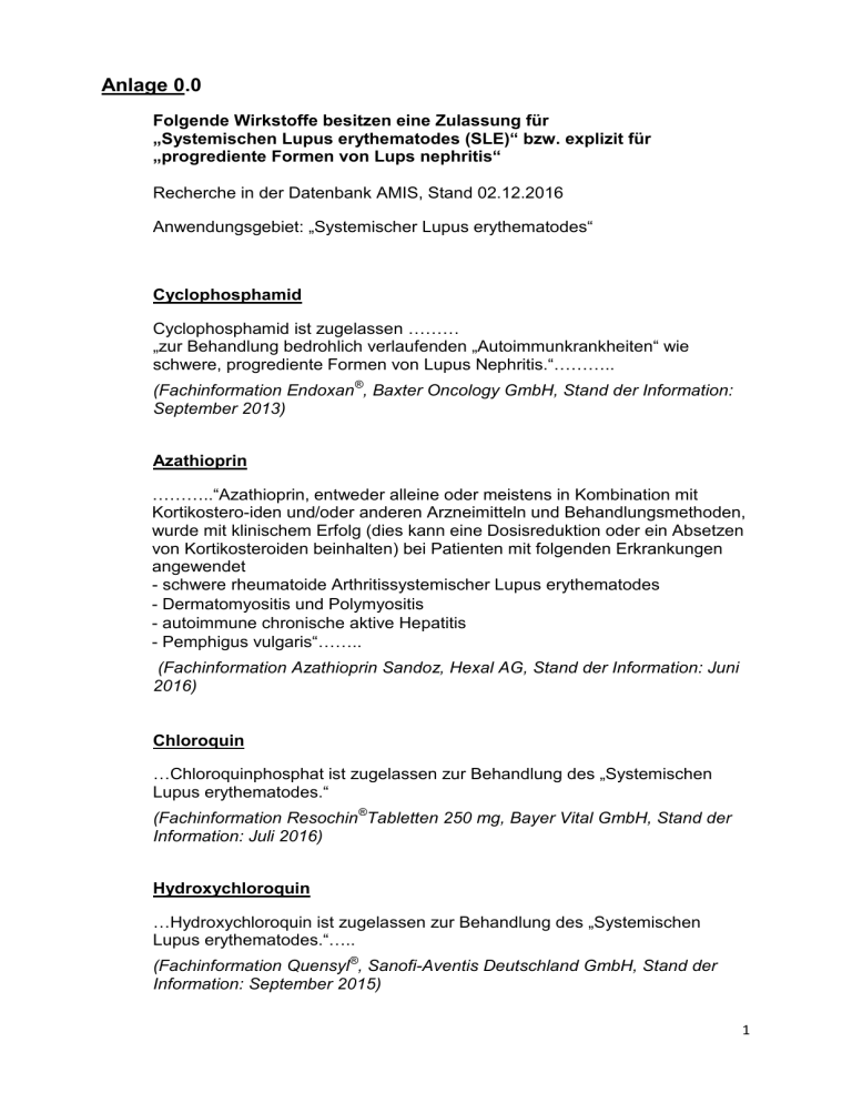 Anlage 0.0 Folgende Wirkstoffe besitzen eine Zulassung für „Systemischen Lupus erythematodes (SLE)“ bzw. explizit für „progrediente Formen von Lups nephritis“ Recherche in der Datenbank AMIS, Stand 02.12.2016 Anwendungsgebiet: „Systemischer Lupus erythematodes“ Cyclophosphamid Cyclophosphamid ist zugelassen ……… „zur Behandlung bedrohlich verlaufenden „Autoimmunkrankheiten“ wie schwere, progrediente Formen von Lupus Nephritis.“……….. (Fachinformation Endoxan®, Baxter Oncology GmbH, Stand der Information: September 2013) Azathioprin ………..“Azathioprin, entweder alleine oder meistens in Kombination mit Kortikostero-iden und/oder anderen Arzneimitteln und Behandlungsmethoden, wurde mit klinischem Erfolg (dies kann eine Dosisreduktion oder ein Absetzen von Kortikosteroiden beinhalten) bei Patienten mit folgenden Erkrankungen angewendet - schwere rheumatoide Arthritissystemischer Lupus erythematodes - Dermatomyositis und Polymyositis - autoimmune chronische aktive Hepatitis - Pemphigus vulgaris“…….. (Fachinformation Azathioprin Sandoz, Hexal AG, Stand der Information: Juni 2016) Chloroquin …Chloroquinphosphat ist zugelassen zur Behandlung des „Systemischen Lupus erythematodes.“ (Fachinformation Resochin®Tabletten 250 mg, Bayer Vital GmbH, Stand der Information: Juli 2016) Hydroxychloroquin …Hydroxychloroquin ist zugelassen zur Behandlung des „Systemischen Lupus erythematodes.“….. (Fachinformation Quensyl®, Sanofi-Aventis Deutschland GmbH, Stand der Information: September 2015) 1 Prednisolon …Prednisolon ist zugelassen zur Behandlung des „Systemischen Lupus erythematodes.“….. (Fachinformation Decortin®H, Merck Serono GmbH, Stand der Information: April 2013) Methylprednisolon …Methylprednisolon ist zugelassen zur Behandlung von Autoimmun­ erkrankungen, z. B. Dermatomyositis, systemische Sklerodermie (indurative Phase), „chronisch diskoider und subakut kutaner Lupus erythematodes.“ ….. (Fachinformation Urbason®4mg/8mg/16mg/40mg Tabletten, Sanofi-Aventis Deutschland GmbH, Stand der Information: April 2016) Betamethasonacetat, Betamethasondihydrogenphosphat-Dinatrium …ist zugelassen zur Behandlung des „diskoiden Lupus erythematodes.“….. (Fachinformation Celestan®Depot, MSD SHARP & DOHME GmbH, Stand der Information: März 2015) Dexamethason …Dexamethason „ist zugelassen zur oralen Anfangsbehandlung von Autoimmunerkrankungen, wie systemischer Lupus erythematodes (insbesondere viszerale Formen).“….. (Fachinformation Fortecortin®0,5 mg/2 mg/4 mg/ 8 mg Tabletten, Merck Serono GmbH, Stand der Information: März 2016) Triamcinolon …Triamcinolon ist zugelassen zur Behandlung „aktiver Phasen von rheumatischen Systemerkrankungen wie des Systemischen Lupus erythematodes.“….. (Fachinformation Volon®4/8/16mg, Dermapharm AG, Stand der Information: August 2015) Dapson …Dapson (Diaminodiphenylsulfon) ist zugelassen zur Behandlung der „ulcerösen Exazerbationen des Erythematodes.“….. (Fachinformation Dapson-Fatol®, Riemser Pharma GmbH, Stand der Information: Januar 2015) 2 Belimumab „Belimumab ist indiziert als Zusatztherapie bei erwachsenen Patienten mit aktivem, Autoantikörper-positiven systemischen Lupus erythematodes (SLE), die trotz Standardtherapie eine hohe Krankheitsaktivität (z.B. positiver Test auf Anti-dsDNA-Antikörper und niedriges Komplement) aufweisen.“ (Fachinformation Benlysta®120 mg/400 mg, Glaxo Group Limited, Stand der Information: September 2016) 3 Fachinformation CellCept® 500 mg Filmtabletten 1. BEZEICHNUNG DES ARZNEIMITTELS CellCept® 500 mg Filmtabletten. 2. QUALITATIVE UND QUANTITATIVE ZUSAMMENSETZUNG Jede Tablette enthält 500 mg Mycopheno­ latmofetil. Vollständige Auflistung der sonstigen Be­ standteile, siehe Abschnitt 6.1. 3. DARREICHUNGSFORM Filmtabletten. CellCept Tabletten: Lilafarbene Tabletten in Caplet-Form, die auf einer Seite die Prä­ gung „CellCept 500“ und auf der anderen den Namen „Roche“ tragen. 4. KLINISCHE ANGABEN 4.1 Anwendungsgebiete CellCept ist in Kombination mit Ciclosporin und Corticosteroiden zur Prophylaxe von akuten Transplantatabstoßungsreaktionen bei Patienten mit allogener Nieren-, Herzoder Lebertransplantation angezeigt. Kinder und Jugendliche Zu pädiatrischen Herztransplantationspa­ tienten liegen keine Daten vor. Anwendung bei Lebertransplantation Erwachsene CellCept sollte nach einer Lebertransplan­ tation für die ersten 4 Tage i. v. verabreicht werden, dann, sobald eine solche vertragen wird, soll die orale Gabe von CellCept be­ gonnen werden. Bei Lebertransplantations­ patienten beträgt die empfohlene orale Dosis zweimal täglich 1,5 g (Tagesdosis: 3 g). Kinder und Jugendliche Zu pädiatrischen Lebertransplantationspa­ tienten liegen keine Daten vor. Anwendung bei besonderen Patienten­ gruppen Ältere Menschen Bei älteren Menschen erweist sich die emp­ fohlene Dosis von zweimal täglich 1 g für nierentransplantierte Patienten und von zweimal täglich 1,5 g für Herz- oder Lebertransplantierte als geeignet. Niereninsuffizienz 4.2 Dosierung und Art der Anwendung Die Behandlung mit CellCept soll von ent­ sprechend qualifizierten Transplantations­ spezialisten eingeleitet und fortgeführt wer­ den. Dosierung Anwendung bei Nierentransplantation Erwachsene Eine orale Therapie mit CellCept sollte in­ nerhalb von 72 Stunden nach der Transplan­ tation eingeleitet werden. Die empfohlene Dosis für Nierentransplantationspatienten be­ trägt zweimal täglich 1 g (Tagesdosis: 2 g). Kinder und Jugendliche im Alter von 2 bis 18 Jahren Die empfohlene Dosis Mycophenolatmofetil beträgt 600 mg/m2 zweimal täglich oral verabreicht (bis zu einer maximalen Tages­ dosis von 2 g). CellCept Tabletten sollten nur Patienten mit einer Körperoberfläche von mehr als 1,5 m2 in einer Dosis von zweimal täglich 1 g (Tagesdosis: 2 g) verordnet wer­ den. Da im Vergleich zu Erwachsenen in dieser Altersgruppe einige der Nebenwirku