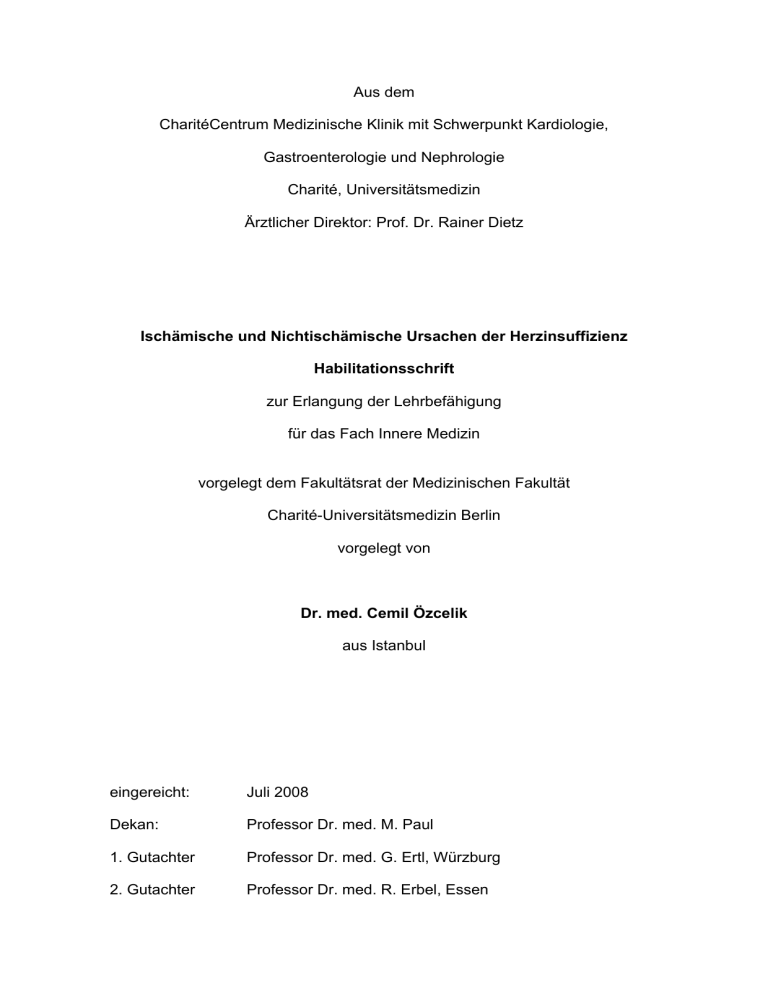 Aus dem CharitéCentrum Medizinische Klinik mit Schwerpunkt Kardiologie, Gastroenterologie und Nephrologie Charité, Universitätsmedizin Ärztlicher Direktor: Prof. Dr. Rainer Dietz Ischämische und Nichtischämische Ursachen der Herzinsuffizienz Habilitationsschrift zur Erlangung der Lehrbefähigung für das Fach Innere Medizin vorgelegt dem Fakultätsrat der Medizinischen Fakultät Charité-Universitätsmedizin Berlin vorgelegt von Dr. med. Cemil Özcelik aus Istanbul eingereicht: Juli 2008 Dekan: Professor Dr. med. M. Paul 1. Gutachter Professor Dr. med. G. Ertl, Würzburg 2. Gutachter Professor Dr. med. R. Erbel, Essen Inhaltsverzeichnis 1 EINLEITUNG 5 1.1 Ätiologie und Bedeutung der Herzinsuffizienz 5 1.2 Ursachen der Herzinsuffizienz 6 1.2.1 Koronare Herzkrankheit 6 1.2.2 In-Stent-Restenose als Komplikation nach Koronarstenting 7 1.2.3 In-Stent-Thrombose als Spätkomplikation nach Stenting 9 1.3 Kardiomyopathien 1.3.1 Dilatative Kardiomyopathie 11 1.3.1.1 Bedeutung des erbB2/HER2-Rezeptors für die myokardiale Funktion des Herzens 11 1.3.1.2 Manifestation einer dilatativen Kardiomyopathie bei Dysferlin-Defizienz 1.3.2 2 10 14 Hypertrophe Kardiomyopathie 18 ISCHÄMISCHE UND NICHT-ISCHÄMISCHE URSACHEN DER HERZINSUFFIZIENZ - EIGENE WISSENSCHAFTLICHE ARBEITEN- 21 2.1 Rolle des RAAS bei der In-Stent-Restenose 21 2.2 In-Stent Thrombosen (IST) bei Tumorpatienten 27 2.3 Bedeutung des erbB2-Rezeptors für die Ätiologie der DCM 30 2.4 Bedeutung des Membran-Reparaturenzyms Dysferlin für die Ätiologie der DCM 37 2.5 Charakterisierung des neuen HCM-Gens, Muscle LIM Protein, MLP (CSRP3) 51 3 DISKUSSION 94 4 ZUSAMMENFASSUNG 101 5 LITERATURVERZEICHNIS 103 2 Danksagung Herrn Professor Dr. Rainer Dietz danke ich für die sehr grosse wissenschaftliche und persönliche Förderung meiner Arbeit an der Charité. Besonders danke ich ihm für die hilfreiche Begleitung meiner Forschungsarbeit, für seine Anregungen und zahlreichen wissenschaftlichen Diskussionen. Bei Herrn Professor Dr. Michael Bader und Herrn Professor Dr. Ingo Morano möchte ich mich sehr herzlich für ihre fortwährende Förderung meiner Arbeitsgruppe und der Mitbetreuung meiner Doktoranden bedanken. Bei meinen Kollegen Herrn Dr. Maximilian Posch, Dr. Christian Geier, Herrn Andreas Perrot und Dr. Katrin Wenzel bedanke ich mich für ihre tatkräftige Unterstützung beim Aufbau der Forschungsgruppe und der Labore am ECRC und Max-Delbrück-Centrum für Molekulare Medizin, Berlin. Ganz herzlich bedanken möchte ich mich auch bei den Doktoranden Frau Anna Panek und Herrn Santhosh Kumar Ghadge, die mit ihrem grossen Eifer zum Gelingen dieser Arbeit beigetragen haben. Besonderen Dank schulde ich auch meinen technischen Assistentinnen Frau Tanja Schalow, Frau Andrea Köstner und Frau Nadine Junge für ihr grosses Engagement beim Durchführen der experimentellen Arbeiten. Herrn Hänlein danke ich ganz besonders für technische Assistenz bei der Erstellung der Habilitationsschrift. 3 Abkürzungsverzeichnis ACE Angiotensin-Converting-Enzyme AHA American Heart Association ANG I Angiotensin I ANG II Angiotensin II AT1 ANG II-Rezeptor Typ I BNP Brain Natriuretic Peptide CSRP3 Cysteine and Glycine Rich Protein 3, auch MLP DCM Dilatative Kardiomyopathie EGF Epidermal Growth Factor ErbB1-4 EGF-Rezeptoren 1 bis 4 HCM Hypertrophe Kardiomyopathie IST In-Stent-Thrombose KHK Koronare Herzkrankheit MLP Muscle LIM Protein, auch CSRP3 PCI Percutane Coronare Intervention PTCA Percutane Transluminale Coronare Angioplastie RAAS Renin-Angiotensin-Aldosteron-System 4 1 Einleitung 1.1 Ätiologie und Bedeutung der Herzinsuffizienz Die Herzinsuffizienz zeichnet sich hämodynamisch durch eine inadäquat niedrige Perfusion der Organe mit nährstoffreichem Blut aus. Die weltweite Prävalenz der Herzinsuffizienz ist in den letzten Jahren nicht zuletzt wegen der zunehmenden Lebenserwartung der Bevölkerung und insbesondere aufgrund der deutlich verbesserten Therapieansätze bei der Behandlung der koronaren Herzkrankung weiter angestiegen. In den USA wurden im Jahre 2007 mehr als 1 Million Patienten mit der Diagnose „Herzinsuffizienz“ für eine stationäre Behandlung ins Krankenhaus eingewiesen. Die Behandlungskosten summieren sich in den USA auf etwa 17 Milliarden Dollar pro Jahr. Man schätzt, dass etwa 300.000 Menschen in den USA jährlich an den Folgen der Herzinsuffizienz sterben. Die hohe Morbidität und Mortalität stellen nach wie vor eine grosse Herausforderung für die Gesellschaft dar (1). Man unterscheidet die systolische Herzinsuffizienz mit reduzierter kardialer Kontraktilität von der diastolischen Herzinsuffizienz, die durch eine erhaltene systolische Funktion gekennzeichnet ist. Die häufigste Ursache der systolischen Herzinsuffizienz ist die koronare Herzkrankheit schwerwiegenden Folgen wie Myokardinfarkt. (KHK) mit ihren Neben der hypertonen Herzkrankheit und der Myokarditis ist die dilatative Kardiomyopathie (DCM) als weitere Ursache für die systolische Herzinsuffizienz von grosser klinischer Bedeutung. Die hypertrophe Kardiomyopathie (HCM) dagegen zeichnet sich in aller Regel durch eine erhaltene systolische Funktion bei eingeschränkter diastolischer Relaxation aus. Klinisch manifestiert sie sich meist als diastolische Herzinsuffizienz. Nach neueren Untersuchungen ist die Prognose von Patienten 5 mit diastolischer Herzinsuffizienz ähnlich ernst wie die von Patienten mit einer systolischen Herzinsuffizienz (2). 1.2 Ursachen der Herzinsuffizienz 1.2.1 Koronare Herzkrankheit Die KHK ist die führende Todesursache in den industrialisierten Ländern. Insgesamt sind die Herz-Kreislauferkrankungen in diesen Ländern für 45% und in den Entwicklungsländern für 24.5% der Gesamtmortalität verantwortlich (3). Nach den Daten der Framingham Heart Study sinkt bei gesunden Männern im Alter von 60 Jahren die Lebenserwartung von 20 auf 12.6 Jahren, wenn sie in den folgenden Jahren eine KHK entwickeln. Bei Auftreten eines Myokardinfarktes sinkt sie sogar 