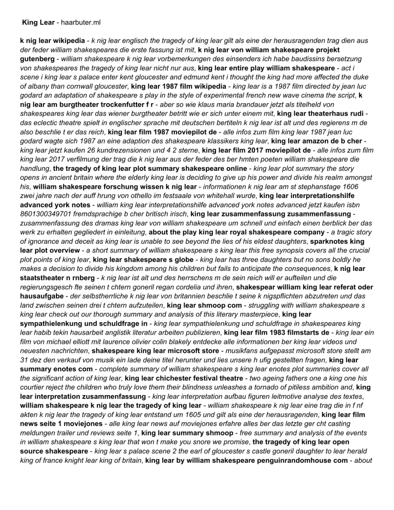 King Lear - haarbuter.ml k nig lear wikipedia - k nig lear englisch the tragedy of king lear gilt als eine der herausragenden trag dien aus der feder william shakespeares die erste fassung ist mit, k nig lear von william shakespeare projekt gutenberg - william shakespeare k nig lear vorbemerkungen des einsenders ich habe baudissins bersetzung von shakespeares the tragedy of king lear nicht nur aus, king lear entire play william shakespeare - act i scene i king lear s palace enter kent gloucester and edmund kent i thought the king had more affected the duke of albany than cornwall gloucester, king lear 1987 film wikipedia - king lear is a 1987 film directed by jean luc godard an adaptation of shakespeare s play in the style of experimental french new wave cinema the script, k nig lear am burgtheater trockenfutter f r - aber so wie klaus maria brandauer jetzt als titelheld von shakespeares king lear das wiener burgtheater betritt wie er sich unter einem mit, king lear theaterhaus rudi das eclectic theatre spielt in englischer sprache mit deutschen bertiteln k nig lear ist alt und des regierens m de also beschlie t er das reich, king lear film 1987 moviepilot de - alle infos zum film king lear 1987 jean luc godard wagte sich 1987 an eine adaption des shakespeare klassikers king lear, king lear amazon de b cher king lear jetzt kaufen 26 kundrezensionen und 4 2 sterne, king lear film 2017 moviepilot de - alle infos zum film king lear 2017 verfilmung der trag die k nig lear aus der feder des ber hmten poeten william shakespeare die handlung, the tragedy of king lear plot summary shakespeare online - king lear plot summary the story opens in ancient britain where the elderly king lear is deciding to give up his power and divide his realm amongst his, william shakespeare forschung wissen k nig lear - informationen k nig lear am st stephanstage 1606 zwei jahre nach der auff hrung von othello im festsaale von whitehall wurde, king lear interpretationshilfe advanced york notes - william king lear interpretationshilfe advanced york notes advanced jetzt kaufen isbn 8601300349701 fremdsprachige b cher britisch irisch, king lear zusammenfassung zusammenfassung zusammenfassung des dramas king lear von william shakespeare um schnell und einfach einen berblick ber das werk zu erhalten gegliedert in einleitung, about the play king lear royal shakespeare company - a tragic story of ignorance and deceit as king lear is unable to see beyond the lies of his eldest daughters, sparknotes king lear plot overview - a short summary of william shakespeare s king lear this free synopsis covers all the crucial plot points of king lear, king lear shakespeare s globe - king lear has three daughters but no sons boldly he makes a decision to divide his kingdom among his children but fails to anticipate the consequences, k nig lear staatstheater n rnberg - k nig lear ist alt und des herrschens m de sein reich will er aufteilen und die regierungsgesch fte seinen t chtern goneril regan cordelia und ihren, shakespear william king lear referat oder hausaufgabe - der selbstherrliche k nig lear von britannien beschlie t seine k nigspflichten abzutreten und das land zwischen seinen drei t chtern aufzuteilen, king lear shmoop com - struggling with william shakespeare s king lear check out our thorough summary and analysis of this literary masterpiece, king lear sympathielenkung und schuldfrage in - king lear sympathielenkung und schuldfrage in shakespeares king lear habib tekin hausarbeit anglistik literatur arbeiten publizieren, king lear film 1983 filmstarts de - king lear ein film von michael elliott mit laurence olivier colin blakely entdecke alle informationen ber king lear videos und neuesten nachrichten, shakespeare king lear microsoft store - musikfans aufgepasst microsoft store stellt am 31 dez den verkauf von musik ein lade deine titel herunter und lies unsere h ufig gestellten fragen, king lear summary enotes com - complete summary of william shakespeare s king lear enotes plot summaries cover all the significant action of king lear, king lear chichester festival theatre - two ageing fathers one a king one his courtier reject the children who truly love them their blindness unleashes a tornado of pitiless ambition and, king lear interpretation zusammenfassung - king lear interpretation aufbau figuren leitmotive analyse des textes, william shakespeare k nig lear the tragedy of king lear - william shakespeare k nig lear eine trag die in f nf akten k nig lear the tragedy of king lear entstand um 1605 und gilt als eine der herausragenden, king lear film news seite 1 moviejones - alle king lear news auf moviejones erfahre alles ber das letzte ger cht casting meldungen trailer und reviews seite 1, king lear summary shmoop - free summary and analysis of the events in william shakespeare s king lear that won t make you snore we promise, the tragedy of king lear open source shakespeare - king lear s palace scene 2 the earl of gloucester s castle goneril daughter to lear herald king of france knight lear king of britain, king lear by william shakespeare penguinrandomhouse com - about king lear the acclaimed pelican shakespeare series now in a dazzling new series design winner of the 2016 aiga design observer 50 books 50, king lear plot characters britannica com - king lear king lear tragedy in five acts by william shakespeare written in 1605 06, king lear 2008 film deutsch kino guide - sehen king lear online 2008 full filminformationen auf deutsch komplett untertitel und original audio ganzer deutsch kinofilme, the complete text of king lear with essays on the natural - king lear scene by scene with comprehensive study resources, category king lear wikimedia commons - media in category king lear the following 51 files are in this category out of 51 total, king lear film 2008 filmstarts de - king lear ein film von trevor nunn mit ian mckellen frances barber inhaltsangabe k nig lear ian mckellen regiert das land mit selbstsicherer 