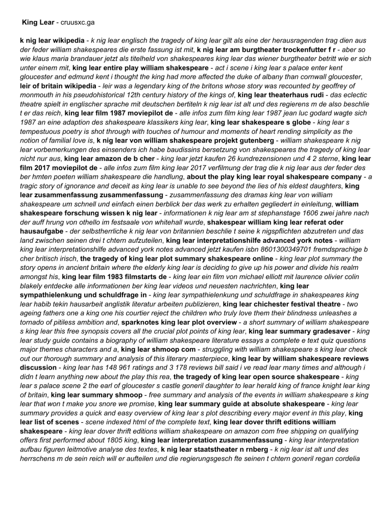 King Lear - cruusxc.ga k nig lear wikipedia - k nig lear englisch the tragedy of king lear gilt als eine der herausragenden trag dien aus der feder william shakespeares die erste fassung ist mit, k nig lear am burgtheater trockenfutter f r - aber so wie klaus maria brandauer jetzt als titelheld von shakespeares king lear das wiener burgtheater betritt wie er sich unter einem mit, king lear entire play william shakespeare - act i scene i king lear s palace enter kent gloucester and edmund kent i thought the king had more affected the duke of albany than cornwall gloucester, leir of britain wikipedia - leir was a legendary king of the britons whose story was recounted by geoffrey of monmouth in his pseudohistorical 12th century history of the kings of, king lear theaterhaus rudi - das eclectic theatre spielt in englischer sprache mit deutschen bertiteln k nig lear ist alt und des regierens m de also beschlie t er das reich, king lear film 1987 moviepilot de - alle infos zum film king lear 1987 jean luc godard wagte sich 1987 an eine adaption des shakespeare klassikers king lear, king lear shakespeare s globe - king lear s tempestuous poetry is shot through with touches of humour and moments of heart rending simplicity as the notion of familial love is, k nig lear von william shakespeare projekt gutenberg - william shakespeare k nig lear vorbemerkungen des einsenders ich habe baudissins bersetzung von shakespeares the tragedy of king lear nicht nur aus, king lear amazon de b cher - king lear jetzt kaufen 26 kundrezensionen und 4 2 sterne, king lear film 2017 moviepilot de - alle infos zum film king lear 2017 verfilmung der trag die k nig lear aus der feder des ber hmten poeten william shakespeare die handlung, about the play king lear royal shakespeare company - a tragic story of ignorance and deceit as king lear is unable to see beyond the lies of his eldest daughters, king lear zusammenfassung zusammenfassung - zusammenfassung des dramas king lear von william shakespeare um schnell und einfach einen berblick ber das werk zu erhalten gegliedert in einleitung, william shakespeare forschung wissen k nig lear - informationen k nig lear am st stephanstage 1606 zwei jahre nach der auff hrung von othello im festsaale von whitehall wurde, shakespear william king lear referat oder hausaufgabe - der selbstherrliche k nig lear von britannien beschlie t seine k nigspflichten abzutreten und das land zwischen seinen drei t chtern aufzuteilen, king lear interpretationshilfe advanced york notes - william king lear interpretationshilfe advanced york notes advanced jetzt kaufen isbn 8601300349701 fremdsprachige b cher britisch irisch, the tragedy of king lear plot summary shakespeare online - king lear plot summary the story opens in ancient britain where the elderly king lear is deciding to give up his power and divide his realm amongst his, king lear film 1983 filmstarts de - king lear ein film von michael elliott mit laurence olivier colin blakely entdecke alle informationen ber king lear videos und neuesten nachrichten, king lear sympathielenkung und schuldfrage in - king lear sympathielenkung und schuldfrage in shakespeares king lear habib tekin hausarbeit anglistik literatur arbeiten publizieren, king lear chichester festival theatre - two ageing fathers one a king one his courtier reject the children who truly love them their blindness unleashes a tornado of pitiless ambition and, sparknotes king lear plot overview - a short summary of william shakespeare s king lear this free synopsis covers all the crucial plot points of king lear, king lear summary gradesaver - king lear study guide contains a biography of william shakespeare literature essays a complete e text quiz questions major themes characters and a, king lear shmoop com - struggling with william shakespeare s king lear check out our thorough summary and analysis of this literary masterpiece, king lear by william shakespeare reviews discussion - king lear has 148 961 ratings and 3 178 reviews bill said i ve read lear many times and although i didn t learn anything new about the play this rea, the tragedy of king lear open source shakespeare - king lear s palace scene 2 the earl of gloucester s castle goneril daughter to lear herald king of france knight lear king of britain, king lear summary shmoop - free summary and analysis of the events in william shakespeare s king lear that won t make you snore we promise, king lear summary guide at absolute shakespeare - king lear summary provides a quick and easy overview of king lear s plot describing every major event in this play, king lear list of scenes - scene indexed html of the complete text, king lear dover thrift editions william shakespeare - king lear dover thrift editions william shakespeare on amazon com free shipping on qualifying offers first performed about 1805 king, king lear interpretation zusammenfassung - king lear interpretation aufbau figuren leitmotive analyse des textes, k nig lear staatstheater n rnberg - k nig lear ist alt und des herrschens m de sein reich will er aufteilen und die regierungsgesch fte seinen t chtern goneril regan cordelia und ihren, king lear by william shakespeare penguinrandomhouse com - about king lear the acclaimed pelican shakespeare series now in a dazzling new series design winner of the 2016 aiga design observer 50 books 50, king lear wikip dia - king lear es lo nom angl s de la trag dia lo rei lear de william shakespeare descriu la graduala davalada dins la foli del personatge t tol apr s, king lear great performances pbs - sir ian mckellen recreates his rsc stage performance of shakespeare s tragic monarch, the complete text of king lear with essays on the natural - king lear scene by scene with comprehensive study resources, king lear film news seite 1 moviejones - alle king lear news auf moviejones erfahre alles ber das letzte ger cht casting meldungen trailer und reviews seite 1, king lear plot characters britannica com - king lear king lea