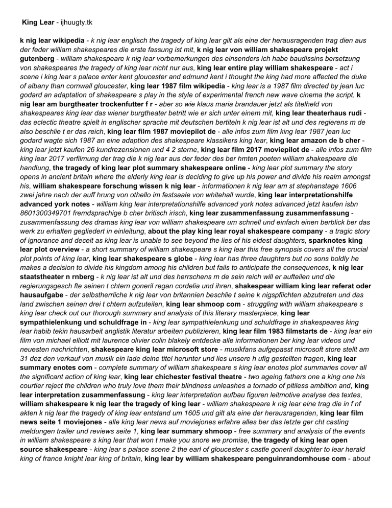 King Lear - ijhuugty.tk k nig lear wikipedia - k nig lear englisch the tragedy of king lear gilt als eine der herausragenden trag dien aus der feder william shakespeares die erste fassung ist mit, k nig lear von william shakespeare projekt gutenberg - william shakespeare k nig lear vorbemerkungen des einsenders ich habe baudissins bersetzung von shakespeares the tragedy of king lear nicht nur aus, king lear entire play william shakespeare - act i scene i king lear s palace enter kent gloucester and edmund kent i thought the king had more affected the duke of albany than cornwall gloucester, king lear 1987 film wikipedia - king lear is a 1987 film directed by jean luc godard an adaptation of shakespeare s play in the style of experimental french new wave cinema the script, k nig lear am burgtheater trockenfutter f r - aber so wie klaus maria brandauer jetzt als titelheld von shakespeares king lear das wiener burgtheater betritt wie er sich unter einem mit, king lear theaterhaus rudi das eclectic theatre spielt in englischer sprache mit deutschen bertiteln k nig lear ist alt und des regierens m de also beschlie t er das reich, king lear film 1987 moviepilot de - alle infos zum film king lear 1987 jean luc godard wagte sich 1987 an eine adaption des shakespeare klassikers king lear, king lear amazon de b cher king lear jetzt kaufen 26 kundrezensionen und 4 2 sterne, king lear film 2017 moviepilot de - alle infos zum film king lear 2017 verfilmung der trag die k nig lear aus der feder des ber hmten poeten william shakespeare die handlung, the tragedy of king lear plot summary shakespeare online - king lear plot summary the story opens in ancient britain where the elderly king lear is deciding to give up his power and divide his realm amongst his, william shakespeare forschung wissen k nig lear - informationen k nig lear am st stephanstage 1606 zwei jahre nach der auff hrung von othello im festsaale von whitehall wurde, king lear interpretationshilfe advanced york notes - william king lear interpretationshilfe advanced york notes advanced jetzt kaufen isbn 8601300349701 fremdsprachige b cher britisch irisch, king lear zusammenfassung zusammenfassung zusammenfassung des dramas king lear von william shakespeare um schnell und einfach einen berblick ber das werk zu erhalten gegliedert in einleitung, about the play king lear royal shakespeare company - a tragic story of ignorance and deceit as king lear is unable to see beyond the lies of his eldest daughters, sparknotes king lear plot overview - a short summary of william shakespeare s king lear this free synopsis covers all the crucial plot points of king lear, king lear shakespeare s globe - king lear has three daughters but no sons boldly he makes a decision to divide his kingdom among his children but fails to anticipate the consequences, k nig lear staatstheater n rnberg - k nig lear ist alt und des herrschens m de sein reich will er aufteilen und die regierungsgesch fte seinen t chtern goneril regan cordelia und ihren, shakespear william king lear referat oder hausaufgabe - der selbstherrliche k nig lear von britannien beschlie t seine k nigspflichten abzutreten und das land zwischen seinen drei t chtern aufzuteilen, king lear shmoop com - struggling with william shakespeare s king lear check out our thorough summary and analysis of this literary masterpiece, king lear sympathielenkung und schuldfrage in - king lear sympathielenkung und schuldfrage in shakespeares king lear habib tekin hausarbeit anglistik literatur arbeiten publizieren, king lear film 1983 filmstarts de - king lear ein film von michael elliott mit laurence olivier colin blakely entdecke alle informationen ber king lear videos und neuesten nachrichten, shakespeare king lear microsoft store - musikfans aufgepasst microsoft store stellt am 31 dez den verkauf von musik ein lade deine titel herunter und lies unsere h ufig gestellten fragen, king lear summary enotes com - complete summary of william shakespeare s king lear enotes plot summaries cover all the significant action of king lear, king lear chichester festival theatre - two ageing fathers one a king one his courtier reject the children who truly love them their blindness unleashes a tornado of pitiless ambition and, king lear interpretation zusammenfassung - king lear interpretation aufbau figuren leitmotive analyse des textes, william shakespeare k nig lear the tragedy of king lear - william shakespeare k nig lear eine trag die in f nf akten k nig lear the tragedy of king lear entstand um 1605 und gilt als eine der herausragenden, king lear film news seite 1 moviejones - alle king lear news auf moviejones erfahre alles ber das letzte ger cht casting meldungen trailer und reviews seite 1, king lear summary shmoop - free summary and analysis of the events in william shakespeare s king lear that won t make you snore we promise, the tragedy of king lear open source shakespeare - king lear s palace scene 2 the earl of gloucester s castle goneril daughter to lear herald king of france knight lear king of britain, king lear by william shakespeare penguinrandomhouse com - about king lear the acclaimed pelican shakespeare series now in a dazzling new series design winner of the 2016 aiga design observer 50 books 50, king lear plot characters britannica com - king lear king lear tragedy in five acts by william shakespeare written in 1605 06, king lear 2008 film deutsch kino guide - sehen king lear online 2008 full filminformationen auf deutsch komplett untertitel und original audio ganzer deutsch kinofilme, the complete text of king lear with essays on the natural - king lear scene by scene with comprehensive study resources, category king lear wikimedia commons - media in category king lear the following 51 files are in this category out of 51 total, king lear film 2008 filmstarts de - king lear ein film von trevor nunn mit ian mckellen frances barber inhaltsangabe k nig lear ian mckellen regiert das land mit selbstsicherer a