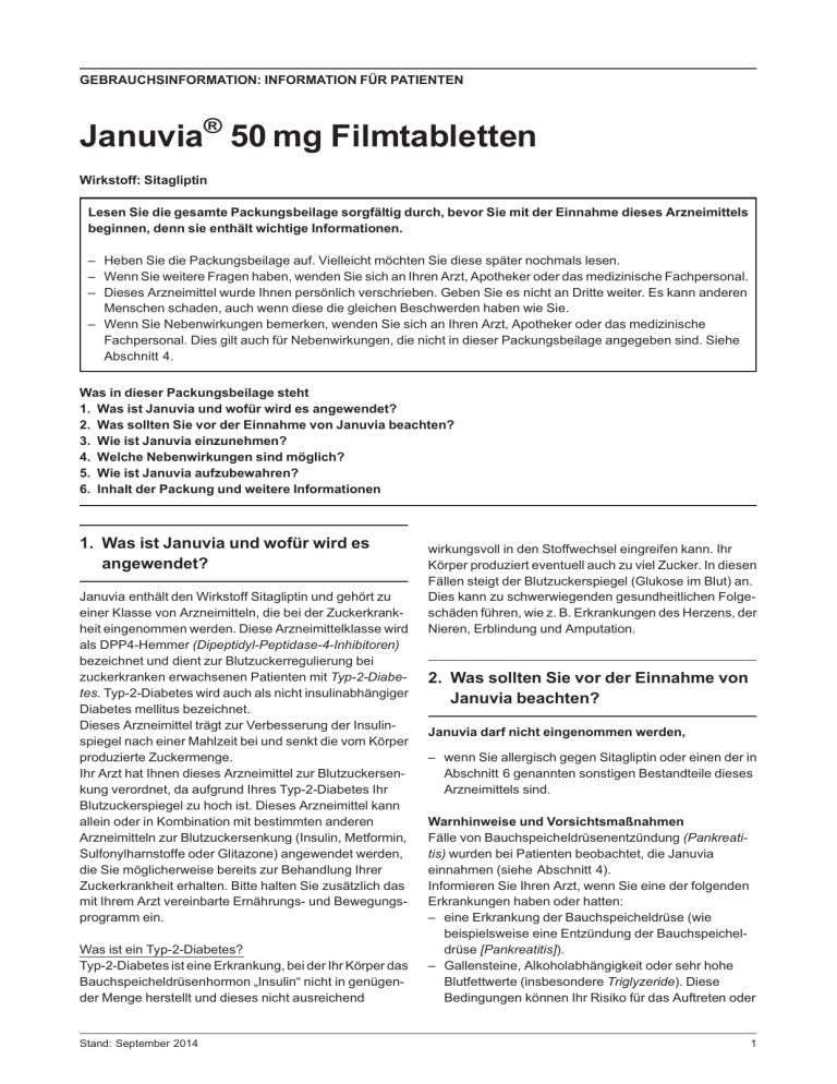 GEBRAUCHSINFORMATION: INFORMATION FÜR PATIENTEN Januvia® 50 mg Filmtabletten Wirkstoff: Sitagliptin Lesen Sie die gesamte Packungsbeilage sorgfältig durch, bevor Sie mit der Einnahme dieses Arzneimittels beginnen, denn sie enthält wichtige Informationen. – Heben Sie die Packungsbeilage auf. Vielleicht möchten Sie diese später nochmals lesen. – Wenn Sie weitere Fragen haben, wenden Sie sich an Ihren Arzt, Apotheker oder das medizinische Fachpersonal. – Dieses Arzneimittel wurde Ihnen persönlich verschrieben. Geben Sie es nicht an Dritte weiter. Es kann anderen Menschen schaden, auch wenn diese die gleichen Beschwerden haben wie Sie. – Wenn Sie Nebenwirkungen bemerken, wenden Sie sich an Ihren Arzt, Apotheker oder das medizinische Fachpersonal. Dies gilt auch für Nebenwirkungen, die nicht in dieser Packungsbeilage angegeben sind. Siehe Abschnitt 4. Was in dieser Packungsbeilage steht 1. Was ist Januvia und wofür wird es angewendet? 2. Was sollten Sie vor der Einnahme von Januvia beachten? 3. Wie ist Januvia einzunehmen? 4. Welche Nebenwirkungen sind möglich? 5. Wie ist Januvia aufzubewahren? 6. Inhalt der Packung und weitere Informationen 1. Was ist Januvia und wofür wird es angewendet? Januvia enthält den Wirkstoff Sitagliptin und gehört zu einer Klasse von Arzneimitteln, die bei der Zuckerkrankheit eingenommen werden. Diese Arzneimittelklasse wird als DPP4-Hemmer (Dipeptidyl-Peptidase-4-Inhibitoren) bezeichnet und dient zur Blutzuckerregulierung bei zuckerkranken erwachsenen Patienten mit Typ-2-Diabetes. Typ-2-Diabetes wird auch als nicht insulinabhängiger Diabetes mellitus bezeichnet. Dieses Arzneimittel trägt zur Verbesserung der Insulinspiegel nach einer Mahlzeit bei und senkt die vom Körper produzierte Zuckermenge. Ihr Arzt hat Ihnen dieses Arzneimittel zur Blutzuckersenkung verordnet, da aufgrund Ihres Typ-2-Diabetes Ihr Blutzuckerspiegel zu hoch ist. Dieses Arzneimittel kann allein oder in Kombination mit bestimmten anderen Arzneimitteln zur Blutzuckersenkung (Insulin, Metformin, Sulfonylharnstoffe oder Glitazone) angewendet werden, die Sie möglicherweise bereits zur Behandlung Ihrer Zuckerkrankheit erhalten. Bitte halten Sie zusätzlich das mit Ihrem Arzt vereinbarte Ernährungs- und Bewegungsprogramm ein. Was ist ein Typ-2-Diabetes? Typ-2-Diabetes ist eine Erkrankung, bei der Ihr Körper das Bauchspeicheldrüsenhormon „Insulin“ nicht in genügender Menge herstellt und dieses nicht ausreichend Stand: September 2014 wirkungsvoll in den Stoffwechsel eingreifen kann. Ihr Körper produziert eventuell auch zu viel Zucker. In diesen Fällen steigt der Blutzuckerspiegel (Glukose im Blut) an. Dies kann zu schwerwiegenden gesundheitlichen Folgeschäden führen, wie z. B. Erkrankungen des Herzens, der Nieren, Erblindung und Amputation. 2. Was sollten Sie vor der Einnahme von Januvia beachten? Januvia darf nicht eingenommen werden, – wenn Sie allergisch gegen Sitagliptin oder einen der in Abschnitt 6 genannten sonstigen Bestandteile dieses Arzneimittels sind. Warnhinweise und Vorsichtsmaßnahmen Fälle von Bauchspeicheldrüsenentzündung (Pankreatitis) wurden bei Patienten beobachtet, die Januvia einnahmen (siehe Abschnitt 4). Informieren Sie Ihren Arzt, wenn Sie eine der folgenden Erkrankungen haben oder hatten: – eine Erkrankung der Bauchspeicheldrüse (wie beispielsweise eine Entzündung der Bauchspeicheldrüse [Pankreatitis]). – Gallensteine, Alkoholabhängigkeit oder sehr hohe Blutfettwerte (insbesondere Triglyzeride). Diese Bedingungen können Ihr Risiko für das Auftreten oder 1 Gebrauchsinformation: Information für den Anwender Januvia® 50 mg Filmtabletten Wiederauftreten einer Entzündung der Bauchspeicheldrüse erhöhen. – die als Diabetes mellitus Typ 1 (insulinabhängiger Diabetes) bezeichnete Zuckerkrankheit. – eine Komplikation der Zuckerkrankheit mit hohen Blutzuckerspiegeln, schnellem Gewichtsverlust, Übelkeit oder Erbrechen (diabetische Ketoazidose). – alle gegenwärtigen und vergangenen Nierenfunktionsstörungen in Ihrer Krankengeschichte. – eine allergische Reaktion auf Januvia (siehe Abschnitt 4). Es ist unwahrscheinlich, dass dieses Arzneimittel zu einer Unterzuckerung (Hypoglykämie) führt, da es bei niedrigem Blutzuckerspiegel nicht wirkt. Wenn Sie dieses Arzneimittel jedoch zusammen mit einem Sulfonylharnstoff-haltigen Arzneimittel oder mit Insulin anwenden, kann Ihr Blutzucker stark abfallen (Hypoglykämie). Möglicherweise wird Ihr Arzt die Dosis Ihres Sulfonylharnstoff-haltigen Arzneimittels oder Insulins verringern. Kinder und Jugendliche Kinder und Jugendliche unter 18 Jahren sollten dieses Arzneimittel nicht einnehmen. Es ist nicht bekannt, ob dieses Arzneimittel sicher und wirksam ist, wenn es bei Kindern und Jugendlichen unter 18 Jahren angewendet wird. Einnahme von Januvia zusammen mit anderen Arzneimitteln Informieren Sie Ihren Arzt oder Apotheker, wenn Sie andere Arzneimittel einnehmen/anwenden, kürzlich andere Arzneimittel eingenommen/angewendet haben oder beabsichtigen andere Arzneimittel einzunehmen/ anzuwenden. Schwangerschaft und Stillzeit Wenn Sie schwanger sind oder stillen oder wenn Sie vermuten, schwanger zu sein, oder beabsichtigen, schwanger zu werden, fragen Sie vor der Einnahme dieses Arzneimittels Ihren Arzt oder Apotheker um Rat. Sie sollten dieses Arzneimittel während der Schwangerschaft nicht einnehmen. Es ist nicht bekannt, ob dieses Arzneimittel in die Muttermilch übergeht. Daher sollten Sie dieses Arzneimittel nicht einnehmen, wenn Sie stillen bzw. stillen wollen. Verkehrstüchtigkeit und Fähigkeit zum Bedienen von Maschinen Es ist nicht bekannt, ob dieses Arzneimittel Ihre Verkehrstüchtigkeit oder Ihre Fähigkeit zum Bedienen von Maschinen beeinträchtigen kann. Jedoch sollte beachtet werden, dass über Schwindel und Schläfrigkeit berichtet wurde, was Ihre Verkehrstüchtigkeit oder Ihre Fähigkeit zum Bedienen von Maschinen beeinträchtigen kann. Bei Einnahme dieses Arzneimittels in K