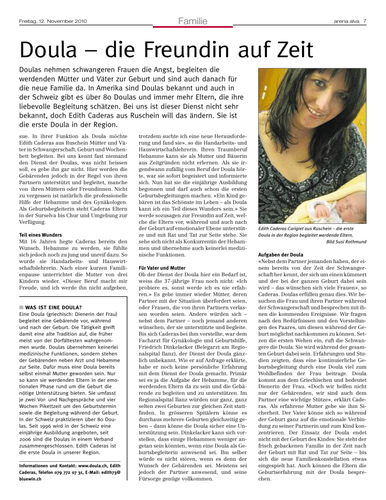 Freitag, 12. November 2010 Familie arena alva 7 Doula – die Freundin auf Zeit Doulas nehmen schwangeren Frauen die Angst, begleiten die werdenden Mütter und Väter zur Geburt und sind auch danach für die neue Familie da. In Amerika sind Doulas bekannt und auch in der Schweiz gibt es über 80 Doulas und immer mehr Eltern, die ihre liebevolle Begleitung schätzen. Bei uns ist dieser Dienst nicht sehr bekannt, doch Edith Caderas aus Ruschein will das ändern. Sie ist die erste Doula in der Region. sue. In ihrer Funktion als Doula möchte Edith Caderas aus Ruschein Mütter und Väter in Schwangerschaft, Geburt und Wochenbett begleiten. Bei uns kennt fast niemand den Dienst der Doulas, was nicht heissen soll, es gebe ihn gar nicht. Hier werden die Gebärenden jedoch in der Regel von ihren Partnern unterstützt und begleitet, manche von ihren Müttern oder Freundinnen. Nicht zu vergessen ist natürlich die professionelle Hilfe der Hebamme und des Gynäkologen. Als Geburtsbegleiterin steht Caderas Eltern in der Surselva bis Chur und Umgebung zur Verfügung. Teil eines Wunders Mit 16 Jahren hegte Caderas bereits den Wunsch, Hebamme zu werden, sie fühlte sich jedoch noch zu jung und unreif dazu. So wurde sie Handarbeits- und Hauswirtschaftslehrerin. Nach einer kurzen Familienpause unterrichtet die Mutter von drei Kindern wieder. «Dieser Beruf macht mir Freude, und ich werde ihn nicht aufgeben, ■ WAS IST EINE DOULA? Eine Doula (griechisch: Dienerin der Frau) begleitet eine Gebärende vor, während und nach der Geburt. Die Tätigkeit greift damit eine alte Tradition auf, die früher meist von der Dorfältesten wahrgenommen wurde. Doulas übernehmen keinerlei medizinische Funktionen, sondern stehen der Gebärenden neben Arzt und Hebamme zur Seite. Dafür muss eine Doula bereits selbst einmal Mutter geworden sein. Nur so kann sie werdenden Eltern in der emotionalen Phase rund um die Geburt die nötige Unterstützung bieten. Sie umfasst je zwei Vor- und Nachgespräche und vier Wochen Pikettzeit um den Geburtstermin sowie die Begleitung während der Geburt. In der Schweiz praktizieren über 80 Doulas. Seit 1996 wird in der Schweiz eine einjährige Ausbildung angeboten, seit 2006 sind die Doulas in einem Verband zusammengeschlossen. Edith Caderas ist die erste Doula in unserer Region. Informationen und Kontakt: www.doula.ch, Edith Caderas, Telefon 079 772 07 31, E-Mail: edith73@ bluewin.ch trotzdem suchte ich eine neue Herausforderung und fand sie», so die Handarbeits- und Hauswirtschafslehrerin. Ihren Traumberuf Hebamme kann sie als Mutter und Bäuerin aus Zeitgründen nicht erlernen. Als sie irgendwann zufällig vom Beruf der Doula hörte, war sie sofort begeistert und informierte sich. Nun hat sie die einjährige Ausbildung begonnen und darf auch schon die ersten Geburtsbegleitungen machen. «Ein Kind gebären ist das Schönste im Leben – als Doula kann ich ein Teil dieses Wunders sein.» Sie werde sozusagen zur Freundin auf Zeit, welche die Eltern vor, während und auch nach der Geburt auf emotionaler Ebene unterstütze und mit Rat und Tat zur Seite stehe. Sie sehe sich nicht als Konkurrentin der Hebammen und übernehme auch keinerlei medizinische Funktionen. Für Vater und Mutter Ob der Dienst der Doula hier ein Bedarf ist, weiss die 37-jährige Frau noch nicht: «Ich probiere es, sonst werde ich es nie erfahren.» Es gebe immer wieder Mütter, deren Partner mit der Situation überfordert seien, oder Frauen, die von ihren Partnern verlassen worden seien. Andere würden sich – nebst dem Partner – noch jemand anderen wünschen, der sie unterstützte und begleite. Bis sich Caderas bei ihm vorstellte, war dem Facharzt für Gynäkologie und Geburtshilfe, Friedrich Dinkelacker (Belegarzt am Regionalspital Ilanz), der Dienst der Doula gänzlich unbekannt. Wie er auf Anfrage erklärte, habe er noch keine persönliche Erfahrung mit dem Dienst der Doula gemacht. Primär sei es ja die Aufgabe der Hebamme, für die werdenden Eltern da zu sein und die Gebärende zu begleiten und zu unterstützen. Im Regionalspital Ilanz würden nur ganz, ganz selten zwei Geburten zur gleichen Zeit stattfinden. In grösseren Spitälern könne es durchaus mehrere Geburten gleichzeitig geben – dann könne die Doula sicher eine Unterstützung sein. Dinkelacker kann sich vorstellen, dass einige Hebammen weniger angetan sein könnten, wenn eine Doula als Geburtsbegleiterin anwesend sei. Ihn selber würde es nicht stören, wenn es denn der Wunsch der Gebärenden sei. Meistens sei jedoch der Partner anwesend, und seine Fürsorge genüge vollkommen. Edith Caderas-Carigiet aus Ruschein – die erste Doula in der Region begleitet werdende Eltern. Bild Susi Rothmund Aufgaben der Doula «Nebst dem Partner jemanden haben, der einem bereits von der Zeit der Schwangerschaft her kennt, der sich um einen kümmert und der bei der ganzen Geburt dabei sein wird – das wünschen sich viele Frauen», so Caderas. Doulas erfüllen genau dies. Wir besuchen die Frau und ihren Partner während der Schwangerschaft und besprechen mit ihnen die kommenden Ereignisse. Wir fragen nach den Bedürfnissen und den Vorstellungen des Paares, um diesen während der Geburt möglichst nachkommen zu können. Setzen die ersten Wehen ein, ruft die Schwangere die Doula: Sie wird während der gesamten Geburt dabei sein. Erfahrungen und Studien zeigten, dass eine kontinuierliche Geburtsbegleitung durch eine Doula viel zum Wohlbefinden der Frau beitrage. Doula kommt aus dem Griechischen und bedeutet Dienerin der Frau. «Doch wir helfen nicht nur der Gebärenden, wir sind auch dem Partner eine wichtige Stütze», erklärt Caderas. Als erfahrene Mutter gebe sie ihm Sicherheit. Der Vater könne sich so während der Geburt ganz auf die emotionale Verbindung zu seiner Partnerin und zum Kind konzentrieren. Der Einsatz der Doula endet nicht mit der Geburt des Kindes: Sie steht der frisch gebackenen Familie in der Zeit nach der Geburt mit Rat und Tat zur Seite – bi
