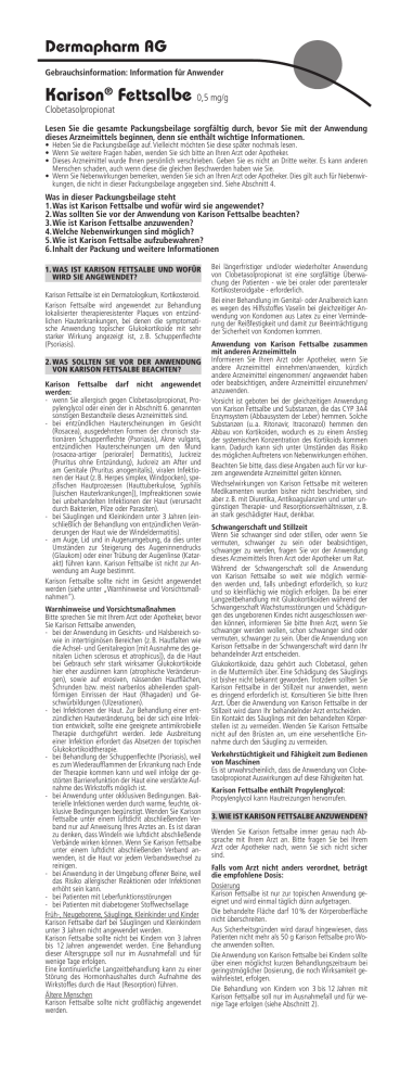 Dermapharm AG Gebrauchsinformation: Information für Anwender Karison® Fettsalbe 0,5 mg/g Clobetasolpropionat Lesen Sie die gesamte Packungsbeilage sorgfältig durch, bevor Sie mit der Anwendung dieses Arzneimittels beginnen, denn sie enthält wichtige Informationen. • Heben Sie die Packungsbeilage auf. Vielleicht möchten Sie diese später nochmals lesen. • Wenn Sie weitere Fragen haben, wenden Sie sich bitte an Ihren Arzt oder Apotheker. • Dieses Arzneimittel wurde Ihnen persönlich verschrieben. Geben Sie es nicht an Dritte weiter. Es kann anderen Menschen schaden, auch wenn diese die gleichen Beschwerden haben wie Sie. • Wenn Sie Nebenwirkungen bemerken, wenden Sie sich an Ihren Arzt oder Apotheker. Dies gilt auch für Nebenwirkungen, die nicht in dieser Packungsbeilage angegeben sind. Siehe Abschnitt 4. Was in dieser Packungsbeilage steht 1.Was ist Karison Fettsalbe und wofür wird sie angewendet? 2.Was sollten Sie vor der Anwendung von Karison Fettsalbe beachten? 3.Wie ist Karison Fettsalbe anzuwenden? 4.Welche Nebenwirkungen sind möglich? 5.Wie ist Karison Fettsalbe aufzubewahren? 6.Inhalt der Packung und weitere Informationen 1.WAS IST KARISON FETTSALBE UND WOFÜR WIRD SIE ANGEWENDET? Karison Fettsalbe ist ein Dermatologikum, Kortikosteroid. Karison Fettsalbe wird angewendet zur Behandlung lokalisierter therapieresistenter Plaques von entzünd­ lichen Hauterkrankungen, bei denen die symptomati­ sche Anwendung topischer Glukokortikoide mit sehr starker Wirkung angezeigt ist, z. B. Schuppenflechte (Psoriasis). 2.WAS SOLLTEN SIE VOR DER ANWENDUNG VON KARISON FETTSALBE BEACHTEN? Karison Fettsalbe darf nicht angewendet ­werden: - wenn Sie allergisch gegen Clobetasolpropionat, Pro­ pylenglycol oder einen der in Abschnitt 6. genannten sonstigen Bestandteile dieses Arzneimittels sind. -bei entzündlichen Hauterscheinungen im Gesicht (Rosacea), ausgedehnten Formen der chronisch sta­ tionären Schuppenflechte (Psoriasis), Akne vulgaris, entzündlichen Hauterscheinungen um den Mund (rosacea-artiger [perioraler] Dermatitis), Juckreiz ­(Pruritus ohne Entzündung), Juckreiz am After und am Genitale (Pruritus anogenitalis), viralen Infektio­ nen der Haut (z. B. Herpes simplex, Windpocken), spe­ zifischen Hautprozessen (Hauttuberkulose, Syphilis [luischen Hauterkrankungen]), Impfreaktionen sowie bei unbehandelten Infektionen der Haut (verursacht durch Bakterien, Pilze oder Parasiten). - bei Säuglingen und Kleinkindern unter 3 Jahren (ein­ schließlich der Behandlung von entzündlichen Verän­ derungen der Haut wie der Windeldermatitis). - am Auge, Lid und in Augenumgebung, da dies unter Umständen zur Steigerung des Augeninnendrucks (Glaukom) oder einer Trübung der Augenlinse (Katar­ akt) führen kann. Karison Fettsalbe ist nicht zur An­ wendung am Auge bestimmt. Karison Fettsalbe sollte nicht im Gesicht angewendet werden (siehe unter „Warnhinweise und Vorsichtsmaß­ nahmen“). Warnhinweise und Vorsichtsmaßnahmen Bitte sprechen Sie mit Ihrem Arzt oder Apotheker, bevor Sie Karison Fettsalbe anwenden, - bei der Anwendung im Gesichts- und Halsbereich so­ wie in intertriginösen Bereichen (z. B. Hautfalten wie die Achsel- und Genitalregion [mit Ausnahme des ge­ nitalen Lichen sclerosus et atrophicus]), da die Haut bei Gebrauch sehr stark wirksamer Glukokortikoide hier eher ausdünnen kann (atrophische Veränderun­ gen), sowie auf erosiven, nässenden Haut­flächen, Schrunden bzw. meist narbenlos abheilenden spalt­ förmigen Einrissen der Haut (Rhagaden) und Ge­ schwürbildungen (Ulzerationen). - bei Infektionen der Haut. Zur Behandlung einer ent­ zündlichen Hautveränderung, bei der sich eine Infek­ tion entwickelt, sollte eine geeignete antimikrobielle Therapie durchgeführt werden. Jede Ausbreitung einer Infektion erfordert das Absetzen der topischen Glukokortikoidtherapie. - bei Behandlung der Schuppenflechte (Psoriasis), weil es zum Wiederaufflammen der Erkrankung nach Ende der Therapie kommen kann und weil infolge der ge­ störten Barrierefunktion der Haut eine verstärkte Auf­ nahme des Wirkstoffs möglich ist. - bei Anwendung unter okklusiven Bedingungen. Bak­ terielle Infektionen werden durch warme, feuchte, ok­ klusive Bedingungen begünstigt. Wenden Sie Karison Fettsalbe unter einem luftdicht abschließenden Ver­ band nur auf Anweisung Ihres Arztes an. Es ist daran zu denken, dass Windeln wie luftdicht abschließende Verbände wirken können. Wenn Sie Karison Fettsalbe unter einem luftdicht abschließenden Verband an­ wenden, ist die Haut vor jedem Verbandswechsel zu reinigen. - bei Anwendung in der Umgebung offener Beine, weil das Risiko allergischer Reaktionen oder Infektionen erhöht sein kann. - bei Patienten mit Leberfunktionsstörungen - bei Patienten mit diabetogener Stoffwechsellage Früh-, Neugeborene, Säuglinge, Kleinkinder und Kinder Karison Fettsalbe darf bei Säuglingen und Kleinkindern unter 3 Jahren nicht angewendet werden. Karison Fettsalbe sollte nicht bei Kindern von 3 Jahren bis 12 Jahren angewendet werden. Eine Behandlung dieser Altersgruppe soll nur im Ausnahmefall und für wenige Tage erfolgen. Eine kontinuierliche Langzeitbehandlung kann zu einer Störung des Hormonhaushaltes durch Aufnahme des Wirkstoffes durch die Haut (Resorption) führen. Ältere Menschen Karison Fettsalbe sollte nicht großflächig angewendet werden. Bei längerfristiger und/oder wiederholter Anwendung von Clobetasolpropionat ist eine sorgfältige Überwa­ chung der Patienten - wie bei oraler oder parenteraler Kortikosteroidgabe - erforderlich. Bei einer Behandlung im Genital- oder Analbereich kann es wegen des Hilfsstoffes Vaselin bei gleichzeitiger An­ wendung von Kondomen aus Latex zu einer Verminde­ rung der Reißfestigkeit und damit zur Beeinträchtigung der Sicherheit von Kondomen kommen. Anwendung von Karison Fettsalbe zusammen mit anderen Arzneimitteln Informieren Sie Ihren Arzt oder Apotheker, wenn Sie andere Arzneimittel einnehmen/anwende