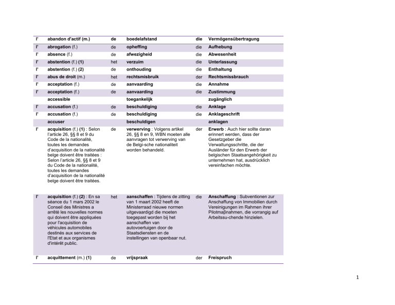 l’ abandon d'actif (m.) de boedelafstand die Vermögensübertragung l’ abrogation (f.) de opheffing die Aufhebung l’ absence (f.) de afwezigheid die Abwesenheit l’ abstention (f.) (1) het verzuim die Unterlassung l’ abstention (f.) (2) de onthouding die Enthaltung l’ abus de droit (m.) het rechtsmisbruik der Rechtsmissbrauch l’ acceptation (f.) de aanvaarding die Annahme l’ acceptation (f.) de aanvaarding die Zustimmung accessible toegankelijk zugänglich l’ accusation (f.) de beschuldiging die Anklage l’ accusation (f.) de beschuldiging die Anklageschrift accuser beschuldigen anklagen l’ acquisition (f.) (1) : Selon l’article 26, §§ 8 et 9 du Code de la nationalité, toutes les demandes d’acquisition de la nationalité belge doivent être traitées : Selon l’article 26, §§ 8 et 9 du Code de la nationalité, toutes les demandes d’acquisition de la nationalité belge doivent être traitées. de verwerving : Volgens artikel 26, §§ 8 en 9, WBN moeten alle aanvragen tot verwerving van de Belgi-sche nationaliteit worden behandeld. der Erwerb : Auch hier sollte daran erinnert werden, dass der Gesetzgeber die Verwaltungsschritte, die der Ausländer für den Erwerb der belgischen Staatsangehörigkeit zu unternehmen hat, ausdrücklich vereinfachen möchte. l’ acquisition (f.) (2) : En sa séance du 1 mars 2002 le Conseil des Ministres a arrêté les nouvelles normes qui doivent être appliquées pour l'acquisition de véhicules automobiles destinés aux services de l'Etat et aux organismes d'intérêt public. het aanschaffen : Tijdens de zitting van 1 maart 2002 heeft de Ministerraad nieuwe normen uitgevaardigd die moeten toegepast worden bij het aanschaffen van autovoertuigen door de Staatsdiensten en de instellingen van openbaar nut. die Anschaffung : Subventionen zur Anschaffung von Immobilien durch Vereinigungen im Rahmen ihrer Pilotmaβnahmen, die vorrangig auf Arbeitssu-chende hinzielen. l’ acquittement (m.) (1) de vrijspraak der Freispruch 1 l’ acquittement d'une dette (f) (2) de schuldbetaling die Schuldenbegleichung acquitter vrijspreken freisprechen s'acquitter zich kwijten van eine Schuld begleichen s'acquitter vereffenen eine Schuld begleichen l’ acte (m.) (1) de akte die Urkunde l’ acte (m.) (1) de akte der Akt l’ acte (m) (2) de handeling die Handlung l’ acte (m) (2) de handeling der Akt l’ acte (m) (2) de daad die Handlung l’ acte (m) (2) de daad der Akt l’ acte authentique (m.) het certificaat die öffentliche Urkunde l’ acte authentique (m.) het certificaat die authentische Urkunde l’ acte authentique (m.) de authentieke akte die öffentliche Urkunde l’ acte authentique (m.) de authentieke akte die authentische Urkunde l’ action (f.) (1) het aandeel die Aktie l’ action (f.) (2) de vordering die Klage admettre toelaten zulassen l’ administration (f.) het beheer die Verwaltung l’ administration (f.) de administratie die Verwaltung l’ administration de la preuve (f.) admissibilité (f.) de bewijsvoering die Beweisführung de toelaatbaarheid die Zulässigkeit l’ être admissible l’ adoptant (m.) toelaatbaar zijn de adoptant zulässig sein der Adoptierende agir contre optreden tegen auftreten gegen (in einem Verfahren) agréer une demande een verzoek inwilligen einen Antrag bewilligen agréer une demande een verzoek inwilligen einem Antrag stattgeben aliéner des biens goederen vervreemden Güter veräuβern 2 alléguer beweren anführen allouer, octroyer die gewähren, bewilligen, zuerkennen Geldbuβe l’ amende (f.) de toekennen, toewijzen, verlenen geldboete l’ amendement (m.) het amendement der Abänderungsantrag l’ amendement (m.) het amendement die Abänderung l’ annulation (f.) de vernietiging die Nichtig(keits)erklärung l’ annulation (f.) de nietigverklaring die Nichtig(keits)erklärung apatride staatloos staatenlos apatride zonder vaderland staatenlos apparenté verwant verwandt l’ appel (m.) het hoger beroep die Berufung l’ appelant (m.) de appellant der Berufungskläger l’ application immédiate (f.) de onmiddellijke toepassing die sofortige Anwendung l’ approbation (f.) de goedkeuring die Zustimmung l’ approbation (f.) de goedkeuring die Billigung l’ arbitrage (m.) de arbitrage der Schiedsspruch l’ arbitrage (m.) de arbitrage das Schiedsverfahren arbitraire willekeurig willkürlich l’ arbitre (m.) de scheidsrechter der Schiedsrichter l’ argumentation (f.) het betoog die Argumentation l’ arrestation (f.) de arrestatie die Festnahme l’ arrêt (m.) het arrest der Entscheid l’ arrêt interlocutoire (m.) het voorlopig arrest der Zwischenentscheid l’ arrêt interlocutoire (m.) het tussentijds arrest der Zwischenentscheid l’ arrêté (m.) het besluit der Erlass l’ arrêté-loi (m.) de besluitwet das Erlassgesetz arrêter l’ assemblée (f.) aanhouden de (algemene) vergadering festnehmen die Versammlung 3 l’ assermenter beëdigen vereidigen assister bijstaan beistehen association sans but lucratif (ASBL) (f.) de assujettir l’ astreinte (f.) vereniging zonder winstoogmerk (v.z.w.) die onderwerpen de attacher : Attacher un effet au dépassement d’un délai dwangsom Vereinigung ohne Gewinnerzielungsabsich (VoG) unterwerfen das verbinden : Een gevolg verbinden aan het overschrijden van een termijn Zwangsgeld verbinden : Mit einer Fristüberschreitung eine Folge verbinden l’ atteinte à (f.) de aantasting die Verletzung l’ atteinte à (f.) de aantasting die Beeinträchtigung l’ atteinte à (f.) de schending van die Verletzung l’ atteinte à (f.) de schending van die Beeinträchtigung attribuer à toewijzen aan zuteilen l’ attribution (compétence) (f.) de bevoegdheid die Zuständigkeit l’ audience (f.) de zitting die Sitzung l’ audience d’introduction (f.) de inleidende zitting die Einleitungssitzung l’ auditeur (m.) de auditeur der Auditor l’ audition (f.) (1) het verhoor die Vernehmung l’ audition (f.) (2) de hoorzitting die Anhörung l’ a