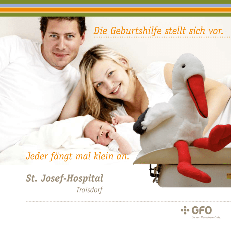 Die Geburtshilfe stellt sich vor. Jeder fängt mal klein an. St. Josef-Hospital Troisdorf Ja zur Menschenwürde. 1 Liebe werdende Eltern, liebe Angehörige und Freunde, wir begrüßen Sie ganz herzlich in der geburtshilflichen Abteilung des St. Josef-Hospitals in Troisdorf. Sie stehen kurz vor einem spannenden Ereignis, haben Fragen, Erwartungen und Zukunftspläne. Wir möchten Ihnen Geborgenheit vermitteln, mit dem Ziel jeder Frau ihre individuelle Geburt zu ermöglichen. Für unser Geburtsteam bedeutet das, immer ein offenes Ohr für Ihre Fragen und Wünsche zu haben, Zurückhaltung bei Medikamenten und der apparativen Überwachung, ohne dabei die Sicherheit von Mutter und Kind aus dem Blick zu verlieren. Jede Geburt ist einzigartig. Deshalb haben wir Gebote und Verbote aus der Gedankenwelt gestrichen und möchten die Bedürfnisse „unserer“ Mütter als Ansporn empfinden. Unserer medizinischen Kompetenz können Sie sicher sein. Jedoch gehört für unser Team auch emotionale Wärme und ein Klima mit viel Persönlichkeit zu diesem aufregenden Moment. Wir betreuen Sie liebevoll und mit empathischer Begleitung. Freuen Sie sich über einen Aufenthalt, den Sie als bereicherndes Ereignis mit Ruhe und großer Sicherheit erfahren werden, da das Wunder der Geburt ein ganz besonderer Moment ist. Wir möchten diese Zeit für Eltern und Kind so sanft und angenehm wie möglich gestalten. Dr. med Robert Kampmann, Leitender Arzt der Abteilung 2 Wir gehen jeden Schritt mit Ihnen Pränatal-Diagnostik. Wir begleiten Sie über den gesamten Zeitraum Ihrer Schwangerschaft und halten engen Kontakt zu Ihrem Frauenarzt. Anmeldung zur Hierfür bieten wir umfassende Untersuchungen: Pränatal-Diagnostik » Screening in der 12. Schwangerschaftswoche mit Nackenfaltenmessung und Risikoberechnung » Fruchtwasseruntersuchung in der 15. Schwangerschaftswoche » Screening in der 20. Schwangerschaftswoche, Organ-Ultraschall » Doppleruntersuchung » 4D Babywatching ab der 28. Schwangerschaftswoche (60,- Euro inkl. DVD) » Geburtsplanende Gespräche » Humangenetische Beratung Termine können Sie in der Schwangeren-Ambulanz vereinbaren. Tel. 02241 801-851 3 Für den Nachwuchs noch mal die Schulbank drücken · Elternschule Mamma Mia. Um Ihre Schwangerschaft sicher begleiten zu können und Sie ein positives Geburtserlebnis erfahren zu lassen, bietet Ihnen die Elternschule „Mamma Mia“ ganzjährig eine Geburtsvorbereitung an, z. B. Paar- Misch- und Frauenkurse. Sie mögen es lieber kompakt? Kein Problem. An Wochenenden werden zu bestimmten Terminen Wochenendcrashkurse angeboten. Unser Kursangebot macht Sie fit für alle Themen rund um die Schwangerschaft, Geburt, Wochenbett- und Stillzeit. Desweiteren bereiten wir Sie physisch auf das freudige Ereignis vor: mit Schwangerschaftsgymnastik, Atemtechnik und Entspannungsübungen können Sie der Geburt noch gelassener entgegen sehen. Die Kurse werden von erfahrenen Hebammen des Kreißsaalteams geleitet. Desweiteren bieten wir Kurse mit Schwangerschaftsschwimmen (Ute Renner-Bay 02222 931628) und die Einführung in die Säuglingspflege an. So finden Sie die Elternschule Diese befindet sich im „alten Krankenhaus“. Nehmen Sie den Haupteingang und gehen Sie hinunter in das Untergeschoss, dann links an der Kapelle vorbei den Gang entlang bis zum nächsten Treppenhaus, dort die 3. Tür links (ist mit „Elternschule“ beschriftet). Die einzelnen Termine und Kurszeiten entnehmen Sie bitte dem Elternschulflyer. Sollte dieser bereits vergriffen sein, informieren Sie sich bitte bei Hebamme Beate Stork, Tel. 02241 68856. 4 Schnuppern Sie Kreißsaalluft. Sie möchten gerne wissen was auf Sie zukommt? Das können wir gut verstehen. Deshalb laden wir Sie herzlich ein, unseren Kreißsaal Anmeldung zur vorab kennenzulernen. Geburt Besuchen Sie uns doch einmal ganz unverbindlich und lernen Sie unsere Atmosphäre und die Kreißsäle kennen. Die informativen Führungen werden jeden ersten Sonntag im Monat um 11 Uhr und jeden dritten Dienstag um 18 Uhr von einem leitenden Geburtshelfer und einer Hebamme durchgeführt. Eine Anmeldung zur Kreißsaalführung ist nicht erforderlich. Auf Wunsch besteht die Möglichkeit, sich in unserer Hebammen-Sprechstunde anzumelden. Diese findet jeden Mittwoch von 9-11 Uhr im Kreißsaal statt, Tel. 02241 801-856 (Ebenfalls können Sie unsere Hebammensprechstunde für offene Fragen in Anspruch nehmen.) Bei Fragen und Besonderheiten in Ihrer Krankengeschichte ist unsere Schwangerenambulanz gerne für Sie da. Bringen Sie bitte immer Ihren Mutterpass mit. (Tel. 02241 801-851) 5 Wir möchten dass Sie uns verstehen. Deshalb bieten wir auch türkisch-, russischund englischsprachige Hebammensprechstunden nach separater Vereinbarung an. Termine erfragen Sie bitte hierfür unter Tel. 02241 801-856. Wir wollen nur das Beste… … für Ihr Kind Sollte die Notwendigkeit einer sehr spezialisierten Behandlung bestehen, arbeiten wir selbstverständlich mit den umliegenden Häusern mit Kinderklinik sehr eng zusammen. Wir kommen gerne dem Wunsch der Mutter nach, dass Kind bei Auffälligkeiten oder Frühgeburten in die gewünschte Klinik zu verlegen. … für die werdende Mutter Sie dürfen sich bei unseren gynäkologischen Mitarbeitern im Hause gut aufgehoben fühlen. Regelmäßige Fortbildungen und der enge Kontakt zu unseren Patientinnen erweitern täglich unsere Erfahrungen und Bemühungen auf Ihre individuellen Bedürfnisse einzugehen. Einige unserer Hebammen arbeiten als Beleghebammen; Namen und Telefonnummern können Sie dem Elternschulflyer entnehmen. Manchmal verläuft eine Schwangerschaft jedoch nicht mustergültig und wir möchten, dass Sie sich auch in diesen Fällen bei uns bestens behandelt wissen. Sie können das komplette Team in unserem Hause zu Rate ziehen, da wir mit den Kollegen unserer anderen Fachabteilungen sehr eng zusammen arbeiten. Hier finden Sie kompetente Ansprechpartner aus den Bereichen Urologie, Orthopädie, Chirurgie, Innere Medizin, Physikali