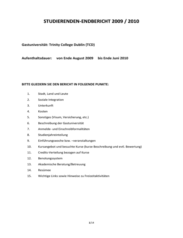 STUDIERENDEN-ENDBERICHT 2009 / 2010 Gastuniversität: Trinity College Dublin (TCD) Aufenthaltsdauer: von Ende August 2009 bis Ende Juni 2010 BITTE GLIEDERN SIE DEN BERICHT IN FOLGENDE PUNKTE: 1. Stadt, Land und Leute 2. Soziale Integration 3. Unterkunft 4. Kosten 5. Sonstiges (Visum, Versicherung, etc.) 6. Beschreibung der Gastuniversität 7. Anmelde- und Einschreibformalitäten 8. Studienjahreinteilung 9. Einführungswoche bzw. –veranstaltungen 10. Kursangebot und besuchte Kurse (kurze Beschreibung und evtl. Bewertung) 11. Credits-Verteilung bezogen auf Kurse 12. Benotungssystem 13. Akademische Beratung/Betreuung 14. Resümee 15. Wichtige Links sowie Hinweise zu Freizeitaktivitäten 1/14 1. Stadt, Land und Leute Dublin allgemein: Ist bekanntlich die Hauptstadt von Irland mit ca. 500.000 Einwohnern. 1/3 der Bevölkerung wohnen also direkt in der Hauptstadt. Dublin liegt an der Ostküste an der Mündung des Flusses Liffey, welcher in die Dublin Bay mündet. Dieser Fluss teilt die Stadt in einen Nord- und einen Südteil. Genauere Erläuterung siehe Wikipedia! Zur Orientierung: Die Postleitzahlen bestehen in Dublin aus max. zwei Zahlen, beginnend mit 1 und fortlaufend bis 24. Die Bezirke mit den geraden Zahlen liegen im Süden, die mit den ungeraden Postleitzahlen im Norden (eine gute Übersicht, welche sich als Orientierung bei der Suche nach einer Unterkunft bezahlt macht, ist unter folgendem Link zu finden: http://en.wikipedia.org/wiki/Dublin_postal_districts). Die wichtigsten Straßen im eigentlichen Zentrum sind sicherlich die O’Connell Street, mit dem Spire („Monument of Light“), die Parnell Street (Endhaltestellen einiger Buslinien) sowie die von dort leicht zu erreichenden Einkaufsstraßen Henry Street, Moore Street, Grafton Street, etc. Empfehlenswert ist die Anschaffung eines Dublin Reiseführers mit brauchbarem/detailliertem City-Atlas für Dublin). Das Trinity College liegt auf der Südseite Dublins direkt im Zentrum nahe der O’Connell Bridge und der Temple Bar – alles leicht zu Fuß zu erreichen! Zum Ausgehen/Fortgehen/Einkaufen: Im Prinzip ist jedes Pub – und Dublin ist Gott sei Dank mit einer großen Menge dieser gesegnet – zu empfehlen. Bier (Guinness) bzw. Cider gibt’s überall in rauen Mengen zu einem relativ leistbaren Preis von ca. 4 Euro bis 6 Euro zu haben (im City Center meist teurer). Die bekannteren Pubs sind sowieso alle zentral in der Temple Bar angesiedelt. Meist gibt’s kleine Snacks (Sandwiches, Chips) als auch die typischen irischen Spezialitäten wie Fish&Chips sowie Irish Stew (eine Art Eintopf aus Fleisch, Karotten und Kartoffeln) in Verbindung mit einem Bier billiger als getrennt also Ausschau halten nach den „Daily Specials“! Preislich zu empfehlen: Das Pub Fitzgerald`s auf der Südseite Dublins direkt am rechten Eck nach der O’Connell Bridge (vom Stadtzentrum Richtung Trinity College). Relativ touristisch, jedoch auch gemütlich ist auch das Pub „The Auld Dubliner“ in der Temple Bar. In der Moore Street gibt’s täglich einen Grünmarkt bzw. Fischmarkt – hier kann man billiges und (vor allem in den Sommermonaten) gutes Obst/Gemüse erstehen. Für Selbstversorger interessant: Für jegliche andere Lebensmittel: Supermarktketten wie Tesco, Aldi und Lidl bieten alles, was man zum Kochen benötigt – mit den „hauseigenen“ Produkten (wie z.B. Tesco Value Produkte) wird’s nochmals günstiger. Ebenfalls praktisch: Durchgehend alle Supermarktketten – und sei das Geschäft auch noch so klein – haben sieben Tage die Woche offen. Das anders geregelte Ladenöffnungszeitengesetz machts möglich! Zu Fuß unterwegs/Verkehr/Öffis: Dublin ist durchaus eine Stadt, welche Fußgänger in jeder Hinsicht benachteiligt. Keine Angst, es gibt Gehsteige, das schon, wenn dieser jedoch zu Ende ist, und man eine Straße zu überqueren hat, sollte man ja nicht in die Versuchung kommen, 2/14 auf die Ampelregelung zu vertrauen. Diese ist zwar vorhanden, jedoch wartet man als Fußgänger ewig – und das musste ich bisher bei jeder Ampel feststellen. Typische, aber nicht ungefährliche Reaktion jedes Menschen (natürlich auch die der Iren): Man verzichtet auf die bunten Lämpchen und läuft einfach mit vorherigem Schauen über die Straße. Vorsicht: Die Iren haben Linksverkehr! Warum auch immer…bei jeder größeren Kreuzung ist die Blickrichtung für die Fußgänger („Look left“, „Look right“) auf der Fahrbahn festgehalten. Man kann nun spekulieren, ob nicht eine sinnvoll geregelte Ampelanlage auf jeder Kreuzung billiger und wirkungsvoller ist… Einige wenige Fußgängerzonen befinden sich beispielsweise in der Henry Street (eine der Einkaufsstraßen, direkt nach dem General Post Office (GPO) an der O’Connell Street), in einem Teil der Temple Bar, sowie beispielsweise in der gesamten Grafton Street. Der öffentliche Verkehr ist in Dublin mittlerweile gut ausgebaut – wenn auch noch teuer und relativ kompliziert zu bezahlen. Eine Fahrt über 8 Stationen kostet etwa 1,60 Euro. Hat man kein Ticket (eine Auswahl davon auf http://www.dublinbus.ie/en/Fares--Tickets/), muss man dieses Geld genau abgezählt – der Fahrer kann kein Retourgeld geben – vor dem Fahrer in eine Zählmaschine werfen. Diese druckt dann auch das Ticket aus, welches man im Falle einer Kontrolle vorweisen muss. Es gibt auch zwei neue LUAS Linien (Straßenbahnen) sowie DARTs (Züge, welche das Umland von Dublin, vor allem die Küsten, mit der Hauptstadt verbinden). Wohnt man nahe dem Zentrum (Dublin 1 oder 2, im letzteren Viertel befindet sich auch das Trinity College), kann man getrost auf den öffentlichen Verkehr verzichten! Näheres dazu beim zweiten Punkt „Unterkunft“. Noch etwas sei angesprochen: Genaue Straßenbezeichnungen an den Hauswänden sucht man vergeblich. Hie und da kommt es vor, dass ein Schild die Richtung zum City Center anzeigt, ansonsten ist es aber schwierig, ohne Nachfragen den Namen der Straße zu erfahren. Die Iren: Sind sehr umgängli