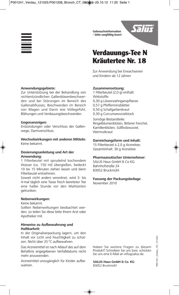 P001241_Verdau_121025:P001208_Bronch_CT_090423 25.10.12 11:20 Seite 1 Gebrauchsinformation – bitte sorgfältig lesen! Verdauungs-Tee N Kräutertee Nr. 18 Zur Anwendung bei Erwachsenen und Kindern ab 12 Jahren Anwendungsgebiete: Zur Unterstützung bei der Behandlung von nichtentzündlichen Gallenblasenbeschwerden und bei Störungen im Bereich des Gallenabflusses; Beschwerden im Bereich von Magen und Darm wie Völlegefühl, Blähungen und Verdauungsbeschwerden. Gegenanzeigen: Entzündungen oder Verschluss der Gallenwege; Darmverschluss Wechselwirkungen mit anderen Mitteln: Keine bekannt. Dosierungsanleitung und Art der Anwendung: 1 Filterbeutel mit sprudelnd kochendem Wasser (ca. 150 ml) übergießen, bedeckt 10 bis 15 Minuten ziehen lassen und dann Filterbeutel entnehmen. Soweit nicht anders verordnet, wird 3- bis 4-mal täglich eine Tasse frisch bereiteter Tee eine halbe Stunde vor den Mahlzeiten getrunken. Zusammensetzung: 1 Filterbeutel (2,0 g) enthält: Wirkstoffe: 0,30 g Löwenzahnganzpflanze 0,57 g Pfefferminzblätter 0,50 g Schafgarbenkraut 0,30 g Curcumawurzelstock Sonstige Bestandteile: Ringelblumenblüten, Bitterer Fenchel, Kamillenblüten, Süßholzwurzel, Wermutkraut Darreichungsform und Inhalt: 15 Filterbeutel à 2,0 g Arzneitee; Gesamtinhalt: 30 g Arzneitee Pharmazeutischer Unternehmer: SALUS Haus GmbH & Co KG Bahnhofstraße 24 83052 Bruckmühl Fassung der Packungsbeilage: November 2010 Hinweise zu Aufbewahrung und Haltbarkeit: In der Originalverpackung lagern, um den Inhalt vor Licht und Feuchtigkeit zu schützen. Nicht über 25 °C aufbewahren. Das Arzneimittel ist nach Ablauf des auf dem Behältnis angegebenen Verfalldatums nicht mehr anzuwenden. Arzneimittel unzugänglich für Kinder aufbewahren. Haben Sie weitere Fragen zu diesem Produkt? Schreiben Sie uns bzw. schicken Sie uns eine E-Mail an info@salus.de. SALUS Haus GmbH & Co. KG 83052 Bruckmühl P001241_Verdau_15F_121025 Nebenwirkungen: Keine bekannt. Sollten Nebenwirkungen beobachtet werden, so teilen Sie diese bitte Ihrem Arzt oder Apotheker mit.