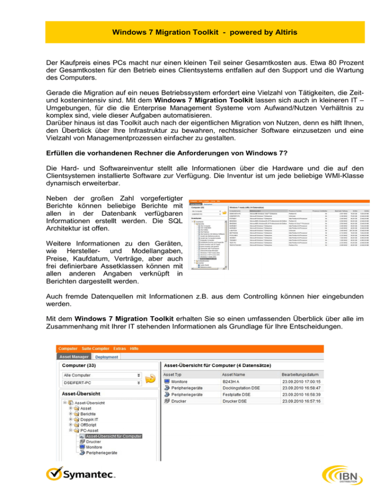 Windows 7 Migration Toolkit - powered by Altiris Der Kaufpreis eines PCs macht nur einen kleinen Teil seiner Gesamtkosten aus. Etwa 80 Prozent der Gesamtkosten für den Betrieb eines Clientsystems entfallen auf den Support und die Wartung des Computers. Gerade die Migration auf ein neues Betriebssystem erfordert eine Vielzahl von Tätigkeiten, die Zeitund kostenintensiv sind. Mit dem Windows 7 Migration Toolkit lassen sich auch in kleineren IT – Umgebungen, für die die Enterprise Management Systeme vom Aufwand/Nutzen Verhältnis zu komplex sind, viele dieser Aufgaben automatisieren. Darüber hinaus ist das Toolkit auch nach der eigentlichen Migration von Nutzen, denn es hilft Ihnen, den Überblick über Ihre Infrastruktur zu bewahren, rechtssicher Software einzusetzen und eine Vielzahl von Managementprozessen einfacher zu gestalten. Erfüllen die vorhandenen Rechner die Anforderungen von Windows 7? Die Hard- und Softwareinventur stellt alle Informationen über die Hardware und die auf den Clientsystemen installierte Software zur Verfügung. Die Inventur ist um jede beliebige WMI-Klasse dynamisch erweiterbar. Neben der großen Zahl vorgefertigter Berichte können beliebige Berichte mit allen in der Datenbank verfügbaren Informationen erstellt werden. Die SQL Architektur ist offen. Weitere Informationen zu den Geräten, wie Hersteller- und Modellangaben, Preise, Kaufdatum, Verträge, aber auch frei definierbare Assetklassen können mit allen anderen Angaben verknüpft in Berichten dargestellt werden. Auch fremde Datenquellen mit Informationen z.B. aus dem Controlling können hier eingebunden werden. Mit dem Windows 7 Migration Toolkit erhalten Sie so einen umfassenden Überblick über alle im Zusammenhang mit Ihrer IT stehenden Informationen als Grundlage für Ihre Entscheidungen. Windows 7 Migration Toolkit - powered by Altiris Welche Softwareprodukte sind im Einsatz? Wesentliche Voraussetzung für ein Softwarelizenzmanagement ist eine Produkterkennung, die aus den Inventurdaten verwertbare Produkt- und Versionsinformationen generiert. Das Windows 7 Migration Toolkit arbeitet mit einer regelbasierten Produkterkennung, bei der die Regeln nach den Erfordernissen selbst definiert werden. Damit können neben einzelnen Produkten und Versionen auch Gruppenregeln, z.B. „Alle Microsoftprodukte“ definiert werden. Vervollständigt werden die Daten durch Angaben zum Lizenztyp, sowie die Erfassung von Verträgen und Softwarekäufen, um im Ergebnis auf einfache Art und Weise eine „License Compliance“ für die IT-Umgebung darstellen zu können. Wie übernehme ich Daten und Einstellungen aus den Altsystemen? Mit PC Transplant, einem Bestandteil der Altiris Deployment Solution übernehmen Sie nach Ihren Vorgaben alle gewünschten System-, Nutzer- und Applikationseinstellungen sowie Daten von den bisherigen Rechnern und übertragen sie versionsübergreifend auf die Windows 7 Systeme. Windows 7 Migration Toolkit - powered by Altiris Betriebssysteminstallation und Applikationsbereitstellung Für den Windows 7 Rollout nutzt das Windows 7 Migration Toolkit die marktführende Symantec Deployment Technologie für „Unattended OS Installation“ oder imagebasierte Betriebssysteminstallation. Vorgefertigte Setuproutinen für Windows 7 werden mitgeliefert und können nach Ihren Bedürfnissen angepasst werden. Die Altiris Deployment Solution unterstützt neben den Microsoft Windows Betriebssystemen auch zahlreiche UNIX- und LINUX Versionen und eignet sich nach der Migrationsphase für ein dauerhaftes Management Ihrer IT-Infrastruktur. Mit der Altiris Deployment Applikationen, Patches und der Basis von Standardsetups, RPM und verteilt werden. Solution können Servicepacks auf MSI-Technologie, weiterer Formate Mit der Integration der Altiris SVS Solution (120 Tage Testlizenz) besteht die Möglichkeit, neben der klassischen Softwareverteilung Applikationen virtuell bereitzustellen. Damit werden Softwaremigrationszyklen verlängert und Konflikte von Programmen untereinander vermieden. Systemadministration Das Windows 7 Migration Toolkit enthält darüber hinaus umfangreiche Möglichkeiten zur Administration der IT-Systeme: Integration von Administrationsskripten Wake On LAN, Shutdown und Reboot Konfiguration der Systemund Netzwerkeinstellung Systemadministration via Fernzugriff unter Einbeziehung beliebiger Remote-Tools Imagebackup und Wiederherstellung Integration von Symantec BESR zur inkrementellen Sicherung von Rechnern und Datenbeständen möglich • Unterstützung für HP Thin Windows 7 Migration Toolkit - powered by Altiris Das Windows Migration Toolkit unterstützt alle Migrationsschritte nach Windows 7 optimal und automatisiert somit die sonst sehr arbeitsintensiven Projektschritte. Mit den Tools von Symantec erfolgt Ihre Migration auf Windows 7 effizient und führt zu einer positiven IT-Umstrukturierung. Das nennen wir den intelligenten Weg zu Windows 7. Ziel ist es, im Zuge der Migration mit geringem Aufwand und in kleinen Schritten eine effizientere Infrastruktur zu erhalten, die Benutzerfreundlichkeit und Sicherheit zu erhöhen und einen unterbrechungsfreien Geschäftsbetrieb zu erreichen. Ihr Window 7 Migration Toolkit bietet Ihnen dauerhaft folgende Vorteile: • • • • • • • • • Hardwareinventur Softwareinventur Einfache Software Lizenzverwaltung Direkte Anbindung von beliebigen Microsoft SQL Datenquellen Import von beliebigen Daten im xls und csv Format Übernahme von Daten und Einstellungen aus Ihren Altsystemen Einfache Administration Ihrer IT Systeme Deployment und Softwareverteilung auch für Linux und Unixsysteme Managementlösung für Thin Clints, Notebooks, PC’s und Server . Systemvoraussetzungen • • • • • • • Windows 2003 SP2 Server oder höher Internet Information Server 6.0 oder höher Microsoft SQL 2005 SP2 Express Edition Microsoft .NET Framework 2.0 Server und Client TCP/IP Netzwerk DHCP und PXE fähige Netzwerkkarte auf den Clientsystemen (opti