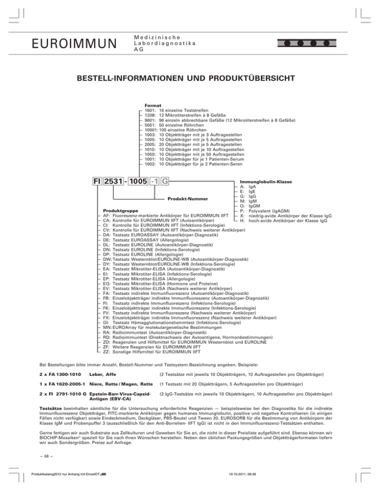 EUROIMMUN Medizinische Labordiagnostika AG BESTELL-INFORMATIONEN UND PRODUKTÜBERSICHT — — — — — — — — — — — — Format 1601: 16 einzelne Teststreifen 1208: 12 Mikrotiterstreifen à 8 Gefäße 9601: 96 einzeln abbrechbare Gefäße (12 Mikrotiterstreifen à 8 Gefäße) 5001: 50 einzelne Röhrchen 10001: 100 einzelne Röhrchen 1003: 10 Objektträger mit je 3 Auftragestellen 1005: 10 Objektträger mit je 5 Auftragestellen 2005: 20 Objektträger mit je 5 Auftragestellen 1010: 10 Objektträger mit je 10 Auftragestellen 1050: 10 Objektträger mit je 50 Auftragestellen 1001: 10 Objektträger für je 1 Patienten-Serum 1002: 10 Objektträger für je 2 Patienten-Seren FI 2531 - 1005 -1 G Produkt-Nummer — — — — — — — — — — — — — — — — — — — — — — — — — — — — — — — — — — — — — Immunglobulin-Klasse A: IgA E: IgE G: IgG M: IgM O: IgGM P: Polyvalent (IgAGM) X: niedrig-avide Antikörper der Klasse IgG H: hoch-avide Antikörper der Klasse IgG Produktgruppe AF: Fluoreszenz-markierte Antikörper für EUROIMMUN IIFT CA: Kontrolle für EUROIMMUN IIFT (Autoantikörper) CI: Kontrolle für EUROIMMUN IIFT (Infektions-Serologie) CV: Kontrolle für EUROIMMUN IIFT (Nachweis weiterer Antikörper) DA: Testsatz EUROASSAY (Autoantikörper-Diagnostik) DE: Testsatz EUROASSAY (Allergologie) DL: Testsatz EUROLINE (Autoantikörper-Diagnostik) DN: Testsatz EUROLINE (Infektions-Serologie) DP: Testsatz EUROLINE (Allergologie) DW: Testsatz Westernblot/EUROLINE-WB (Autoantikörper-Diagnostik) DY: Testsatz Westernblot/EUROLINE-WB (Infektions-Serologie) EA: Testsatz Mikrotiter-ELISA (Autoantikörper-Diagnostik) EI: Testsatz Mikrotiter-ELISA (Infektions-Serologie) EP: Testsatz Mikrotiter-ELISA (Allergologie) EQ: Testsatz Mikrotiter-ELISA (Hormone und Proteine) EV: Testsatz Mikrotiter-ELISA (Nachweis weiterer Antikörper) FA: Testsatz indirekte Immunfluoreszenz (Autoantikörper-Diagnostik) FB: Einzelobjektträger indirekte Immunfluoreszenz (Autoantikörper-Diagnostik) FI: Testsatz indirekte Immunfluoreszenz (Infektions-Serologie) FK: Einzelobjektträger indirekte Immunfluoreszenz (Infektions-Serologie) FV: Testsatz indirekte Immunfluoreszenz (Nachweis weiterer Antikörper) FX: Einzelobjektträger indirekte Immunfluoreszenz (Nachweis weiterer Antikörper) GI: Testsatz Hämagglutionationshemmtest (Infektions-Serologie) MN: EUROArray für molekulargenetische Bestimmungen RA: Radioimmuntest (Autoantikörper-Diagnostik) RD: Radioimmuntest (Direktnachweis der Autoantigene, Hormonbestimmungen) ZD: Reagenzien und Hilfsmittel für EUROIMMUN Westernblot und EUROLINE ZF: Weitere Reagenzien für EUROIMMUN IIFT ZZ: Sonstige Hilfsmittel für EUROIMMUN IIFT Bei Bestellungen bitte immer Anzahl, Bestell-Nummer und Testsystem-Bezeichnung angeben. Beispiele: 2 x FA 1300-1010 Leber, Affe (2 Testsätze mit jeweils 10 Objektträgern, 10 Auftragestellen pro Objektträger) 1 x FA 1620-2005-1 Niere, Ratte / Magen, Ratte (1 Testsatz mit 20 Objektträgern, 5 Auftragestellen pro Objektträger) 2 x FI 2791-1010 G Epstein-Barr-Virus-CapsidAntigen (EBV-CA) (2 IgG-Testsätze mit jeweils 10 Objektträgern, 10 Auftragestellen pro Objektträger) Testsätze beeinhalten sämtliche für die Untersuchung erforderliche Reagenzien — beispielsweise bei den Diagnostika für die indirekte Immunfluoreszenz Objektträger, FITC-markierte Antikörper gegen humanes Immunglobulin, positive und negative Kontrollseren (in einigen Fällen nicht verfügbar) sowie Eindeckmedium, Deckgläser, PBS-Beutel und Tween 20. EUROSORB für die Bestimmung von Antikörpern der Klasse IgM und Probenpuffer 3 (ausschließlich für den Anti-Borrelien- IIFT IgG) ist nicht in den Immunfluoreszenz-Testsätzen enthalten. Gerne fertigen wir auch Substrate aus Zellkulturen und Geweben für Sie an, die nicht in dieser Preisliste aufgeführt sind. Ebenso können wir BIOCHIP-Mosaiken® speziell für Sie nach Ihren Wünschen herstellen. Neben den üblichen Packungsgrößen und Objektträgerformaten liefern wir auch Sondergrößen. Preise auf Anfrage. — 68 — Produktkatalog2012 nur Anhang mit EinzelOT.p65 68 19.10.2011, 08:38 EUROIMMUN Medizinische Labordiagnostika AG Bestell-Nr. Antiserum Format Preis (€) AF 101-0115 AF 101-0160 FITC-markiertes Anti-Human-IgA (Ziege) 1,5 ml (gebrauchsfertig) 6,0 ml (gebrauchsfertig) 16,27 52,50 AF 102-0115 AF 102-0160 FITC-markiertes Anti-Human-IgG (Ziege) 1,5 ml (gebrauchsfertig) 6,0 ml (gebrauchsfertig) 16,27 52,50 AF 103-0115 AF 103-0160 FITC-markiertes Anti-Human-IgM (Ziege) 1,5 ml (gebrauchsfertig) 6,0 ml (gebrauchsfertig) 16,27 52,50 AF 106-0115 AF 106-0160 FITC-markiertes Anti-Human-IgAGM (IgA + IgG + IgM; Ziege) 1,5 ml (gebrauchsfertig) 6,0 ml (gebrauchsfertig) 16,27 52,50 AF 107-0115 AF 107-0160 FITC-markiertes Anti-Human-IgAG (IgA + IgG; Ziege) 1,5 ml (gebrauchsfertig) 6,0 ml (gebrauchsfertig) 16,27 52,50 AF 302-0115 AF 302-0160 FITC-markiertes Anti-Human-IgG (Ziege) Primaten-absorbiert 1,5 ml (gebrauchsfertig) 6,0 ml (gebrauchsfertig) 32,55 73,50 AF 601-0115 AF 601-0160 FITC-markiertes Anti-Human-IgA (Ziege) mit Evans-Blau 1,5 ml (gebrauchsfertig) 6,0 ml (gebrauchsfertig) 16,27 52,50 AF 602-0115 AF 602-0160 FITC-markiertes Anti-Human-IgG (Ziege) mit Evans-Blau 1,5 ml (gebrauchsfertig) 6,0 ml (gebrauchsfertig) 16,27 52,50 AF 603-0115 AF 603-0160 FITC-markiertes Anti-Human-IgM (Ziege) mit Evans-Blau 1,5 ml (gebrauchsfertig) 6,0 ml (gebrauchsfertig) 16,27 52,50 AF 606-0115 AF 606-0160 FITC-markiertes Anti-Human-IgAGM (IgA + IgG + IgM; Ziege) mit Evans-Blau 1,5 ml (gebrauchsfertig) 6,0 ml (gebrauchsfertig) 16,27 52,50 AF 607-0115 AF 607-0160 FITC-markiertes Anti-Human-IgAG (IgA + IgG; Ziege) mit Evans-Blau 1,5 ml (gebrauchsfertig) 6,0 ml (gebrauchsfertig) 16,27 52,50 AF 612-0115 AF 612-0160 FITC-markiertes Anti-Human-C3c (Ziege) mit Evans-Blau 1,5 ml (gebrauchsfertig) 6,0 ml (gebrauchsfertig) 16,27 52,50 AF 702-0115 AF 702-0160 FITC-markiertes Anti-Human-IgG (Ziege) mit 
