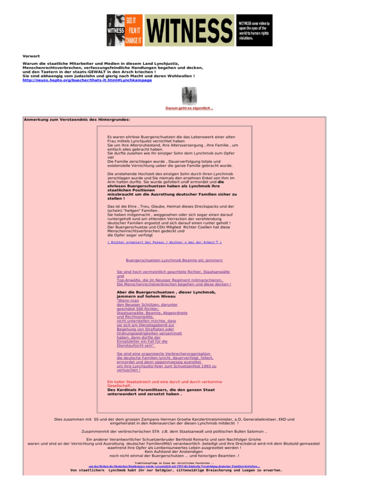 Vorwort Warum die staatliche Mitarbeiter und Medien in diesem Land Lynchjustiz, Menschenrechtsverbrechen, verfassungsfeindliche Handlungen begehen und decken, und den Taetern in der staats-GEWALT in den Arsch kriechen ! Sie sind abhaengig vom Judaslohn und gierig nach Macht und deren Wohlwollen ! http://neuss.hopto.org/buecher/thats-it.html#Lynchkampage Darum geht es eigentlich .. Anmerkung zum Verstaendnis des Hintergrundes: Es waren ehrlose Buergerschuetzen die das Lebenswerk einer alten Frau mittels Lynchjustiz vernichtet haben Sie um ihre Altersruhestand, ihre Altersversorgung , ihre Familie , um einfach alles gebracht haben. Sie durfte zusehen wie Ihr einziger Sohn dem Lynchmob zum Opfer viel Die Familie zerschlagen wurde , Dauerverfolgung totale und existenzielle Vernichtung ueber die ganze Familie gebracht wurde. Die anstehende Hochzeit des einzigen Sohn durch ihren Lynchmob zerschlagen wurde und Sie niemals den ersehnen Enkel von Ihm im Arm halten durfte. Sie wurde gefoltert undf ermordet und die ehrlosen Buergerschuetzen haben als Lynchmob ihre staatlichen Positionen missbraucht um die Ausrottung deutscher Familien sicher zu stellen ! Das ist die Ehre , Treu, Glaube, Heimat dieses Dreckspacks und der (schein) "heilgen" Familien . Sie haben mitgemacht , weggesehen oder sich sogar einen darauf runtergeholt iund am ehlenden Verrecken der verehlendung deutscher Familien ergoetzt und sich darauf einen runter geholt ! Der Buergerschuetze und CDU Mitglied Richter Coellen hat diese Menschenrechtsverbrechen gedeckt und die Opfer sogar verfolgt ( Richter ornaniert bei Pozess / Wichser n bei der Arbeit ? ) Buergerschuetzen Lynchmob Beamte etc jammern Sie sind hoch vermeintlich geachtete Richter, Staatsanwälte und Top-Anwälte, die im Neusser Regiment mitmarschieren. Die Menschenrechstverbrechen begehen und diese decken ! Aber die Buergerschuetzen , dieser Lynchmob, jammern auf hohem Niveau "Wenn man den Neusser Schützen, darunter geschätzt 500 Richter, Staatsanwälte, Beamte, Abgeordnete und Rechtsanwälte, nicht unterstellen möchte, dass sie sich am Dienstagabend zur Begehung von Straftaten oder Ordnungswidrigkeiten versammelt haben, dann dürfte der Einsatzleiter ein Fall für die Dienstaufsicht sein“ Sie sind eine organisierte Verbrecherorganisation die deutsche Familien lyncht, dauerverfolgt, foltert, ermordet und dann sippenmaessig ausrottet um ihre Lynchjustiz-feier zum Schuetzenfest 1993 zu vertuschen ! Ein kalter Staatsstreich und eine durch und durch verkomme Gesellschaft. Des Kardinals Paramilitaers, die den ganzen Staat unterwandert und zersetzt haben . Dies zusammen mit SS und der dem grossen Zampano Herman Groehe Kanzlertmatsminister, a.D, Generalsekretaer, EKD und eingeheiratet in den Adenauerclan der diesen Lynchmob mitdeckt ! Zusammenmit der verbrecherischen STA z.B. dem Staatsanwalt und politischen Bullen Salomon .. Ein anderer Verantwortlicher Schuetzenbruder Berthold Reinartz und sein Nachfolger Griohe waren und sind an der Vernichtung und Ausrottung deutscher Familien(Mit/) verantwortlich .beteiligt und ihre Drecksbrut wird mit dem Blutsold gemaestet waehrend ihre Opfer als Lenbensunwertes Leben ausgreottet werden ! Kein Aufstand der Anstendigen noch nicht einmal der Buergerschutzen ... und honorigen Beamten .! Traditionspflege im Sinne der christlichen Faschisten .. aus den Reihen des Deutschen Bundestages wurde vorsaetzlich seit 1993 die faktische Vernichtung deutscher Familien betrieben ... Von staatlichern Lynchmob habt ihr nur Geldgier, sittenwidrige Breiecherung und Luegen zu erwarten. aus den Reihen des Deutschen Bundestages wurde vorsaetzlich seit 1993 die faktische Vernichtung deutscher Familien betrieben ... aus den Reihen des Deutschen Bundestages wurde vorsaetzlich seit 1993 die faktische Vernichtung deutscher Familien betrieben ... ---------------------------------------------- Dies ist ein Zeitgenoessisches Dokumentationszentrum ueber den neuen Genucid und die " Reichskristallnacht 1993 in Rheinkreis Neuss am schoenen Niederrhein" das lesen sie hier auf unseren Seiten ! Lesen Sie und Fragen Sie .. Impressum Wie NichtsNutze und schaedlich/parasitaer staatliche Organe sind sehen,hoeren und lesen Sie im Folgenden ! Wie die Bilder sich gleichen Roms Recht als Fortsetzung der Militaerischen Unterwerfung und Vernichtung unserer Familien sagt : mpeg - VIDEOBEITRAG staatliche Organe beschliessen ueber die Vernichtung unserer Familien und des Menschen und beschliessen "Vogelfrei , Lebensunwert" zur Ausrottung freigegeben ! gekaufte Politiker u.a. des Deutschen Bundestag und die gekauften Mitarbeiter der "staatlichen" Terrororgane decken den staatlichen Lynchmob .. wie bei der Reichkristallnacht 1993 in Neuss Lynchjustiz ganz einfach - 1 Kurzinfo + 4 amtliche Dokumente - Menschenrechte fuer Dummies Plakatiert und auf dem Marktplatz ausgestellt Menschenrechtsverbrechen Thats what is all about This blog deals with Human Right violations and their consequences in every day life Rechtshinweis/Disclaimer 3:49 Anmerkung zum Verstaendnis des Hintergrundes: Teil 1 Lynchjustiz in der Adenauer-Republik ! Wer Menschen lyncht und Lynchjustiz fuer RECHTSstaatlich erklaert, stellt sich ausserhalb der zivilisierten Gesellschaft Lynchjustiz ganz einfach (1 Beschreibung und 4 amtlichen Dokumenten ) 1 Beschreibung 1 Bild Plakatiert auf dem Marktplatz , Die Menschenrechts Organisation Witness.org von Peter Gabriel Bono und Nelson Mandela , hat diesen konkreten Fall als Menschenrechtsverbrechen in Deutschland gelistet ! 1 Schreiben AG Neuss/LG D-dorfAZ.: 2 O 399/93 gerichtlich bestaetigte Grundgesetz Verletzung meiner Rechte in Art, 1,2,14 1 Schreiben der STA (Menschenrechtsverbrechen) – aus Schutz vor Einflussnahme darauf anonymisiert , 1 Schreiben des ehrenwerten Herr Ufermann Diakonie RHY in Bezug auf (straf)Verfolgungsaktion von SS , Groehe u.a. ) Wie steht es um den Geisteszustand deutscher staatlicher Mitarbeiter ? Das Folgende fuehrte zur totalen und existenziellen Verni
