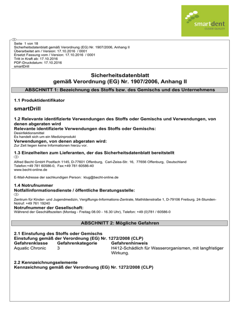 Seite 1 von 18 Sicherheitsdatenblatt gemäß Verordnung (EG) Nr. 1907/2006, Anhang II Überarbeitet am / Version: 17.10.2016 / 0001 Ersetzt Fassung vom / Version: 17.10.2016 / 0001 Tritt in Kraft ab: 17.10.2016 PDF-Druckdatum: 17.10.2016 smartDrill Sicherheitsdatenblatt gemäß Verordnung (EG) Nr. 1907/2006, Anhang II ABSCHNITT 1: Bezeichnung des Stoffs bzw. des Gemischs und des Unternehmens 1.1 Produktidentifikator smartDrill 1.2 Relevante identifizierte Verwendungen des Stoffs oder Gemischs und Verwendungen, von denen abgeraten wird Relevante identifizierte Verwendungen des Stoffs oder Gemischs: Desinfektionsmittel Es handelt sich um ein Medizinprodukt Verwendungen, von denen abgeraten wird: Zur Zeit liegen keine Informationen hierzu vor. 1.3 Einzelheiten zum Lieferanten, der das Sicherheitsdatenblatt bereitstellt Alfred Becht GmbH Postfach 1145, D-77601 Offenburg, Carl-Zeiss-Str. 16, 77656 Offenburg, Deutschland Telefon:+49 781 60586-0, Fax:+49 781 60586-40 www.becht-online.de E-Mail-Adresse der sachkundigen Person: klug@becht-online.de 1.4 Notrufnummer Notfallinformationsdienste / öffentliche Beratungsstelle: Zentrum für Kinder- und Jugendmedizin, Vergiftungs-Informations-Zentrale, Mathildenstraße 1, D-79106 Freiburg. 24-StundenNotruf: +49 761 19240 Notrufnummer der Gesellschaft: Während der Geschäftszeiten (Montag - Freitag 08.00 - 16.30 Uhr), Telefon: +49 (0)781 / 60586-0 ABSCHNITT 2: Mögliche Gefahren 2.1 Einstufung des Stoffs oder Gemischs Einstufung gemäß der Verordnung (EG) Nr. 1272/2008 (CLP) Gefahrenklasse Gefahrenkategorie Gefahrenhinweis Aquatic Chronic 3 H412-Schädlich für Wasserorganismen, mit langfristiger Wirkung. 2.2 Kennzeichnungselemente Kennzeichnung gemäß der Verordnung (EG) Nr. 1272/2008 (CLP) Seite 2 von 18 Sicherheitsdatenblatt gemäß Verordnung (EG) Nr. 1907/2006, Anhang II Überarbeitet am / Version: 17.10.2016 / 0001 Ersetzt Fassung vom / Version: 17.10.2016 / 0001 Tritt in Kraft ab: 17.10.2016 PDF-Druckdatum: 17.10.2016 smartDrill H412-Schädlich für Wasserorganismen, mit langfristiger Wirkung. P273-Freisetzung in die Umwelt vermeiden. EUH208-Enthält 3-Azapentan-1,5-diamin. Kann allergische Reaktionen hervorrufen. 2.3 Sonstige Gefahren Das Gemisch enthält keinen vPvB-Stoff (vPvB = very persistent, very bioaccumulative) bzw. fällt nicht unter den Anhang XIII der Verordnung (EG) 1907/2006 (< 0,1 %). Das Gemisch enthält keinen PBT-Stoff (PBT = persistent, bioaccumulative, toxic) bzw. fällt nicht unter den Anhang XIII der Verordnung (EG) 1907/2006 (< 0,1 %). ABSCHNITT 3: Zusammensetzung/Angaben zu Bestandteilen 3.1 Stoff n.a. 3.2 Gemisch Quaternäre Ammoniumverbindungen, Benzyl-C12-18alkyldimethyl-, Chloride Registrierungsnr. (REACH) Index EINECS, ELINCS, NLP CAS % Bereich Einstufung gemäß der Verordnung (EG) Nr. 1272/2008 (CLP) 3-Azapentan-1,5-diamin Registrierungsnr. (REACH) Index EINECS, ELINCS, NLP CAS % Bereich Einstufung gemäß der Verordnung (EG) Nr. 1272/2008 (CLP) N-(3-Aminopropyl)-N-dodecylpropan-1,3-diamin Registrierungsnr. (REACH) Index EINECS, ELINCS, NLP CAS % Bereich Einstufung gemäß der Verordnung (EG) Nr. 1272/2008 (CLP) ---269-919-4 68391-01-5 0,1-<1 Acute Tox. 4, H302 Skin Corr. 1B, H314 Aquatic Acute 1, H400 (M=10) Aquatic Chronic 1, H410 (M=1) 01-2119473793-27-XXXX 612-058-00-X 203-865-4 111-40-0 0,1-<1 Acute Tox. 4, H302 Acute Tox. 4, H312 Skin Corr. 1B, H314 Skin Sens. 1, H317 Acute Tox. 2, H330 STOT SE 3, H335 ---219-145-8 2372-82-9 0,1-<1 Acute Tox. 3, H301 STOT RE 2, H373 Aquatic Acute 1, H400 (M=10) Aquatic Chronic 1, H410 (M=1) Skin Corr. 1A, H314 Seite 3 von 18 Sicherheitsdatenblatt gemäß Verordnung (EG) Nr. 1907/2006, Anhang II Überarbeitet am / Version: 17.10.2016 / 0001 Ersetzt Fassung vom / Version: 17.10.2016 / 0001 Tritt in Kraft ab: 17.10.2016 PDF-Druckdatum: 17.10.2016 smartDrill Tridecylamin, verzweigt und linear Registrierungsnr. (REACH) Index EINECS, ELINCS, NLP CAS % Bereich Einstufung gemäß der Verordnung (EG) Nr. 1272/2008 (CLP) 01-2119461722-40-XXXX --289-185-9 86089-17-0 0,01-<0,1 Acute Tox. 4, H302 Skin Corr. 1B, H314 Aquatic Acute 1, H400 (M=10) Aquatic Chronic 1, H410 (M=10) Text der H-Sätze und Einstufungs-Kürzel (GHS/CLP) siehe Abschnitt 16. Die in diesem Abschnitt genannten Stoffe sind mit Ihrer tatsächlichen, zutreffenden Einstufung genannt! Das bedeutet bei Stoffen, welche in Anhang VI Tabelle 3.1/3.2 der Verordnung (EG) Nr. 1272/2008 (CLP-Verordnung) gelistet sind, wurden alle evtl. dort genannten Anmerkungen für die hier genannte Einstufung berücksichtigt. ABSCHNITT 4: Erste-Hilfe-Maßnahmen 4.1 Beschreibung der Erste-Hilfe-Maßnahmen Einatmen Person Frischluft zuführen und je nach Symptomatik Arzt konsultieren. Hautkontakt Mit Wasser und Seife gründlich waschen. Verunreinigte, getränkte Kleidungsstücke entfernen. Augenkontakt Kontaktlinsen entfernen. Mit viel Wasser mehrere Min. gründlich spülen, falls nötig, Arzt aufsuchen. Verschlucken Mund gründlich mit Wasser spülen. Viel Wasser zu trinken geben, sofort Arzt aufsuchen. 4.2 Wichtigste akute und verzögert auftretende Symptome und Wirkungen Falls zutreffend sind verzögert auftretende Symptome und Wirkungen in Abschnitt 11. zu finden bzw. bei den Aufnahmewegen unter Abschnitt 4.1. In bestimmten Fällen kann es vorkommen, dass die Vergiftungssymptome erst nach längerer Zeit/nach mehreren Stunden auftreten. 4.3 Hinweise auf ärztliche Soforthilfe oder Spezialbehandlung n.g. ABSCHNITT 5: Maßnahmen zur Brandbekämpfung 5.1 Löschmittel Geeignete Löschmittel Auf Umgebungsbrand abstimmen. Wassersprühstrahl/alkoholbest. Schaum/CO2/Trockenlöschmittel Ungeeignete Löschmittel Keine bekannt 5.2 Besondere vom Stoff oder Gemisch ausgehende Gefahren Im Brandfall können sich bilden: Kohlenoxide Stickoxide Chlorwasserstoff Giftige Gase 5.3 Hinweise für die Brandbekämpfung Explosions- und Brandgase nicht einatmen. Umluftunabhängiges Atemschutzgerät. Seite 4 von 18 Sicherheitsdatenblatt gemäß Verordnung (EG) Nr. 1907/