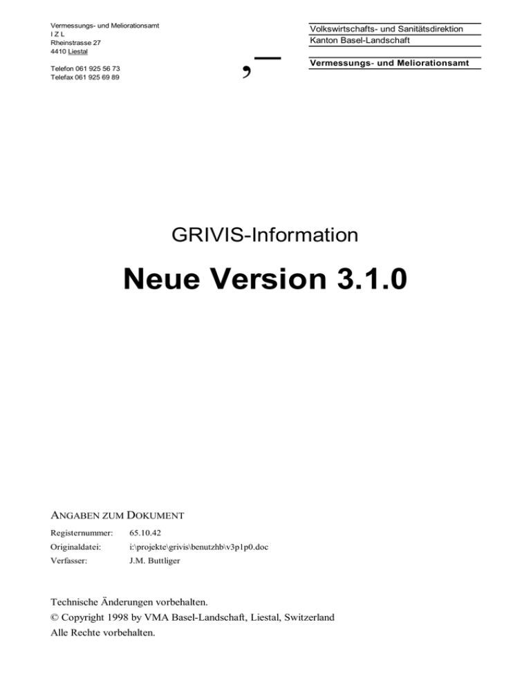,− Vermessungs- und Meliorationsamt IZL Rheinstrasse 27 4410 Liestal Telefon 061 925 56 73 Telefax 061 925 69 89 Volkswirtschafts- und Sanitätsdirektion Kanton Basel-Landschaft Vermessungs- und Meliorationsamt GRIVIS-Information Neue Version 3.1.0 ANGABEN ZUM DOKUMENT Registernummer: 65.10.42 Originaldatei: i:\projekte\grivis\benutzhb\v3p1p0.doc Verfasser: J.M. Buttliger Technische Änderungen vorbehalten. © Copyright 1998 by VMA Basel-Landschaft, Liestal, Switzerland Alle Rechte vorbehalten. GRIVIS Neue Version 3.1.0 Zusammenfassung Das Entwicklungsteam von GRIVIS hat sich bemüht, in der Version 3.1.0 die am häufigsten genannten Erweiterungs- und Verbesserungswünsche unserer Anwenderinnen und Anwender umzusetzen. Wir sind überzeugt, dass uns dies zu einem guten Teil gelungen ist. Im Wesentlichen wurden folgende Erweiterungen implementiert: − Der Sperrmechanismus für benachbarte Grundstücksmutationen ist aufgeweicht. − Die Erstellung der Mutationsakten erfolgt neu in der Grafikumgebung im Bearbeitungszustand. Für die Planaufbereitung wird GPLOT 3 verwendet. − Mutationstabellen können auch erstellt werden, wenn der Perimeter Löcher aufweist. − Als provisorische Grenzen werden nur noch diese Linien dargestellt, die gegenüber dem Ausgangszustand eine wirkliche geometrische Veränderung erfahren haben. Alle übrigen Grenzkanten von projektierten Grundstücken werden mit der Signatur beziehungsweise Farbe für rechtsgültige Grenzen dargestellt. − Grundstücksnummern können ausserhalb des Grundstückes liegen und auch mehrmals beschriftet werden. Sie haben nicht mehr die Funktion des Zentroids. Das Gleiche gilt auch für Flur- und Ortsnamen. − Die Grundstücksdefinitionen können im Rahmen des Konsistenztests operatsweise ausgegeben werden. − Beim Anzeigen von Reports wird automatisch der Text-Editor aufgerufen. Der Editor ist frei wählbar (Notepad, PFE). − Die alten Plot-Applikationen ”Plan-Manager”, ”Pläne plotten” und ”Planauschnitt plotten” wurden durch GPLOT 3 abgelöst. GPLOT 3 ist das universelle Plotwerkzeug für alle Schweizer GIS-Produkte auf der Basis von MGE. Die meisten Erweiterungen betreffen die Funktionalität für die Objekte der Klasse A. Dies deckt sich mit der in der Release-Planung vom Oktober 1997 definierten Strategie, wonach die Funktionalität nur noch für Objekte, die vollständig in der Datenbank gespeichert sind, nachhaltig erweitert wird. Die Verbesserung der Funktionalität für Objekte deren Geometrie in Map-Files verwaltet werden, wurde aufs Notwendigste beschränkt. Mittelfristiges Ziel ist die Verwaltung der Geometrie sämtlicher Objekte des Grunddatensatzes in der Datenbank. Daran wird in Zukunft gearbeitet. Das vorliegende Schriftstück beschreibt die Neuigkeiten der Version 3.1.0 in detaillierter Form, gibt ergänzende Hinweise zur Installation und zeigt das Vorgehen für die Migration der existierenden Datenbestände auf. © VMA Basel-Landschaft 2 Rev. 1.0, gedruckt: 2.3.99 GRIVIS Neue Version 3.1.0 Erweiterungen und Verbesserungen Datenmodell Zwecks besserer Abgleichung zur AVS mit ihren verschiedenen kantonalen Ausprägungen wurden am Datenmodell folgende Modifikationen vorgenommen: − Die Features für Hauptfassaden, Gebäudedetails und unregelmässige Brandmauern wurden der AVS entsprechend den Einzelobjekten zugewiesen. Realisiert wurde dies durch die Verknüpfung mit der Tabelle einzelobjekte. fcode Beschreibung (fname) GRIVIS-Tabelle LV mslink AV020030 2.1.2 Hauptfassade einzelobjekte 14 10038 AV020031 2.1.2 Hauptfassade (offen) einzelobjekte 14 10039 AV020040 2.1.4 Gebaeudedetail einzelobjekte 15 10040 AV020041 2.1.4 Gebaeudedetail (offen) einzelobjekte 15 10041 AV020050 2.1.5 Unregelmaess. Brandmauer einzelobjekte 15 10042 é neu! − Die Tabelle gemeinde wurde um das Attribut entstehung erweitert. − Der Tabelle grenzkanten wurde das Attribut herkunft_id beigefügt. Die AVS verlangt dieses Attribut bei den Hoheitsgrenzkanten. Bei den gewöhnlichen, rechtsgültigen Grenzkanten wird dieses Attribut von der AVS nicht berücksichtigt. − Die Tabelle vermpunkte wurde um das Attribut text_drehung ergänzt. Dieses neue Attribut erlaubt die Verwaltung der Orientierung von Punktnummernbeschriftungen. Bei der Aufbereitung der Grafik aus der Datenbank wird diese Orientierung berücksichtigt. − Die Text-Justification von Grundstücksnummern wird nun auch in der Datenbank verwaltet. Bei der Aufbereitung der Grafik aus der Datenbank wird sie berücksichtigt. − Das Datenmodell für Grundstücksnummern wurde grundlegend verändert. Nähere Angaben finden Sie dazu im Abschnitt “Mehrfachplatzierung von Grundstücksnummern” dieses Dokumentes und im Bedienungshandbuch, Kapitel 2.7. Mutationsbearbeitung Sperrmechanismus Mutationen mit tangierendem Perimeter können nun unabhängig von der Hierarchie rechtsgültig erklärt, annulliert oder wieder in den Bearbeitungszustand überführt werden. Der Sperrmechanismus ist nur noch bei überlappenden Mutationsperimetern wirksam. Falls Sie die Oracle Version 7.3.2 einsetzen, bricht der Prozess mit einer Oracle Fehlermeldung ab. In der Readme-Datei ist dazu ein ”Work-Around” beschrieben. Mit Oracle 8 taucht dieses Problem nicht auf. Beschreibungsfeld im Mutations-Manager Damit eine neue Mutationsnummer gelöst werden kann, muss nun zwingend ein Text ins Beschreibungsfeld eingegeben werden. Diese Modifikation wurde im Hinblick auf die noch zu realisierende Verknüpfungsmöglichkeit eines GRICAL-Auftrages mit einer GRIVIS-Mutation vorgenommen. © VMA Basel-Landschaft 3 Rev. 1.0, gedruckt: 2.3.99 GRIVIS Neue Version 3.1.0 Entstehung und Mutationsperimeter Die Operation Technischer Abschluss des Mutations-Managers bewirkt nun zusätzlich, dass die mut_id der Mutation allen Grundstücken des provisorischen Zustandes als Entstehung zugewiesen wird. Zudem wird der Mutationsperimeter ermittelt und in die Datenbanktabelle mut_perimeter abgespeichert. Wird die Mutation vom p