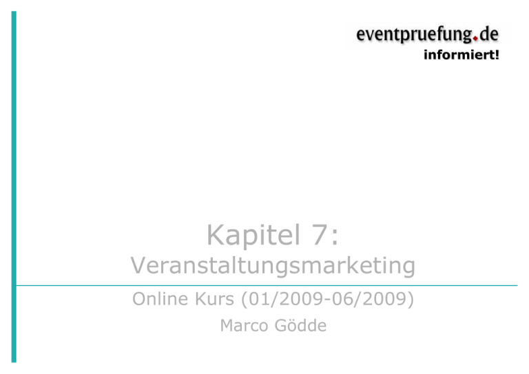 informiert! Kapitel 7: Veranstaltungsmarketing Online Kurs (01/2009-06/2009) Marco Gödde Nach „1. Einführung Eventmanagement“ (März bis Juli 2006), „2. Basics Business Event Management“ (September 2006 bis Februar 2007), „3. Basics Public Event Management“ (April bis August 2007), „4. Basics Bestuhlung“ (September bis November 2007), „5. Basics Eventmarketing Projektmanagement“ (Dezember 2007 bis Mai 2008) und „7. Eventmarketing - Briefing und Konzeption“ (Juli – Dezember 2008) folgt hier nun der Online Kurs 7 zum Thema Veranstaltungsmarketing – das Thema schließt an den Kurs 3 an. 1 Marketingkommunikation Anwendung informiert! Januar 2009 Einordnung Public Event Wir sollten uns mit MarketingKommunikationsmaßnahmen auskennen, denn das Public Event ist das Produkt. Die Marketingmaßnahmen im Marketing Mix inkl. der Marketingkommunikation dienen dazu, dieses Produkt dem Kunden näher zu bringen Wir benötigen Marketingkommunikation: Wir müssen Werbung machen, um Aufmerksamkeit für unser Produkt zu schaffen. Business-Event Wir sollten uns mit MarketingKommunikationsmaßnahmen auskennen, denn mithilfe von Eventmarketing machen wir Marketing-kommunikation für ein anderes Produkt. Das Business Event ist ein Element der Kommunikationspolitik, das gezielt eingesetzt wird, um Marketingziele zu verfolgen. Wir sind Teil der Marketingkommunikation: Wir sind Teil der Werbung, die Aufmerksamkeit für ein (anderes) Produkt schafft. Was unterscheidet Eventmarketing von Veranstaltungsmarketing? Zwar ließe sich der Begriff so auslegen, doch bedeutet Eventmarketing nicht, Marketing für eine Veranstaltung zu machen. Dies ist vielmehr die Domäne des Veranstaltungsmarketings. Veranstaltungsmarketing umfasst alle Maßnahmen, die dazu dienen, ein Live-Event am Markt zu platzieren und die Kaufbereitschaft der Kunden zu wecken. Natürlich benötigt man Veranstaltungsmarketing auch für Business-Events, und das umso mehr, wenn sich ein solches Live-Event an Endkunden richtet. Im Folgenden liegt aber der Schwerpunkt auf dem Veranstaltungsmarketing für Public Events, das heißt konkret auf den Marketingkommunikationsmaßnahmen für eine Veranstaltung. Mithilfe der Marketingkommunikation wird Aufmerksamkeit für das Produkt geschaffen. Ein wichtiger Bestandteil des Veranstaltungsmarketings sind Marketingkommunikationsmaßnahmen für ein Live-Event. Veranstaltungsmarketing für Veranstaltungskaufleute, Marco Gödde (2009), Seite 2 Fon 0700-38368776 www.eventpruefung.de info@eventpruefung.de 2 Mediaplanung/Mediamix Mediaplanung ist eine operative Marketingtätigkeit im Rahmen der Kommunikationspolitik. Sie bezeichnet den Vorgang der Buchung beziehungsweise des Einkaufs von Werbezeiten. informiert! Februar 2009 Ein Mediaplan wird auch gerne als Werbeplan bezeichnet. Mediaplanung beantwortet die Frage, zu welchen Zeiten mit welcher Frequenz Anzeigen, Werbespots und PR-Beiträge geschaltet werden. Häufig wird hierbei das Maximalprinzip angewendet (maximale Wirkung bei gegebenem Budget). Wichtige Fragen der Mediaplanung sind: − Wer soll erreicht werden? − In welchen Medien soll geworben werden? − An welcher Stelle soll in einem Medium geworben werden (Sender, Format, Titel, Platz)? − Wann soll geworben werden? − Wie lange soll geworben werden? − Mit welchen Unterbrechungen soll geworben werden? − Wie stark soll geworben werden? − Welches Budget wird benötigt? Ein wesentlicher Teil der Mediaplanung ist die Gestaltung des Mediamix, das heißt die aufeinander abgestimmte und systematische Auswahl von Werbeträgern. Werbemaßnahmen werden auf der Basis von Kosten-Nutzen-Analysen in Medien zeitlich gestaffelt und abgestimmt im Rahmen einer Werbekampagne eingesetzt. Dabei soll die größtmögliche Wirkung erzielt werden. Festgelegte Preislisten für Werbeplätze werden aufgrund der großen Zahl von Mitbewerbern (privater Rundfunk/Privatfernsehen) zumindest im TV-Geschäft kaum noch geführt. Mediaplaner suchen die passenden Medien aus und buchen die Werbeplätze zu bestmöglichen Konditionen, zum Beispiel unter Nutzung von Bündelrabattangeboten. Veranstaltungsmarketing für Veranstaltungskaufleute, Marco Gödde (2009), Seite 3 Fon 0700-38368776 www.eventpruefung.de info@eventpruefung.de informiert! 3 Werbemittel/Werbeträger − Werbeträger sind Medien, auf oder in denen Werbung geschaltet oder gedruckt wird. − Ein Werbemittel transportiert über einen Werbeträger eine Werbebotschaft zur Zielgruppe. − Werbeelemente sind die Bestandteile eines Werbemittels. Februar 2009 BEISPIELE: WERBETRÄGER − Printmedien: Zeitung/Zeitschrift (Tageszeitung, Wochenzeitung, Anzeigenblatt, Programmzeitschrift, Beilagen, Fachzeitschrift, Magazin), Katalog, Branchenbuch, Buch − Außenwerbung: Plakat, Litfaßsäule, City-Light, Verkehrsmittel − Elektronische Medien: TV (Kabel, Satellit, Bildschirmtext, Pay-TV ), Hörfunk, CD − Onlinemedien: Portale, Webseiten, Suchmaschinen, E-Commerce-Marktplätze − Sonstige Medien: Merchandisingartikel, Produkte, Verpackungen, Schaufenster, Werbegeschenke Illustrierte, Publikumszeitschrift, Im Rahmen der Mediaplanung erfolgt die Auswahl der Werbeträger zum einen durch die Intermediaselektion (Auswahl der Werbeträgerkategorien), zum andern durch die Intramediaselektion (Auswahl zwischen Werbeträger A und B). Auswahlkriterium ist die Effizienz der Zielgruppenansprache gemessen an der Reichweite, dem festgelegten Zeitrahmen und dem verfügbaren Budget. Beispiele: Werbemittel BEISPIELE: WERBEMITTEL Anzeigen und Beilagen in Printmedien, Funk- oder TV-Werbespots, Prospekte / Broschüren, Handzettel, Plakate, Displays, Sonstige Erscheinungsformen einer Werbekampagne Das Werbemittel wird im Rahmen der Mediaplanung einer Werbekampagne ausgewählt. Auswahl und Ausgestaltung der Werbemittel sind abhängig von der Zielgruppe und deren Interessen, Sprachgebrauch und Wertevorstellungen. BEISPIELE: WERBEELEMENTE: Text, Logo, Foto Veranstaltungsmarketing