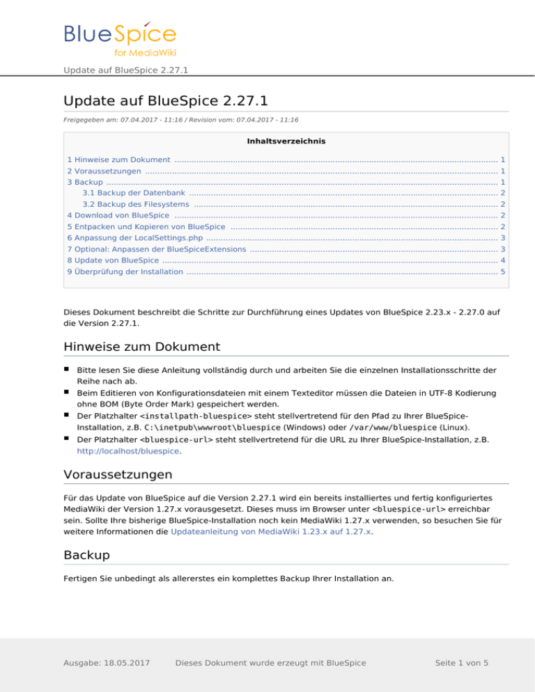 Update auf BlueSpice 2.27.1 Update auf BlueSpice 2.27.1 Freigegeben am: 07.04.2017 - 11:16 / Revision vom: 07.04.2017 - 11:16 Inhaltsverzeichnis 1 Hinweise zum Dokument ..................................................................................................................................... 1 2 Voraussetzungen ................................................................................................................................................. 1 3 Backup ................................................................................................................................................................. 1 3.1 Backup der Datenbank ............................................................................................................................... 2 3.2 Backup des Filesystems ............................................................................................................................. 2 4 Download von BlueSpice ..................................................................................................................................... 2 5 Entpacken und Kopieren von BlueSpice .............................................................................................................. 2 6 Anpassung der LocalSettings.php ........................................................................................................................ 3 7 Optional: Anpassen der BlueSpiceExtensions ...................................................................................................... 3 8 Update von BlueSpice .......................................................................................................................................... 4 9 Überprüfung der Installation ................................................................................................................................ 5 Dieses Dokument beschreibt die Schritte zur Durchführung eines Updates von BlueSpice 2.23.x - 2.27.0 auf die Version 2.27.1. Hinweise zum Dokument Bitte lesen Sie diese Anleitung vollständig durch und arbeiten Sie die einzelnen Installationsschritte der Reihe nach ab. Beim Editieren von Konfigurationsdateien mit einem Texteditor müssen die Dateien in UTF-8 Kodierung ohne BOM (Byte Order Mark) gespeichert werden. Der Platzhalter <installpath-bluespice> steht stellvertretend für den Pfad zu Ihrer BlueSpiceInstallation, z.B. C:\inetpub\wwwroot\bluespice (Windows) oder /var/www/bluespice (Linux). Der Platzhalter <bluespice-url> steht stellvertretend für die URL zu Ihrer BlueSpice-Installation, z.B. http://localhost/bluespice. Voraussetzungen Für das Update von BlueSpice auf die Version 2.27.1 wird ein bereits installiertes und fertig konfiguriertes MediaWiki der Version 1.27.x vorausgesetzt. Dieses muss im Browser unter <bluespice-url> erreichbar sein. Sollte Ihre bisherige BlueSpice-Installation noch kein MediaWiki 1.27.x verwenden, so besuchen Sie für weitere Informationen die Updateanleitung von MediaWiki 1.23.x auf 1.27.x. Backup Fertigen Sie unbedingt als allererstes ein komplettes Backup Ihrer Installation an. Ausgabe: 18.05.2017 Dieses Dokument wurde erzeugt mit BlueSpice Seite 1 von 5 Update auf BlueSpice 2.27.1 Backup der Datenbank Benutzen Sie zum Sichern Ihrer Datenbank das bordeigene Programm "mysqldump" von MySQL/MariaDB: Öffnen Sie hierzu eine Konsole, wechseln in das Verzeichnis <installpath-bluespice> und sichern Sie die Datenbank mit folgendem Befehl: mysqldump -u <username> -p --lock-tables <datenbank> > database.sql Benutzen Sie hierzu für <username> den administrativen Datenbankbenutzer (meist "root") sowie für <datenbank> den Datenbankname Ihrer MediaWiki/BlueSpice-Installation. Achten Sie unter Windows darauf, dass die Umgebungsvariablen korrekt gesetzt sind, um auf den Befehl "mysqldump" zugreifen zu können. Backup des Filesystems Sichern Sie das komplette Verzeichnis <installpath-bluespice>, das jetzt auch das Datenbankabbild beinhaltet, an einem anderen Ort auf Ihren Server. Löschen Sie anschließend aus Sicherheitsgründen umgehend die Datei <installpath-bluespice> /database.sql. Download von BlueSpice Downloaden Sie die jeweils aktuelle Version von BlueSpice direkt von Sourceforge. Das dieser Anleitung entsprechende Paket trägt den Namen BlueSpice-free-2.27.1.zip. Sollten Sie BlueSpice pro erworben haben so entfällt dieser Schritt; das entsprechende Paket bekommen Sie dann direkt vom Distributor zur Verfügung gestellt. Entpacken und Kopieren von BlueSpice Entpacken Sie das heruntergeladene Archiv von BlueSpice. Beachten Sie, dass sich die relevanten Inhalte in einem Unterordner (bspw. bluespice-free) befinden. Dieser beinhaltet folgende Dateien und Ordner: extensions settings.d skins BLUESPICE-INSTALL BLUESPICE-LICENSE BLUESPICE-RELEASE-HISTORY BLUESPICE-RELEASE-NOTES installcheck.php LocalSettings.BlueSpice.php nsfr_img_auth.php (nur BlueSpice pro) Ausgabe: 18.05.2017 Dieses Dokument wurde erzeugt mit BlueSpice Seite 2 von 5 Update auf BlueSpice 2.27.1 Verschieben Sie diese Dateien nach <installpath-bluespice> und überschreiben Sie bereits vorhandene Dateien und Ordner. Löschen Sie bitte außerdem den Ordner <installpath-bluespice> /extensions/BlueSpiceDistribution, sofern dieser noch aus einer alten BlueSpice-Installation vorhanden ist. Anpassung der LocalSettings.php Öffnen Sie die Datei <installpath-bluespice>/LocalSettings.php. Suchen Sie darin folgende Zeilen: # End of automatically generated settings. # Add more configuration options below. Löschen Sie alle nachfolgenden Zeilen. Sollten Sie an dieser Stelle - abgesehen von den aus der alten Installationsanleitung geschilderten Schritte - weitere Konfigurationen selbstständig vorgenommen haben, so behalten Sie diese zusätzlichen Konfigurationen in jedem Fall bei. Fügen Sie anschließend ganz am Ende der LocalSettings.php folgende Zeile ein: require_once "$IP/LocalSettings.BlueSpice.php"; Speichern und schließen Sie die Da