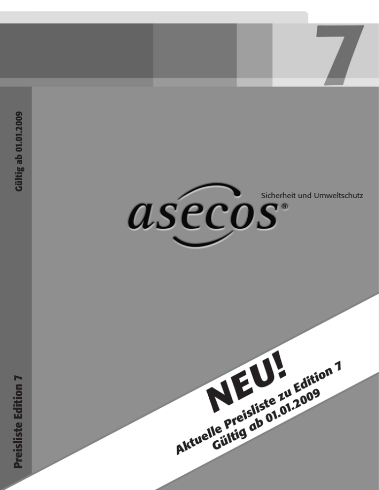 Gültig ab 01.01.2009 Preisliste Edition 7 Sicherheit und Umweltschutz ! U E 7 n io t i d E zu 009 e st 01.2 i l eis b 01. r P a e l l ltig e tu Gü k A N Editorial Sehr geehrte Damen und Herren, mit asecos Produkten sind Sie am Puls der Zeit. Unsere Produkte bieten beim Umgang mit Gefahrstoffen hohen Bedienkomfort und größtmöglichen Schutz. Bahnbrechende Technologien und der Einsatz hochwertiger Rohstoffe ermöglichen die Herstellung von Qualitätsprodukten erster Güte. Im vergangenen Jahr ist es uns trotz turbulenter Preisentwicklungen im Energie- und Rohstoffmarkt gelungen, die Preise konstant zu halten. Da wir jedoch auch in Zukunft einen unverändert hohen Qualitätsstandard gewährleisten möchten, passen wir unsere Preise an. Ab dem 01.01.2009 gelten für alle Artikel des Kataloges Edition 7 die nachfolgend genannten Preise. Die durch asecos nicht zu beeinflussende Preisentwicklung aller Rohstoffmärkte insbesondere Stahlindustrie, Rohölentwicklung, Energiebereiche etc. führt leider dazu, dass wir unsere aktuellen Verkaufspreise vorbehaltlich der zukünftigen Rohstoffentwicklung auslegen müssen. Somit behalten wir uns generell eine nachträgliche, der Entwicklung des Marktgeschehens notwendige Preisanpassung vor. Wir hoffen auf Ihr Verständnis und freuen uns schon auf eine erfolgreiche Zusammenarbeit mit Ihnen! Günther Rossdeutscher Michael Schrems Geschäftsführende Gesellschafter asecos GmbH Stand: 10/2008 2 Preisliste Edition 7 Gültig ab 01.01.2009 Artikelnummer Preis Katalogseite Artikelnummer Preis Katalogseite A.11314 A07 A.11315 A08 A.11317 A07 A.11318 A08 A.11319 A07 A.11326 A11 A.11327 A11 A.11347 A08 A.11365 C05 A.13093 C05 A.13094 C10 A.13095 C10 A.13096 C05 A.13097 C10 A.13098 C06 A.13101 C10 A.13102 C10 A.14367 A10 A.14369 A30 A.14370 A18 A.14394 A40 A.14394-3 A28 A.14405 A06 A.14406 A05 A.14407 A05 A.14408 A08 A.14409 A08 A.14410 A07 A.14411 A11 A.14412 A11 A.14413 A10 A.14414 A11 A.14415 A10 A.14416 A09 A.14532 A10 A.9901 C06 A.9902 C06 A.9903 C07 A.9904 C06 A.9905 C12 A.9906 A25 A.9906-3 A22 A.9908 C12 A.9909 C12 A.9910 A09 A.9913 A07 A.9914 A08 A.9915 A06 A.9916 A11 A.9917 A08 A.9918 A09 A.9919 A07 A.9930 A10 A.9931 A08 A.9932 A11 A.9933 A08 A.9934 A11 A.9936 A09 A.9937 A09 A.9943 A10 A.9944 A08 A.9949 A09 A.9950 A09 A.9951 A11 A.9953 A11 A.9954 A10 A.9956 A30 A.9956-3 A27 APA.145.75 B APA.145.90 B B.10192 B07 B.11299 D03 B.11300 D05 B.11301 D03 B.11302 D04 B.11303 D04 B.11304 D04 B.11305 D04 B.11306 D06 B.11307 D05 B.11515 C08 B.11646 B09 202,191,202,191,250,111,104,168,552,235,61,90,190,52,367,70,84,74,15,24,16,40,174,186,206,95,104,121,322,334,355,83,99,110,215,515,145,621,229,46,25,64,46,101,104,227,162,224,90,157,145,227,110,161,85,99,112,185,185,88,102,196,196,111,74,112,21,52,1.506,1.537,68,597,435,591,733,794,824,979,291,335,345,98,- 274 272 274 272 276 274 272 275 282 282 282 282 282 282 283 283 283 273 281 281 280 280 278 278 278 278 278 278 279 279 279 279 279 279 281 283 283 283 283 272 280 280 272 272 277 276 277 277 277 276 276 276 273 273 273 273 272 272 272 275 275 274 274 274 275 275 280 280 168 168 295 300 300 300 300 300 300 300 300 300 266 305 B.11647 B09 B.11860 B05 B.11861 B04 B.11862 B15 B.11862 B15 B.11870 B04 B.11871 B07 B.12014 C06 B.12015 C06 B.12016 C05 B.12495 C10 B.12496 C10 B.12497 C10 B.12498 C10 B.12499 C10 B.12500 C06 B.12501 C11 B.13068 C08 B.13069 C07 B.13070 C09 B.13071 C08 B.13072 C10 B.13073 C11 B.13099 B07 B.13100 B06 B.13103 B B.13107 B10 B.13108 B B.13109 B B.13110 B20 B.13111 B20 B.13112 B15 B.13113 B20 B.13114 B20 B.13115 B20 B.13116 B20 B.13117 B12 B.13118 B12 B.13119 B15 B.13120 B15 B.13121 B20 B.13122 B20 B.13123 B10 B.13611 B25 B.14745 B07 B.14746 B07 B.14747 B06 B.14748 B08 B.14749 B08 B.14750 B07 B.14751 B10 B.14752 B08 B.14753 B06 B.14754 B05 B.14755 B04 B.14756 B04 B.14757 B05 B.14758 B05 B.14759 B05 B.14873 C07 B.8800 B08 B.8801 B08 B.8802 C07 B.8842 C07 B.8881 B30 B.8882 B25 B.8943 C06 B.8944 C06 B.8945 C05 B.8946 C05 B.8947 C05 B.8948 C04 B.8949 C06 B.8950 C06 B.8951 C05 B.8952 C04 B.8953 C04 B.8954 C03 B.9200-R B09 B.9201-R B08 B.9202-R B08 B.9203-R B05 98,184,378,18,18,183,92,62,63,75,247,298,295,51,45,119,114,389,448,429,491,133,130,440,94,161,1.531,118,54,16,21,28,17,17,19,19,47,47,35,35,16,21,63,20,139,146,168,122,133,155,38,54,168,219,251,260,219,238,294,121,77,98,99,121,25,28,183,201,242,226,246,275,279,330,402,334,374,453,80,87,104,167,- 305 294 294 294 294 295 295 298 298 298 266 266 266 266 266 266 266 266 266 266 266 266 266 289 289 289 289 289 289 309 309 309 309 309 309 309 309 309 309 309 309 309 309 293 296 296 296 296 296 296 296 296 297 297 297 297 297 297 297 302 304 304 304 302 293 293 298 298 298 298 298 298 299 299 299 299 299 299 303 303 303 303 3 Gültig ab 01.01.2009 Preisliste Edition 7 Artikelnummer Preis B.9204-R B09 72,B.9205-R B08 83,B.9206-R B05 149,B.9207-R B06 89,B.9208-R B07 98,B.9209-R B06 148,B.9210 B06 56,B.9211 B06 69,B.9879 nicht mehr lieferbar! B.9880 nicht mehr lieferbar! B.9881 nicht mehr lieferbar! B.9882 nicht mehr lieferbar! B.9883 nicht mehr lieferbar! B.9884 nicht mehr lieferbar! B.9885 C12 19,B.9886 C12 19,B.9887 C10 32,B.9888 C10 31,B.K.2634 B15 18,B.K.2634 B15 18,B.K.2635 B07 81,B.K.2635-R B07 81,B.K.2636 B07 92,B.K.2636-R B07 92,B.K.2637 B04 150,B.K.2638 B04 185,B.K.2639 B04 170,B.K.2639-R B04 170,B.K.2640 B04 189,B.K.2640-R B04 189,B.K.2750 B08 67,B.K.2750-R B08 67,B.K.2751 B08 72,B.K.2751-R B08 72,B.K.2752 B07 77,B.K.2752-R B07 77,B.K.2915 B09 76,B.K.2916 B09 83,B.K.2917 B09 86,B.L.2628-R B10 54,B.L.2629 B10 47,B.L.2629-R B10 47,B.L.2630 B10 47,B.L.2630-R B10 47,B.L.2631 B10 50,B.L.2631-R B10 50,B.L.2632 B11 52,B.L.2632-R B11 52,B.L.2633 B10 56,B.L.2633-R B10 56,B.L.2747 B09 57,B.L.2747-R B09 57,B.L.2748 B09 60,B.L.2748-R B09 60,B.L.2749 B08 67,B.L.2749-R B08 67,B.L.2753 B13 43,B.L.2754 B13 46,B.L.2755 B10 56,B.L.2755-R B10 56,B.L.2756 B09 71,B.L.2756-R B09 71,B.L.2757 B06 78,B.L.2761 nicht mehr lieferbar! B.L.2762 nicht mehr lieferbar! B.L.2763 ni
