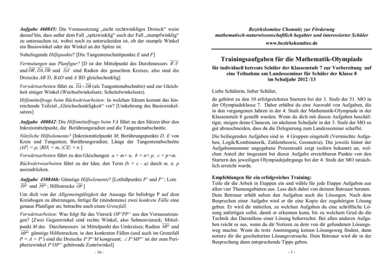 Aufgabe 460845: Die Voraussetzung „nicht rechtwinkliges Dreieck“ weist darauf hin, dass außer dem Fall „spitzwinklig“ auch der Fall „stumpfwinklig“ zu untersuchen ist, wobei noch zu unterscheiden ist, ob der stumpfe Winkel ein Basiswinkel oder der Winkel an der Spitze ist. Naheliegende Hilfspunkte? [Die Tangentenschnittpunkte E und F] Bezirkskomitee Chemnitz zur Förderung mathematisch-naturwissenschaftlich begabter und interessierter Schüler www.bezirkskomitee.de Trainingsaufgaben für die Mathematik-Olympiade Vermutungen aus Planfigur? [D ist der Mittelpunkt des Durchmessers B ' A' und DB ', DA, DB und DA' sind Radien des gesuchten Kreises, also sind die Dreiecke AB’D, BAD und A’BD gleichschenklig] für individuell betreute Schüler der Klassenstufe 7 zur Vorbereitung auf eine Teilnahme am Landesseminar für Schüler der Klasse 8 im Schuljahr 2012 /13 Vorwärtsarbeiten führt zu DA DB (als Tangentenabschnitte) und zur Gleichheit einiger Winkel (Wechselwinkelsatz, Scheitelwinkelsatz). Liebe Schülerin, lieber Schüler, Hilfsmittelfrage beim Rückwärtsarbeiten: In welchen Sätzen kommt das hinreichende Teilziel „Gleichschenkligkeit“ vor? [Umkehrung des Basiswinkelsatzes] Aufgabe 400842: Die Hilfsmittelfrage beim VA führt zu den Sätzen über den Inkreismittelpunkt, die Berührungsradien und die Tangentenabschnitte. Nützliche Hilfselemente? [Inkreismittelpunkt M; Berührungspunkte D, E von Kreis und Tangenten; Berührungsradien; Länge der Tangentenabschnitte |AF| = p, |BD| = m, |CE| = n ] Vorwärtsarbeiten führt zu den Gleichungen a = m+ n, b = n+ p, c = p+m. Rückwärtwsarbeiten führt zu der Idee, den Term (b + c - a) durch m, n, p auszudrücken. Aufgabe 450846b: Günstige Hilfselemente? [Lotfußpunkte P’ und P“; Lote PP ' und PP" ; Hilfsstrecke OP ] Um dich von der Allgemeingültigkeit der Aussage für beliebige P auf dem Kreisbogen zu überzeugen, fertige für (mindestens) zwei konkrete Fälle eine genaue Planfigur an; betrachte auch einen Grenzfall. Vorwärtsarbeiten: Was folgt für das Viereck OP’PP“ aus den Voraussetzungen? [Zwei Gegenwinkel sind rechte Winkel, also Sehnenviereck; Mittelpunkt M des Durchmessers ist Mittelpunkt des Umkreises; Radien MP ' und MP " günstige Hilfsstrecken; in den konkreten Fällen (und auch im Grenzfall P = A = P’) sind die Dreiecke P’P“M kongruent; P’MP“ ist der zum Peripheriewinkel P’OP“ gehörende Zentriwinkel] - 16 - du gehörst zu den 10 erfolgreichsten Startern bei der 3. Stufe der 51. MO in der Olympiadeklasse 7. Daher erhältst du eine Auswahl von Aufgaben, die in den vergangenen Jahren in der 4. Stufe der Mathematik-Olympiade in der Klassenstufe 8 gestellt wurden. Wenn du dich mit diesen Aufgaben beschäftigst, steigen deine Chancen, im nächsten Schuljahr in der 3. Stufe der MO so gut abzuschneiden, dass du die Delegierung zum Landesseminar schaffst. Die beiliegenden Aufgaben sind in 4 Gruppen eingeteilt (Vermischte Aufgaben, Logik/Kombinatorik, Zahlentheorie, Geometrie). Die jeweils hinter der Aufgabennummer angegebene Prozentzahl zeigt (sofern bekannt) an, welchen Anteil der insgesamt bei dieser Aufgabe erreichbaren Punkte von den Startern des jeweiligen Olympiadejahrgangs bei der 4. Stufe der MO tatsächlich erreicht wurde. Empfehlungen für ein erfolgreiches Training: Teile dir die Arbeit in Etappen ein und wähle für jede Etappe Aufgaben aus allen vier Themengebieten aus. Lass dich dabei von deinem Betreuer beraten. Dein Betreuer erhält neben den Aufgaben auch die Lösungen. Nach dem Besprechen einer Aufgabe wird er dir eine Kopie der zugehörigen Lösung geben. Er wird dir mitteilen, zu welchen Aufgaben du eine schriftliche Lösung anfertigen sollst, damit er erkennen kann, bis zu welchem Grad du die Technik des Darstellens einer Lösung beherrschst. Bei allen anderen Aufgaben reicht es aus, wenn du dir Notizen zu dem von dir gefundenen Lösungsweg machst. Wenn du trotz Anstrengung keinen Lösungsweg findest, dann notiere dir die gescheiterten Lösungsversuche. Dein Betreuer wird dir in der Besprechung dann entsprechende Tipps geben. -1- Damit du den Überblick über die bereits bearbeiteten Aufgaben behältst, kannst du in der Übersicht immer ankreuzen, welche Aufgabe du schon bearbeitet hast und welche Lösungen bereits besprochen wurden. Wir wünschen dir beim Rechnen und Knobeln viel Erfolg und Freude! Aufgabennummer 440845 450844 490841 420841 450843 430841 440841 390845 470841 410844 400843 400844 460844 440842 410845 450842 440844 450845 420844 430844 410843 460845 400842 450846 490844 470842 Aufgabe bearbeitet Lösung besprochen 89% 75% 87% 75% 70% 65% 64% 57% Notizen Aufgabe 470842 Es sei ABCD ein konvexes Viereck, dessen Diagonalen AC und BD einander in einem Punkt S schneiden. Es sei E derjenige Punkt, der auf derselben Seite der Geraden AB liegt wie die Punkte C und D und für den ABE ein gleichseitiges Dreieck ist. Ferner gelte: (1) Die Größe des Winkels CBD beträgt 10°. (2) Die Größe des Winkels CAD beträgt 20°. (3) Die Größe des Winkels DBA beträgt 40°. (4) Die Größe des Winkels BAC beträgt 50°. a) Berechne die Größe des Winkels AEC. b) Berechne die Größen der Innenwinkel des Vierecks ABCD. ______________________________________________________________ Hinweise zur Lösungsfindung Aufgabe 420844: Naheliegende Hilfslinien? [Radien AM und BM ] 88% 76% 73% 70% 69% 72% 68% 67% 62% 83% 67% 67% 57% 56% 56% Welche Vermutungen lassen sich einer genau gezeichneten Planfigur entnehmen? [Kongruenz der Dreiecke ASD und BSC; Gleichschenkligkeit der Dreiecke ABS und DAM] Hilfsmittelfrage beim Vorwärtsarbeiten: In welchen Sätzen kommen die gegebenen Voraussetzungen vor? [Sätze über Winkel im Kreis: Peripheriewinkelsatz, Peripheriezentriwinkelsatz. Sätze über Dreiecke: Basiswinkelsatz, Innenwinkelsatz, Außenwinkelsatz] Rückwärtsarbeiten: Woraus lässt sich unmittelbar berechnen? [Aus dem Zentriwinkel DMA, da das Dreieck DMA gleichschenklig ist.] Woraus läs