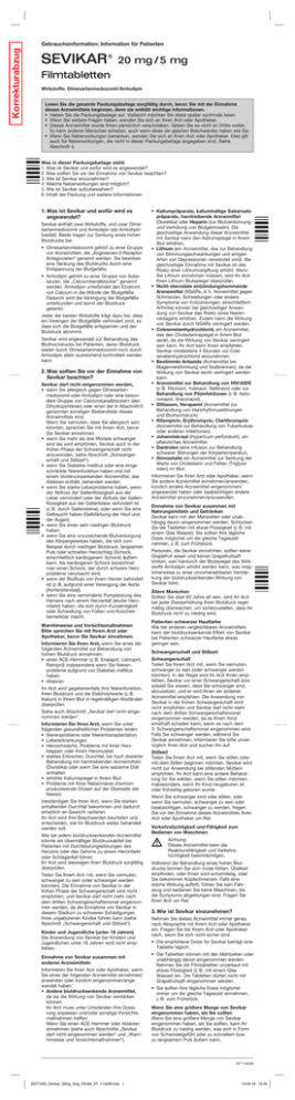 Korrekturabzug Gebrauchsinformation: Information für Patienten SEVIKAR® 20 mg / 5 mg Filmtabletten Wirkstoffe: Olmesartanmedoxomil /Amlodipin Lesen Sie die gesamte Packungsbeilage sorgfältig durch, bevor Sie mit der Einnahme dieses Arzneimittels beginnen, denn sie enthält wichtige Informationen. • Heben Sie die Packungsbeilage auf. Vielleicht möchten Sie diese später nochmals lesen. • Wenn Sie weitere Fragen haben, wenden Sie sich an Ihren Arzt oder Apotheker. • Dieses Arzneimittel wurde Ihnen persönlich verschrieben. Geben Sie es nicht an Dritte weiter. Es kann anderen Menschen schaden, auch wenn diese die gleichen Beschwerden haben wie Sie. • Wenn Sie Nebenwirkungen bemerken, wenden Sie sich an Ihren Arzt oder Apotheker. Dies gilt auch für Nebenwirkungen, die nicht in dieser Packungsbeilage angegeben sind. Siehe Abschnitt 4. Was in dieser Packungsbeilage steht: 1.Was ist Sevikar und wofür wird es angewendet? 2.Was sollten Sie vor der Einnahme von Sevikar beachten? 3.Wie ist Sevikar einzunehmen? 4.Welche Nebenwirkungen sind möglich? 5.Wie ist Sevikar aufzubewahren? 6.Inhalt der Packung und weitere Informationen 1.Was ist Sevikar und wofür wird es angewendet? Sevikar enthält zwei Wirkstoffe, und zwar Olme­ sartanmedoxomil und Amlodipin (als Amlodipin­ besilat). Beide tragen zur Senkung eines hohen Blutdrucks bei. • O lmesartanmedoxomil gehört zu einer Gruppe­ von Arzneimitteln, die „Angiotensin-II-RezeptorAntagonisten“ genannt werden. Sie bewirken eine Senkung des Blutdrucks durch eine Entspannung der Blutgefäße. • Amlodipin gehört zu einer Gruppe von Subs­ tanzen, die „Calciumkanalblocker“ genannt werden. Amlodipin unterbindet den Einstrom von Calcium in die Wände der Blutgefäße. Dadurch wird die Verengung der Blutgefäße unterbunden und somit der Blutdruck gesenkt. Jeder der beiden Wirkstoffe trägt dazu bei, dass ein Verengen der Blutgefäße verhindert wird, so dass sich die Blutgefäße entspannen und der Blutdruck abnimmt. Sevikar wird angewendet zur Behandlung des Bluthochdrucks bei Patienten, deren Blutdruck weder durch Olmesartanmedoxomil noch durch Amlodipin allein ausreichend kontrolliert werden kann. 2.Was sollten Sie vor der Einnahme von Sevikar beachten? Sevikar darf nicht eingenommen werden, • wenn Sie allergisch gegen Olmesartan­ medoxomil oder Amlodipin oder eine beson­ dere Gruppe von Calciumkanalblockern (den Dihydropyridinen) oder einen der in Abschnitt 6 genannten sonstigen Bestandteile dieses Arzneimittels sind. Wenn Sie vermuten, dass Sie allergisch sein könnten, sprechen Sie mit Ihrem Arzt, bevor Sie Sevikar einnehmen. • wenn Sie mehr als drei Monate schwanger sind (es wird empfohlen, Sevikar auch in der frühen Phase der Schwangerschaft nicht anzuwenden, siehe Abschnitt „Schwanger­ schaft und Stillzeit“). • wenn Sie Diabetes mellitus oder eine einge­ schränkte Nierenfunktion haben und mit einem blutdrucksenkenden Arzneimittel, das Aliskiren enthält, behandelt werden. • wenn Sie starke Leberprobleme haben, wenn der Abfluss der Gallenflüssigkeit aus der Leber vermindert oder der Abfluss der Gallen­ flüssigkeit aus der Gallenblase verhindert ist (z. B. durch Gallensteine), oder wenn Sie eine Gelbsucht haben (Gelbfärbung der Haut und der Augen). • wenn Sie einen sehr niedrigen Blutdruck haben. • wenn Sie eine unzureichende Blutversorgung des Körpergewebes haben, die sich zum Beispiel durch niedrigen Blutdruck, langsamen Puls oder schnellen Herzschlag (Schock, einschließlich kardiogenem Schock) äußern kann. Als kardiogenen Schock bezeichnet man einen Schock, der durch schwere Herz­ probleme verursacht wird. • w enn der Blutfluss von Ihrem Herzen behindert ist (z. B. aufgrund einer Verengung der Aorta [Aortenstenose]). • wenn Sie eine verminderte Pumpleistung des Herzens nach einem Herzanfall (akuter Herz­ infarkt) haben, die sich durch Kurzatmigkeit oder Schwellung von Füßen und Knöcheln bemerkbar macht. Warnhinweise und Vorsichtsmaßnahmen Bitte sprechen Sie mit Ihrem Arzt oder ­Apotheker, bevor Sie Sevikar einnehmen. Informieren Sie Ihren Arzt, wenn Sie eines der folgenden Arzneimittel zur Behandlung von hohem Blutdruck einnehmen: • einen ACE-Hemmer (z. B. Enalapril, Lisinopril, Ramipril) insbesondere wenn Sie Nieren­ probleme aufgrund von Diabetes mellitus haben. • Aliskiren Ihr Arzt wird gegebenenfalls Ihre Nierenfunktion, Ihren Blutdruck und die Elektrolytwerte (z. B. Kalium) in Ihrem Blut in regelmäßigen Abständen­ überprüfen. Siehe auch Abschnitt „Sevikar darf nicht einge­ nommen werden“. Informieren Sie Ihren Arzt, wenn Sie unter folgenden gesundheitlichen Problemen leiden: • Nierenprobleme oder Nierentransplantation • Lebererkrankungen • Herzschwäche, Probleme mit Ihren Herz­ klappen oder Ihrem Herzmuskel • s tarkes Erbrechen, Durchfall, bei hoch dosierter Behandlung mit harntreibenden Arzneimitteln (Diuretika) oder wenn Sie eine salzarme Diät einhalten • erhöhte Kaliumspiegel in Ihrem Blut • Probleme mit Ihren Nebennieren (hormon­ produzierende Drüsen auf der Oberseite der Nieren) Verständigen Sie Ihren Arzt, wenn Sie starken anhaltenden Durchfall bekommen und dadurch erheblich an Gewicht verlieren. Ihr Arzt wird Ihre Beschwerden beurteilen und entscheiden, wie Ihr Blutdruck weiter behandelt werden soll. Wie bei jedem blutdrucksenkenden Arzneimittel könnte ein übermäßiger Blutdruckabfall bei Patienten mit Durchblutungsstörungen des Herzens oder des Gehirns zu einem Herzinfarkt oder Schlaganfall führen. Ihr Arzt wird deswegen Ihren Blutdruck sorgfältig überprüfen. Teilen Sie Ihrem Arzt mit, wenn Sie vermuten, schwanger zu sein (oder schwanger werden könnten). Die Einnahme von Sevikar in der frühen Phase der Schwangerschaft wird nicht empfohlen, und Sevikar darf nicht mehr nach dem dritten Schwangerschaftsmonat eingenom­ men werden, da die Einnahme von Sevikar in diesem Stadium zu schweren Schädigungen Ihres ungeborenen Kindes f