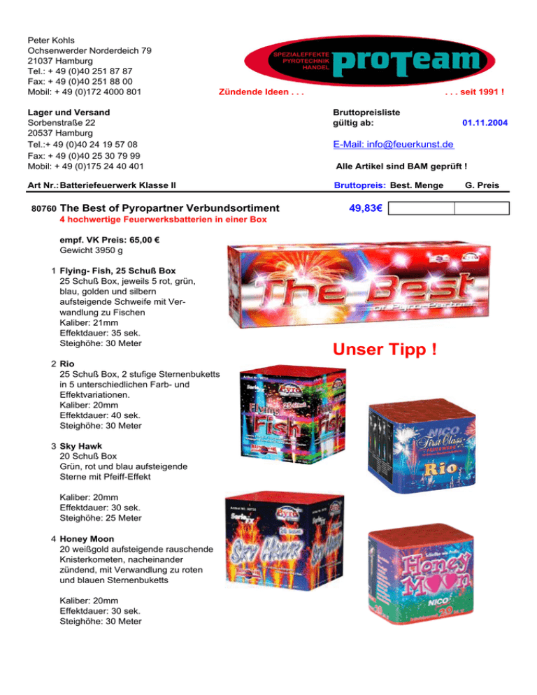 Peter Kohls Ochsenwerder Norderdeich 79 21037 Hamburg Tel.: + 49 (0)40 251 87 87 Fax: + 49 (0)40 251 88 00 Mobil: + 49 (0)172 4000 801 Zündende Ideen . . . . . . seit 1991 ! Lager und Versand Sorbenstraße 22 20537 Hamburg Tel.:+ 49 (0)40 24 19 57 08 Fax: + 49 (0)40 25 30 79 99 Mobil: + 49 (0)175 24 40 401 Bruttopreisliste gültig ab: Art Nr.:Batteriefeuerwerk Klasse II Bruttopreis: Best. Menge 01.11.2004 E-Mail: info@feuerkunst.de Alle Artikel sind BAM geprüft ! EK Netto 80760 The Best of Pyropartner Verbundsortiment 4 hochwertige Feuerwerksbatterien in einer Box 49,83€ 24,00 € empf. VK Preis: 65,00 € Gewicht 3950 g 1 Flying- Fish, 25 Schuß Box 25 Schuß Box, jeweils 5 rot, grün, blau, golden und silbern aufsteigende Schweife mit Verwandlung zu Fischen Kaliber: 21mm Effektdauer: 35 sek. Steighöhe: 30 Meter 2 Rio 25 Schuß Box, 2 stufige Sternenbuketts in 5 unterschiedlichen Farb- und Effektvariationen. Kaliber: 20mm Effektdauer: 40 sek. Steighöhe: 30 Meter 3 Sky Hawk 20 Schuß Box Grün, rot und blau aufsteigende Sterne mit Pfeiff-Effekt Kaliber: 20mm Effektdauer: 30 sek. Steighöhe: 25 Meter 4 Honey Moon 20 weißgold aufsteigende rauschende Knisterkometen, nacheinander zündend, mit Verwandlung zu roten und blauen Sternenbuketts Kaliber: 20mm Effektdauer: 30 sek. Steighöhe: 30 Meter Unser Tipp ! Kalkupreis G. Preis 49,83€ Best. Menge 99001 Montreal Festival 6er Raketen "" First Class Product "" 6er Raketen-Abschußständer, nacheinander zündend, mit verschiedenen Effekten Kaliber: 28mm Effektdauer: 30 sek. Steighöhe: 90 Meter 13,22€ 6,00 € G. Preis 13,22€ Unser Tipp ! empf. VK Preis: 22,80 Euro Gewicht 1680 g 80761 Brillant Verbundsortiment 3 tolle Verbund- Feuerwerksartikel im Klarsichtbeutel empf. VK Preis: 29,95 Euro Gewicht 1596 g 1 Flamenco 12 Schuss, nacheinander zündende 3er Sternenbündel mit Schweif, rotem, grünen und silbernen Knattersternen Kaliber: 18mm Effektdauer: 30 sek. Steighöhe: 30 Meter 2 Sunshine 16 rot oder gold aufsteigende Doppelsterne, nacheinander zündend, mit blauer oder grüner Verwandlung Kaliber: 20mm Effektdauer: 30 sek. Steighöhe: 45 Meter 3 Kapriolen 100 weißgold aufsteigende Blinksterne, nacheinander zündend; mit Crackling-Effekt 80721 Vulkan - Royal Riesenvulkan Riesenvulkan mit versch. Farbeffekten 19,93€ 9,60 € 19,93€ 7,63€ 3,50 € 7,63€ 9,97€ 4,80 € 9,97€ Effektdauer: 60 sek. empf. VK Preis: 10,20 Euro Gewicht 743 g 99217 Roma Lichterorgel 8 Römische Lichter, nacheinander zündend, mit 120 bunten knisternden Leuchtkugeln und gleichzeitig sprühender Fontäne Kaliber: 40mm Effektdauer: 40 sek. Steighöhe: 35 Meter empf. VK Preis: 13,57 Euro Gewicht 601 g Best. Menge 5027 Sunshine 16 rot oder gold aufsteigende Doppelsterne, nacheinander zündend, mit blauer oder grüner Verwandlung Kaliber: 20mm Effektdauer: 30 sek. Steighöhe: 45 Meter G. Preis 6,26€ 3,00 € 6,26€ 20,06€ 9,45 € 20,06€ empf. VK Preis: 9,15 Euro Gewicht 750 g 80732 Wild Dragon, 64 Schuß Box 64 Schuß Box, rot, grün und blau in Salven aufsteigende Schweife mit Verwandlung zu Multicolor-Fischen mit Pfeif- und Crackling-Effekten. Kaliber: 22mm Effektdauer: 40 sek. Steighöhe: 30 Meter empf. VK Preis: 28,30 Euro Gewicht 2113 g 99502 Sydney 19 Schuß Box 19 kräftig aufsteigende Leuchtkugeln, nacheinander zündend, mit Verwandlung zu blauen Sternen und silbernen Fischen. Kaliber: 25mm Effektdauer: 30 sek. Steighöhe: 35 Meter Unser Tipp ! 18,37€ 8,80 € 18,37€ 85057 King Size 19 Schuß Box 19 Schuß Multicolor, sehr hoher Aufstieg mit lautem Knall und Fischeffekten, anschließend 4 Schuß mit Popping-Effekt Kaliber: 20mm Effektdauer: 45 sek. Steighöhe: 40 Meter empf. VK Preis: 23,70 Euro Gewicht 1740 g 15,88€ 7,40 € 15,88€ 99504 RIO 25 Schuß Box 25 Schuß Box, 2 stufige Sternenbuketts in 5 unterschiedlichen Farb- und Effektvariationen. Kaliber: 20mm Effektdauer: 40 sek. Steighöhe: 30 Meter 15,56€ 7,45 € 15,56€ empf. VK Preis: 24,15 Euro Gewicht 1499 g empf. VK Preis: 20,86 Euro Gewicht 1499 g Best. Menge 5055 Monster King 14 weißgold aufsteigende Leuchtsterne nacheinander zündend, mit Verwandlung zu geisterhaften Heultönen. Kaliber: 22 mm Effektdauer 45 sek. Steighöhe: 35 Meter empf. VK Preis: 21,70 Euro Gewicht 1330 g 5240 Peter der Große Batterie 5x5 Schuss Salvenbatterie mit anschließender Verwandlung zu Goldpalmeneffekten mit Goldregen Kaliber: 19mm Effektdauer:23 sek. Steighöhe: 40 Meter empf. VK Preis: 19,90 Euro Gewicht 1000 g 80731 Flying- Fish, 25 Schuß Box 25 Schuß Box, jeweils 5 rot, grün, blau, golden und silbern aufsteigende Schweife mit Verwandlung zu Fischen Kaliber: 21mm Effektdauer: 35 sek. Steighöhe: 30 Meter empf. VK Preis: 18,90 Euro Gewicht 1280 g 5224 Bolero / Salute 5224 5x5 Schuß Salvenbatterie mit anschließender Verwandlung zu starken Titanblitzen Kaliber: 20mm Effektdauer:25 sek. Steighöhe: 50 Meter empf. VK Preis: 19,30 Euro Gewicht 1380 g 5045 Rainbow Fire 25 Schuß Box 25 kräftig sprühend aufsteigende Silberschweif-Kreisel mit Verwandlung zum Multicolor-Bukett. Kaliber: 21mm Effektdauer: 45 sek. Steighöhe: 35 Meter empf. VK Preis: 17,86 Euro Gewicht 1160 g 16,95€ 7,90 € G. Preis 16,95€ Unser Tipp ! 13,73€ 6,40 € 13,73€ 13,95€ 6,50 € 13,95€ 13,73€ 6,4 13,73€ Unser Tipp ! 13,57€ 6,50 € 13,57€ Best. Menge 80723 Multi-Power 25 Schuß Box 25 kräftig sprühend aufsteigende Silberschweif-Kreisel mit Verwandlung zum Multicolor-Bukett. Kaliber: 21mm Effektdauer: 45 sek. Steighöhe: 35 Meter empf. VK Preis: 18,90 Euro Gewicht 1160 g 5047 Bolero 25 Schuß Box 5x5 Schuss Salvenbatterie mit anschließender Verwandlung zu Popping-Effekten. Kaliber: 20mm Effektdauer:25 sek. Steighöhe: 50 Meter G. Preis 13,95€ 6,50 € 13,95€ 14,81€ 6,90 € 14,81€ 11,80€ 5,50 € 11,80€ 11,48€ 5,50 € 11,48€ empf. VK Preis: 19,30 Euro Gewicht 1380 g 82745 Pyro Spektakel 25 Schuß Box 25 Schuß Batterie Multicolor-Effekt mit weißem Glitter Kaliber: 20