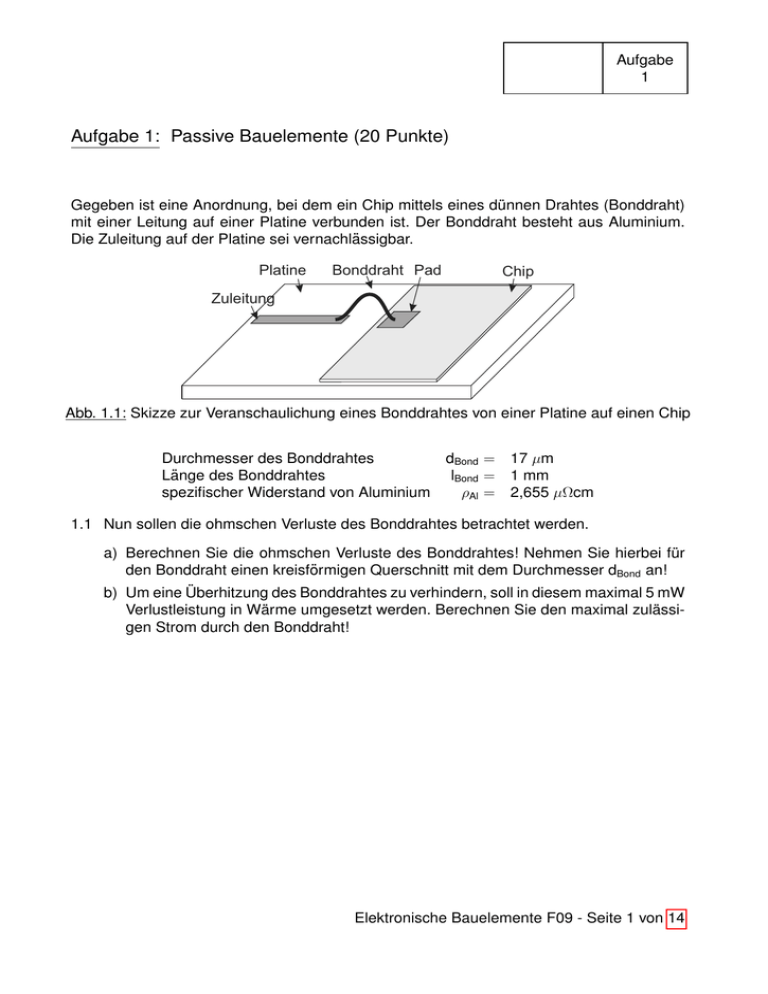 Aufgabe 1 Aufgabe 1: Passive Bauelemente (20 Punkte) Gegeben ist eine Anordnung, bei dem ein Chip mittels eines dünnen Drahtes (Bonddraht) mit einer Leitung auf einer Platine verbunden ist. Der Bonddraht besteht aus Aluminium. Die Zuleitung auf der Platine sei vernachlässigbar. Platine Bonddraht Pad Chip Zuleitung Abb. 1.1: Skizze zur Veranschaulichung eines Bonddrahtes von einer Platine auf einen Chip Durchmesser des Bonddrahtes Länge des Bonddrahtes spezifischer Widerstand von Aluminium dBond = 17 µm lBond = 1 mm ρAl = 2,655 µΩcm 1.1 Nun sollen die ohmschen Verluste des Bonddrahtes betrachtet werden. a) Berechnen Sie die ohmschen Verluste des Bonddrahtes! Nehmen Sie hierbei für den Bonddraht einen kreisförmigen Querschnitt mit dem Durchmesser dBond an! b) Um eine Überhitzung des Bonddrahtes zu verhindern, soll in diesem maximal 5 mW Verlustleistung in Wärme umgesetzt werden. Berechnen Sie den maximal zulässigen Strom durch den Bonddraht! Elektronische Bauelemente F09 - Seite 1 von 14 Aufgabe 1 1.2 Auf dem Chip endet der Bonddraht auf einem Pad. Unter dem Pad befindet sich Siliziumdioxid (SiO2 ) und darunter eine Massefläche. Nun sollen die reaktiven Einflüsse des Übergangs bei höheren Frequenzen betrachtet werden. Bonddraht Pad dSiO2 Siliziumdioxid (SiO2) Massefläche Abb. 1.2: Querschnitt durch den Chip Breite des Pads bPad = Länge des Pads lPad = Dicke des Siliziumdioxides unter dem Pad dSiO2 = relative Dielektrizitätszahl SiO2 εr,SiO2 = Dielektrizitätskonstante ε0 = Permeabilität im Vakuum µ0 = 100 µm 100 µm 6 µm 3,9 F 8, 8542 · 10−12 m H 4π · 10−7 m a) Berechnen Sie die Padkapazität zwischen dem Pad und der darunterliegenden Massefläche! Streufelder können hierbei vernachlässigt werden. b) Berechnen Sie die Induktivität der Bonddrahtes! Diese lässt sich abschätzen mit: ! ! µ0 · l 4l L= ln − 0,75 2π d c) Vervollständigen Sie das Schaltbild zu einem Ersatzschaltbild des Bondübergangs mit 3 Elementen, welches sowohl die ohmschen und induktive Wirkung des Bonddrahtes, als auch die kapazitive Wirkung des Pads beschreibt. Bennenen Sie die Elemente! Anschluss auf Chip Zuleitung auf Platine UE UA gemeinsamer Massekontakt d) Durch die reaktiven Einflüsse stellt der Übergang einen Tiefpass dar. Bestimmen Sie die Ordnung und Resonanzfrequenz fres des Tiefpasses! Hierbei können die ohmschen Verluste vernachlässigt werden. Elektronische Bauelemente F09 - Seite 2 von 14 Aufgabe 1 Zusatzblatt zur Aufgabe Elektronische Bauelemente F09 - Seite 3 von 14 Aufgabe 2 Aufgabe 2: PN-Diode (20 Punkte) n p n a) p b) n p c) Abb. 2.1: pn-Dioden für Aufgabenpunkt 2.1 2.1 Zeichnen Sie qualitativ die Raumladungszonen im thermodynamischen Gleichgewicht in die dafür vorgesehene Abbildung 2.1 jeweils für eine Diode mit einem Dotierungsprofil von a) NA = ND b) NA = 4 · ND c) ND = 2 · NA ein. Im Folgenden wird die Kapazitätsdiode aus Abbildung 2.2 untersucht. Die Spannung über der Diode beträgt 0 V. Gegeben sind die folgenden Parameter dieser Diode mit abrupten Übergang : intrinsische Dichte relative Dielektrizitätskonstante von Silizium Dielektrizitätskonstante im Vakuum Temperaturspannung Elementarladung Weite des n-/p-Gebietes Diodenfläche Kontaktwiderstand ni = 1,5 ·1010 cm−3 εr = 12 As ε0 = 8, 854 · 10−12 Vm UT = 26 mV bei T = 300 K e = 1,602 ·10−19 As xn = xp = 500 nm A = 10000 µm2 RK = 0,97 Ω 2.2 Berechnen Sie die Diffusionsspannung UD der Diode. Elektronische Bauelemente F09 - Seite 4 von 14 Aufgabe 2 ?E? 42 nm 45,75 V/µm n p xn n p x xp Abb. 2.2: pn-Diode und E-Feld über dem pn-Übergang 2.3 Berechnen Sie die Dotierstoffkonzentrationen NA und ND des p und n dotierten Gebietes der Diode. Geben Sie zusätzlich die Weiten wn und wp der Raumladungszonen innerhalb der Gebiete derhDiode i an. Geben Sie die Dotierstoffkonzentrationen in rezi1 proken Kubikzentimetern cm3 an! 2.4 Der Bahnwiderstand Rs einer pn-Diode setzt sich aus einem Widerstand Rp für das pGebiet, Rn für das n-Gebiet und einem Kontaktwiderstand RK zusammen. Bestimmen Sie mithilfe von Diagramm 2.3 die Widerstände Rp , Rn und Rs . Hinweis: Wenn Sie den Aufgabenpunkt 2.3 nicht lösen konnten, rechnen Sie mit NA = 3 · 1018 cm1 3 weiter! Vernachlässigen Sie bei diesem Aufgabenpunkt die Sperrschicht! 2.5 Berechnen Sie die Güte für die Kapazitätsdiode bei einer Frequenz von 50 MHz. Für die Güte einer Kapazitätsdiode ist nur der Bahnwiderstand und die Sperrschichtkapazität zu betrachten. Elektronische Bauelemente F09 - Seite 5 von 14 Aufgabe 2 Abb. 2.3: Ladungsträgerbeweglichkeiten in Abhängigkeit der Dotierstoffkonzentration Elektronische Bauelemente F09 - Seite 6 von 14 Aufgabe 2 Zusatzblatt zur Aufgabe Elektronische Bauelemente F09 - Seite 7 von 14 Aufgabe 3 Aufgabe 3: Bipolartransistor (20 Punkte) Ein npn-Si-Bipolartransistor wird in einer Schaltung nach Abb. 3.1 betrieben. R E = 100 Ω U0 = 5 V U E = 3,3 V UA I E = 5 mA Abb. 3.1: Ein npn-Si-Bipolartransistor in einer Grundschaltung. Von dem Transistor sind folgende Daten bekannt: Stromverstärkung Basisdotierung effektive Basisweite (im Arbeitspunkt) BN = 80 NAB = 2 · 1018 cm−3 wB = 100 nm Anmerkung: Die Emitterweite sei viel kürzer als die Löcherdiffusionslänge im Emitter A = 32 µm2 UAN = 30 V Emitterfläche Earlyspannung Außerdem ist: Elementarladung Diffusionskonstante Intrinsische Dichte bei 300 K (Silizium) Temperaturspannung bei T = 300 K e = 1, 6 · 10−19 C DnB = 35 cm2 /s ni = 1, 5 · 1010 cm−3 UT = 26 mV Der Basiswiderstand ist vernachlässigbar! 3.1 Wie heißt diese Grundschaltung des Transistors? Was ist die typische Anwendung dieser Grundschaltung? 3.2 Berechnen Sie den Transport-Sättigungsstrom des Transistors! 3.3 Berechnen Sie die Spannung UA , die sich an der Stromquelle aufbaut! Berücksichtigen Sie den Basisstrom bei der Rechnung. Der Transistor befindet sich im normal-aktiven Bereich. Ist diese Annahme richtig? 3.4 Zeichnen Sie das Kleinsignalersatzschaltbild (ESB) der Schaltung